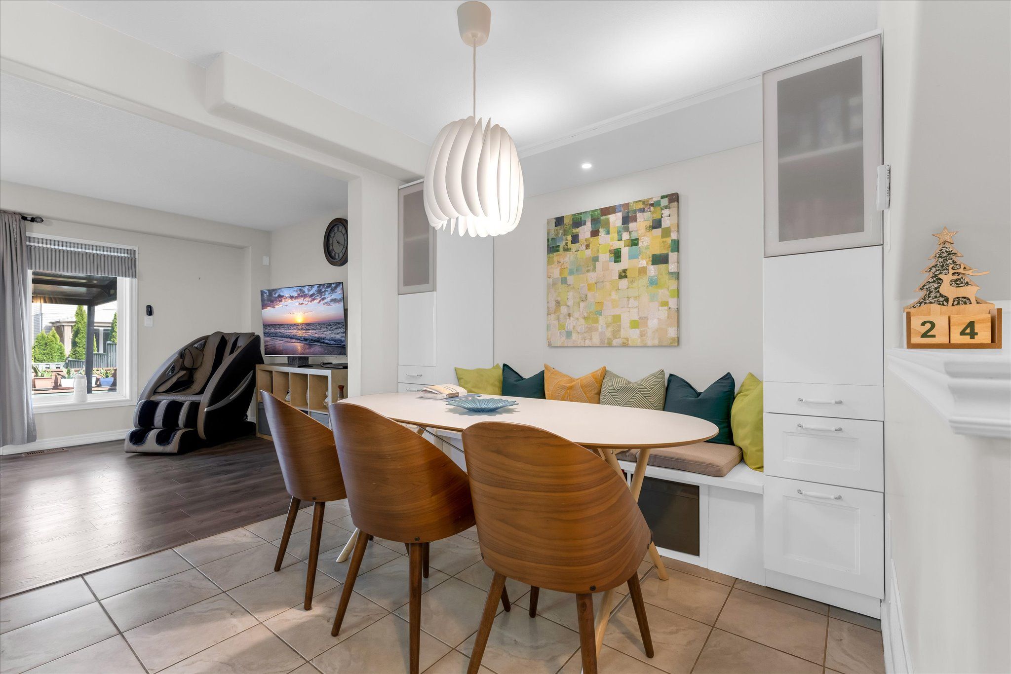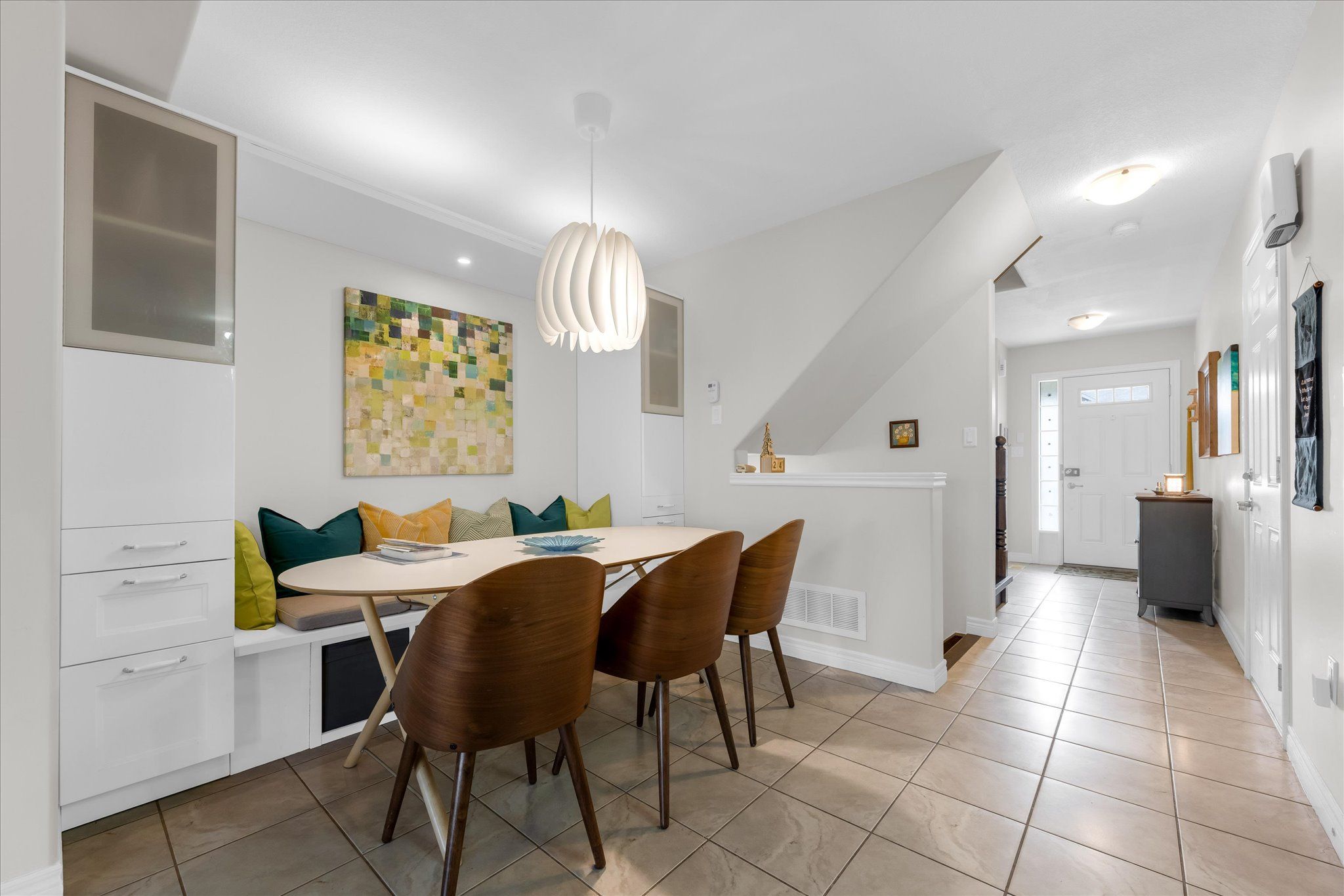 • Open-concept main floor with a custom built-in dining area.