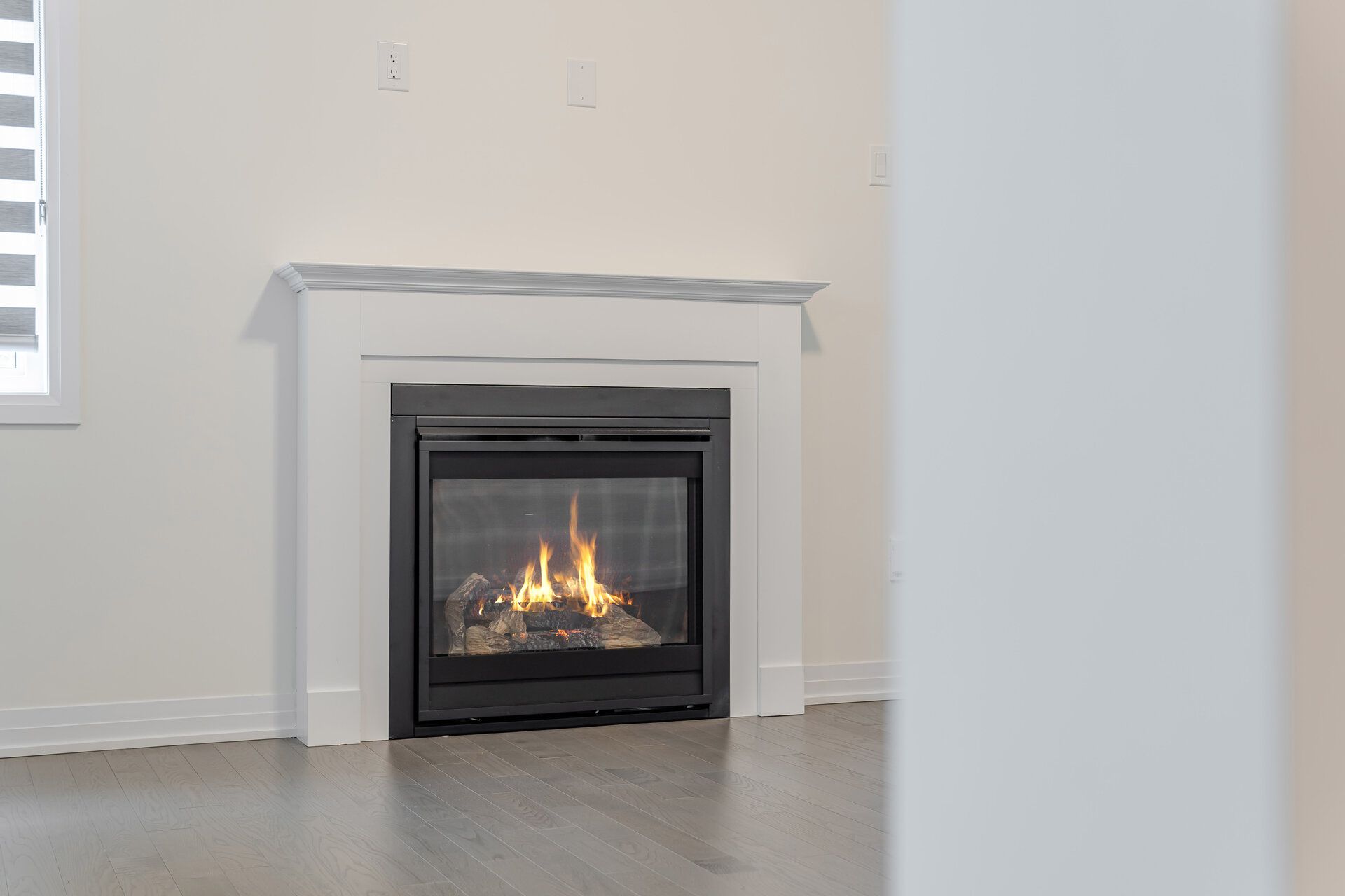 • Open-concept main floor features 9-foot ceilings and elegant electric fireplace.