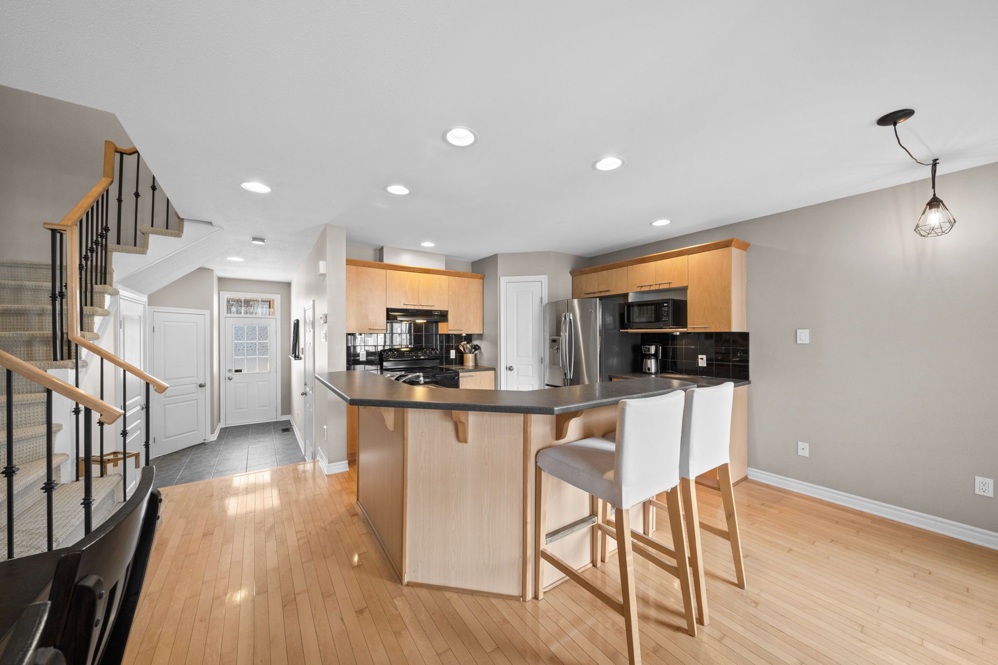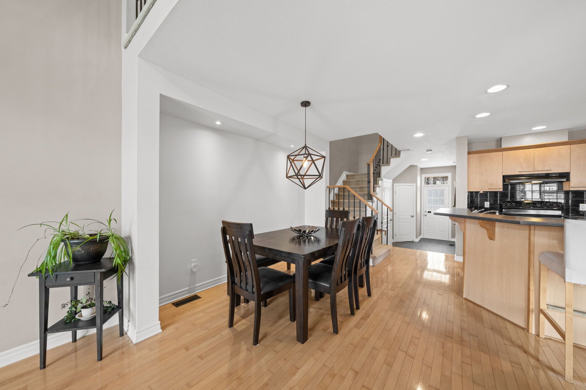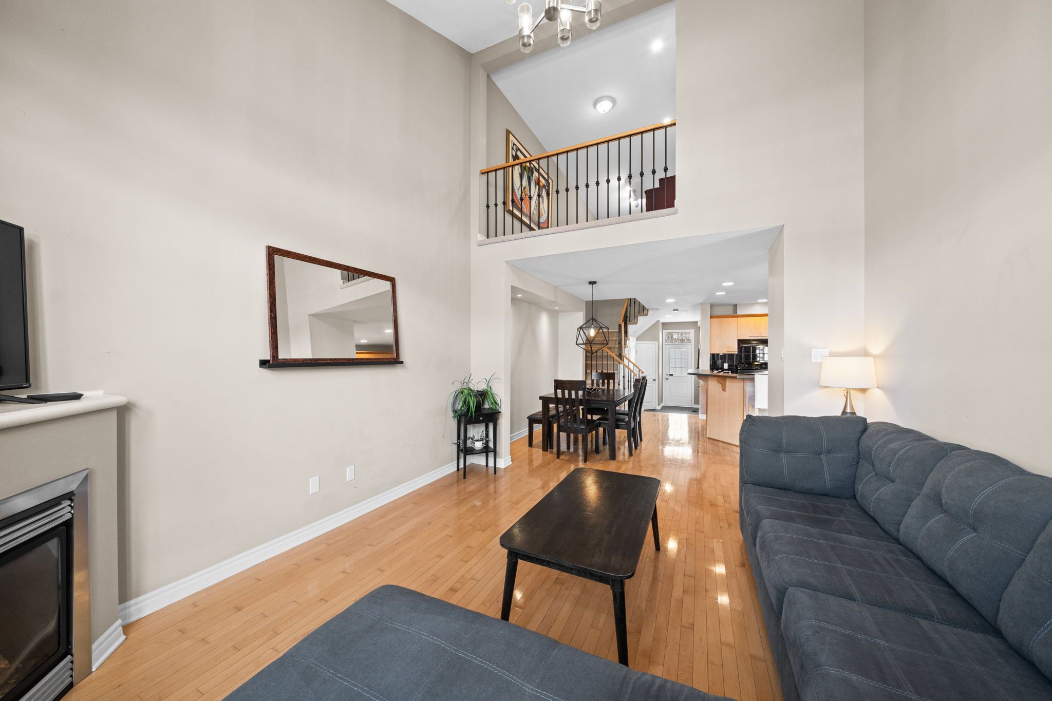 Beautifully maintained townhome in the heart of riverside south, offering 2 bedrooms + loft, 3 bathrooms, and a fully finished lower level. Step inside to a welcoming tiled foyer with a convenient powder room and direct access to the garage. The open-concept main level is filled with natural light from the large window and features beautiful maple hardwood flooring, a spacious living room with a 2 storey soaring ceiling, gas fireplace, and a dedicated dining area perfect for entertaining. The home has been freshly painted, giving it a clean, updated feel. The kitchen is thoughtfully designed with solid maple cabinetry, stainless steel appliances, a pantry, breakfast bar, and under-mount lighting, offering both style and function. Upstairs you'll find a spacious landing that opens to a large, bright and versatile loft space, ideal for a home office and overlooking the living room. The large and bright primary bedroom features a walk-in closet. A second well-sized bedroom and a luxurious main bathroom with a walk-in glass shower and a deep soaker tub complete the second floor. The finished lower level features a generous recreation room (currently being used as a bedroom) with pot lights and a large window, a modern 2-piece bathroom, and plenty of storage space. Additional highlights include berber carpeting with premium underpad, wrought-iron staircase spindles, and updated lighting throughout. Enjoy low-maintenance living just steps from parks, schools, walking trails, shopping, and public transit. This is a move-in ready opportunity in a fantastic, family-oriented community. Perfect for first-time buyers, downsizers, or families looking to enjoy a turnkey property in one of ottawa's most desirable neighbourhoods.