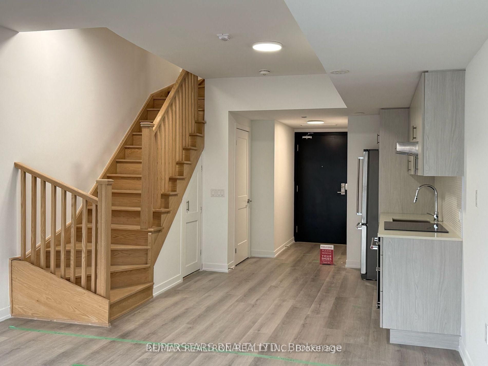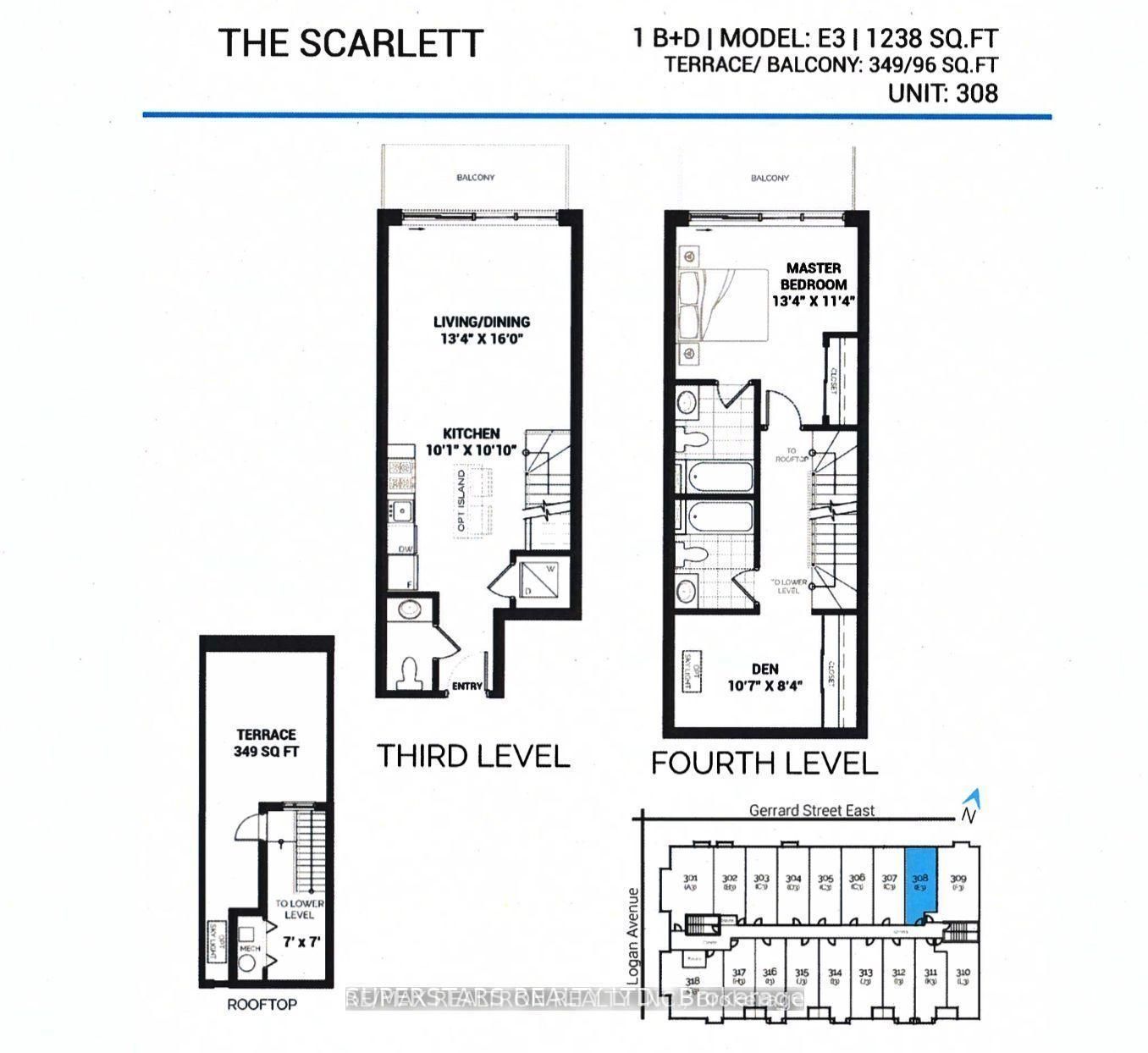 Less than three years new stacked townhouse with large rooftop terrace & balcony! 1 parking & 1 locker included. Bright and functional layout with 2 bedrooms and 3 bathrooms. Laminate flooring throughout. Open living/dining/kitchen walk-out to balcony. Powder room on main floor. 2 bedrooms & 2 bathrooms on upper level. Close to ttc, dvp, shops,restaurants, park...