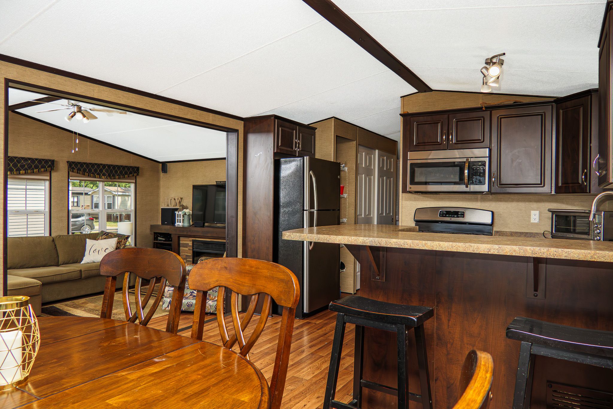 • Vaulted ceilings and a cozy electric fireplace for comfort.