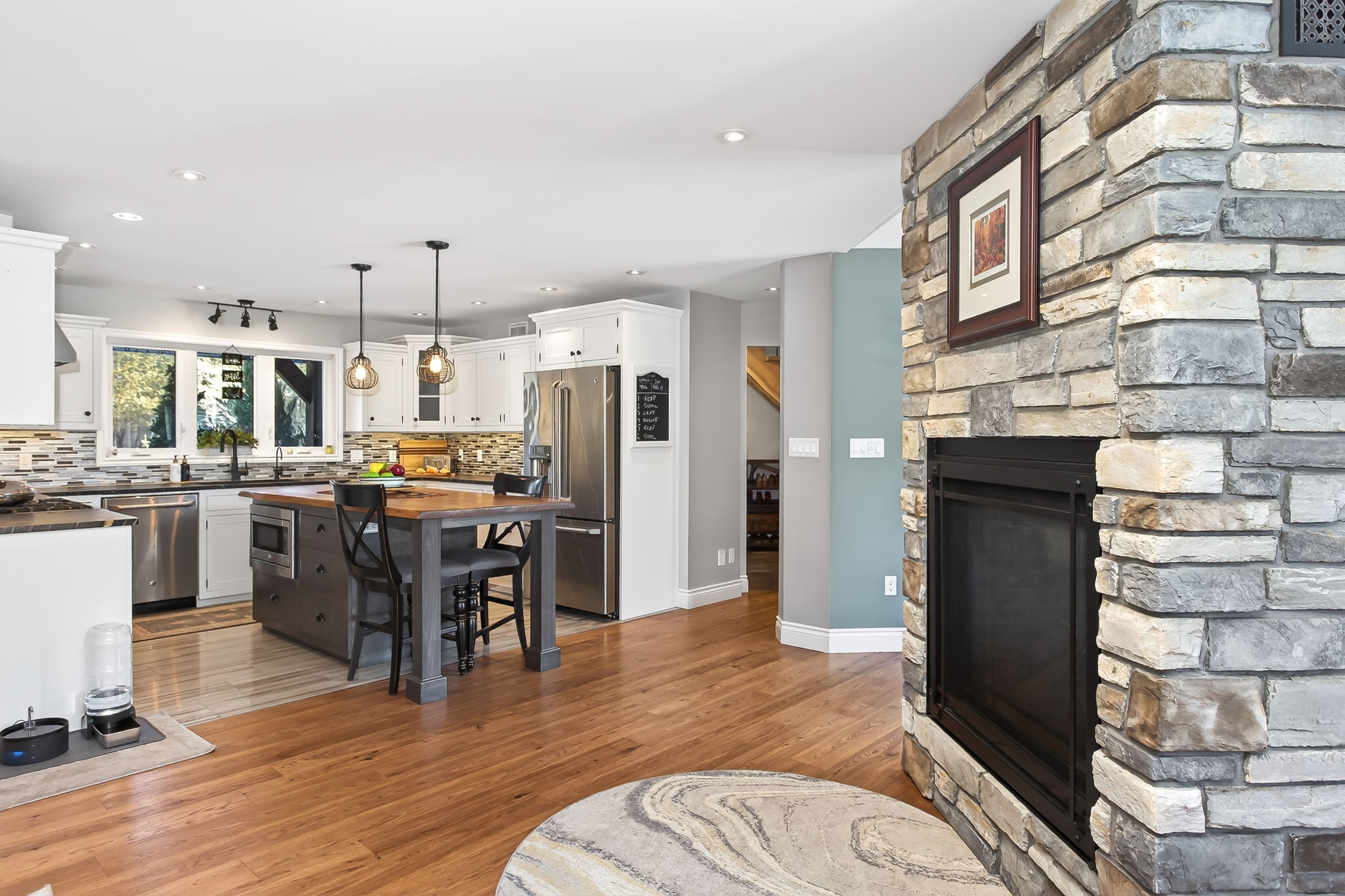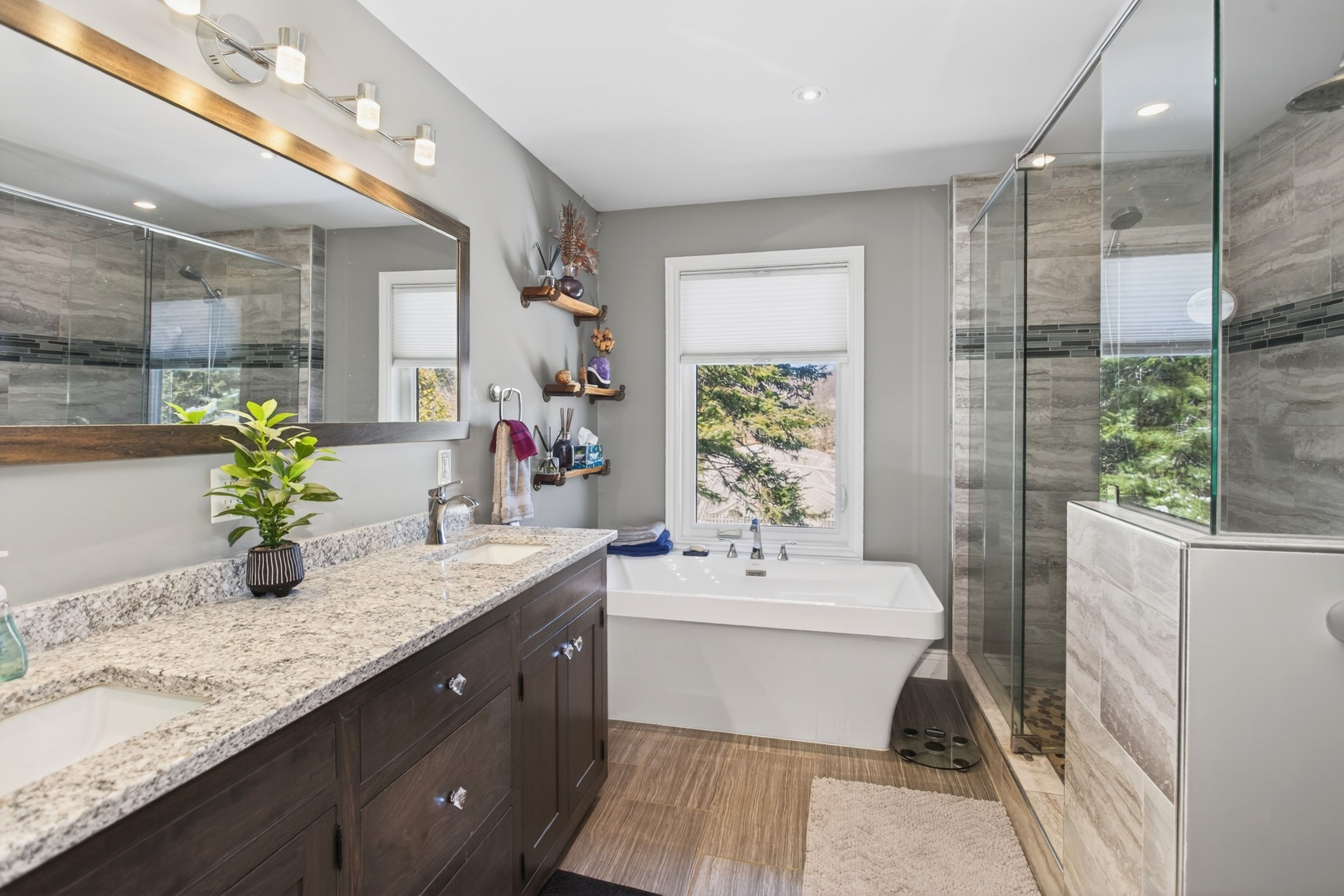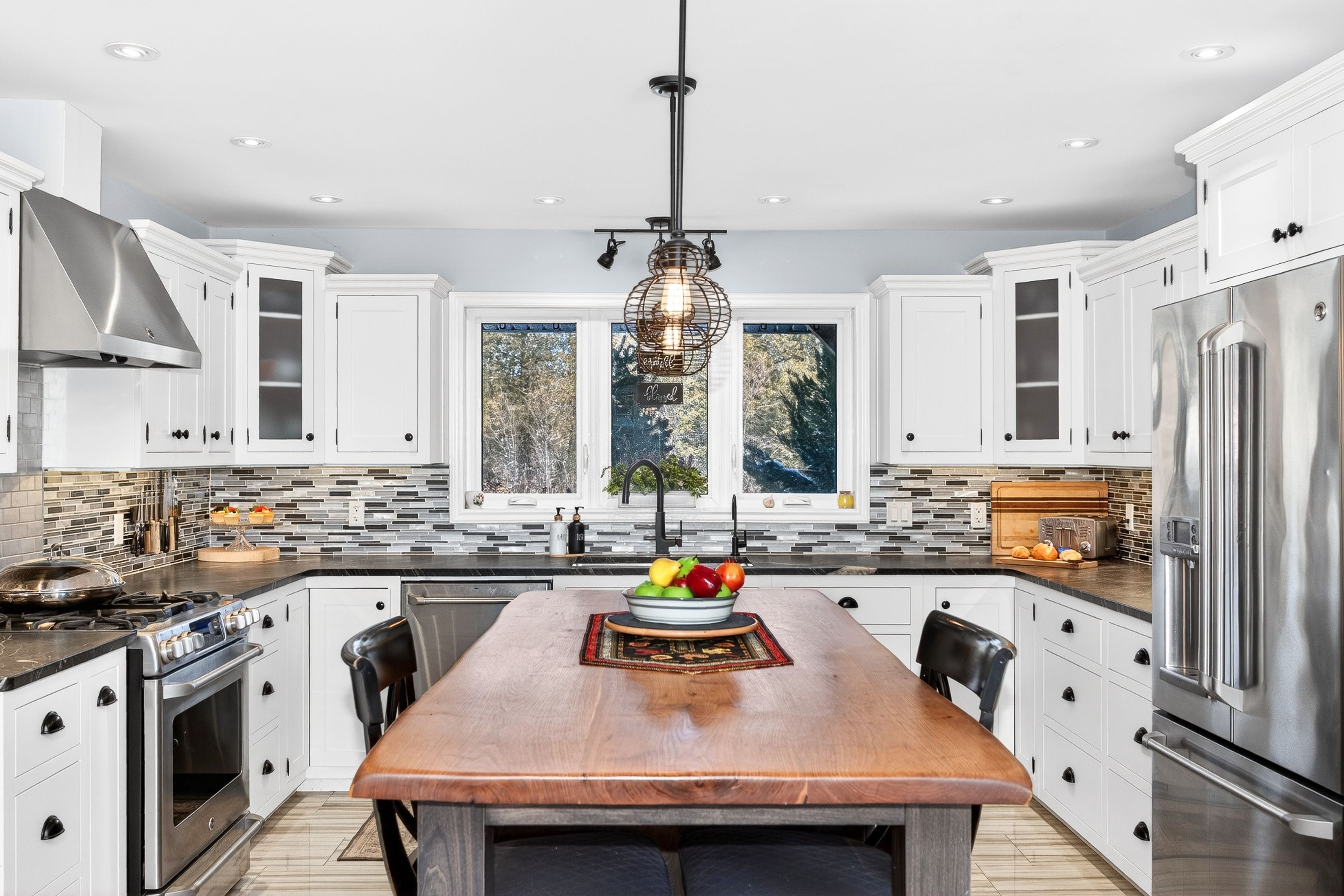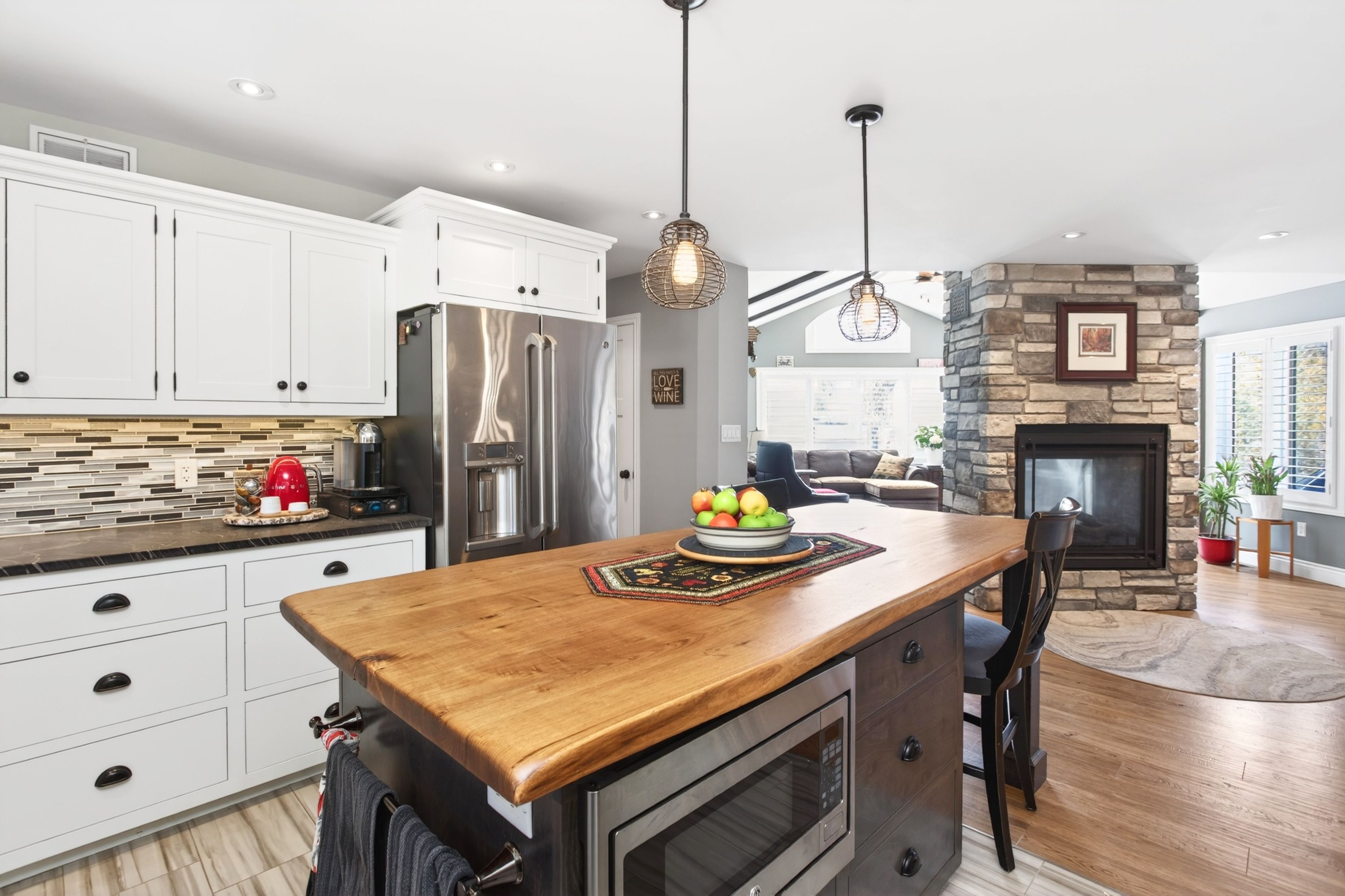 • Stunning kitchen with granite countertops, heated floors, and a live edge island.