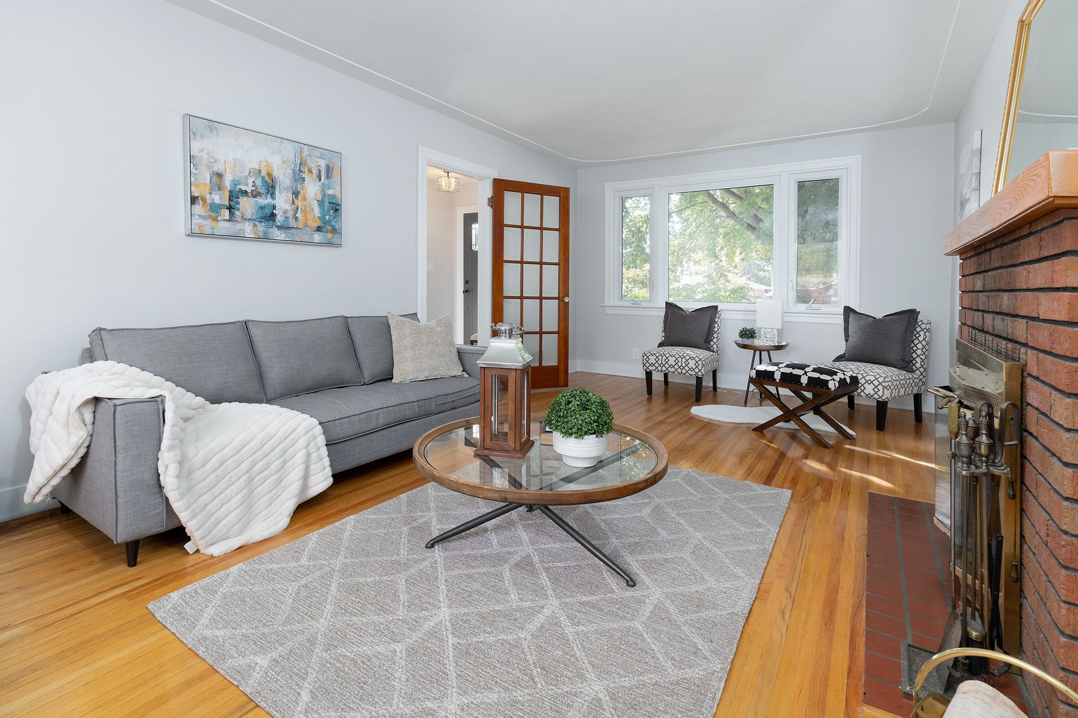 • Bright and charming living room with a cozy wood fireplace.