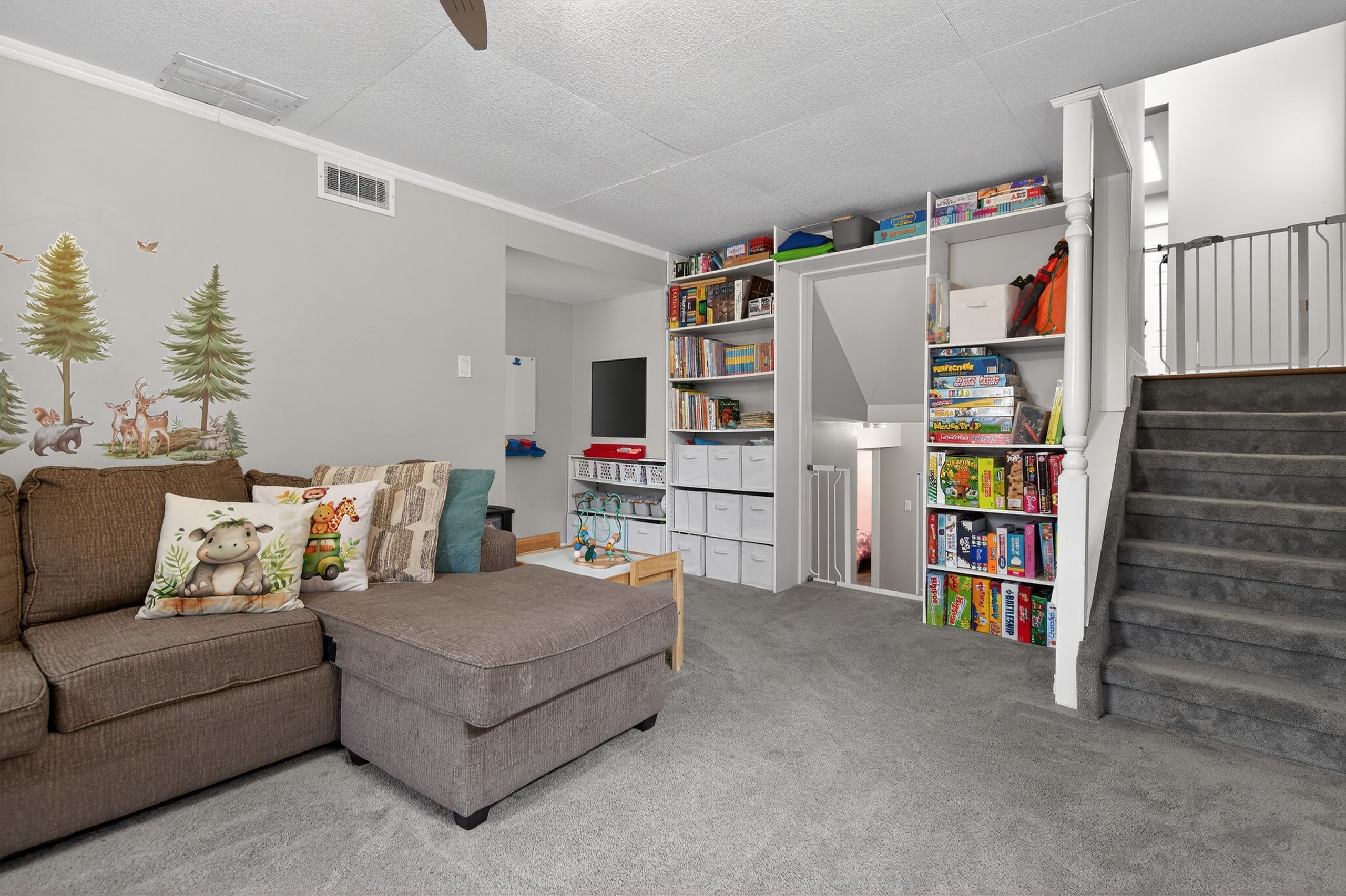 • Lower levels include a cozy rec room, flexible spaces, and ample storage.