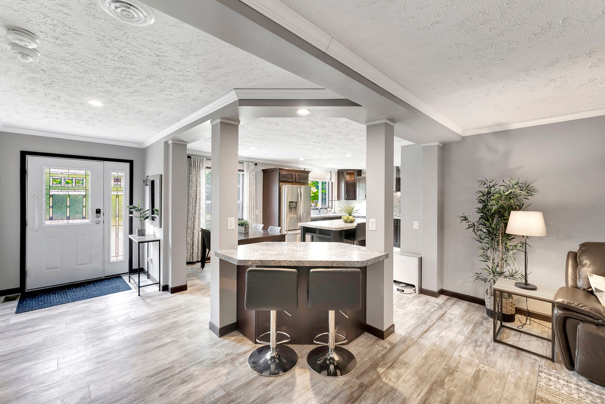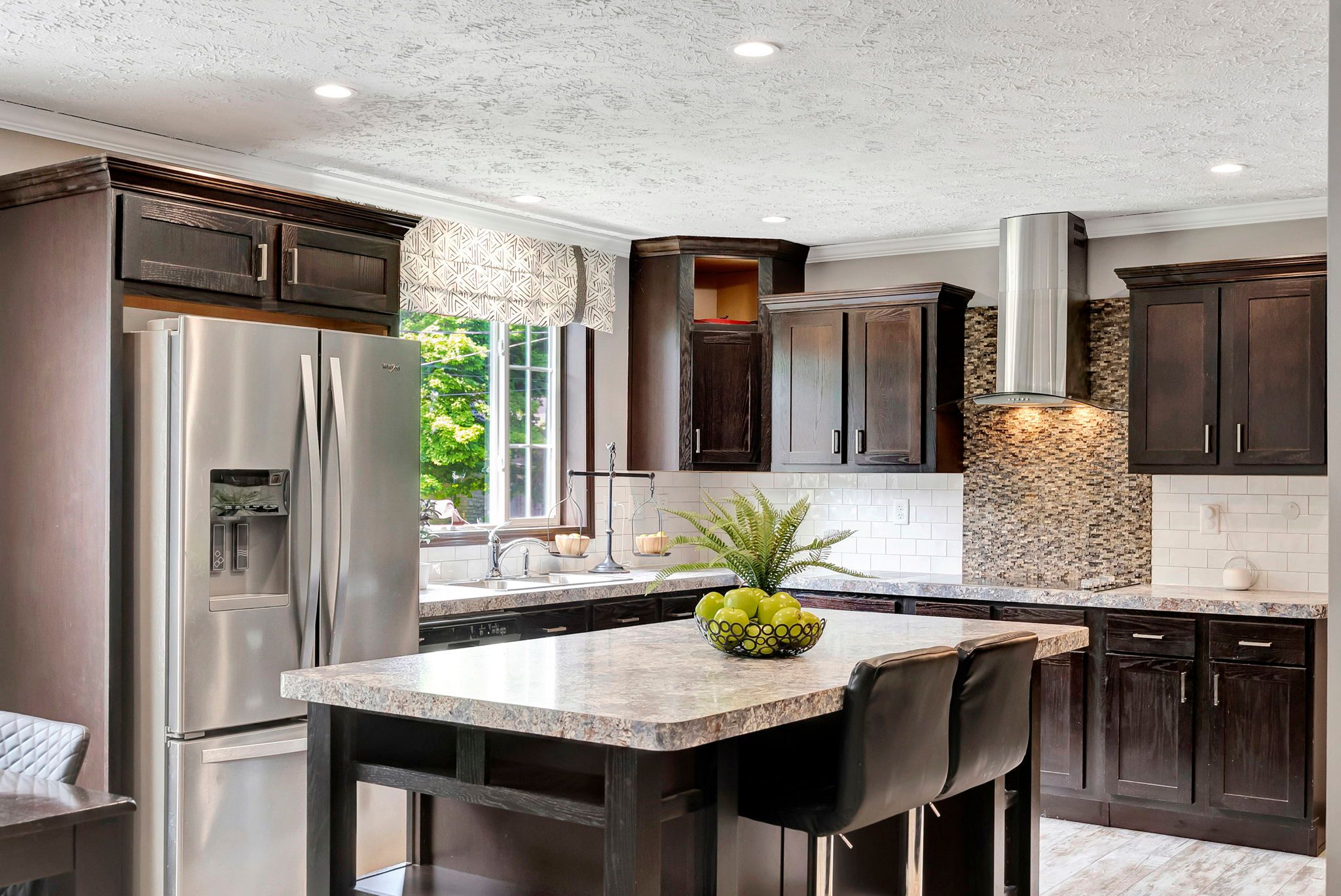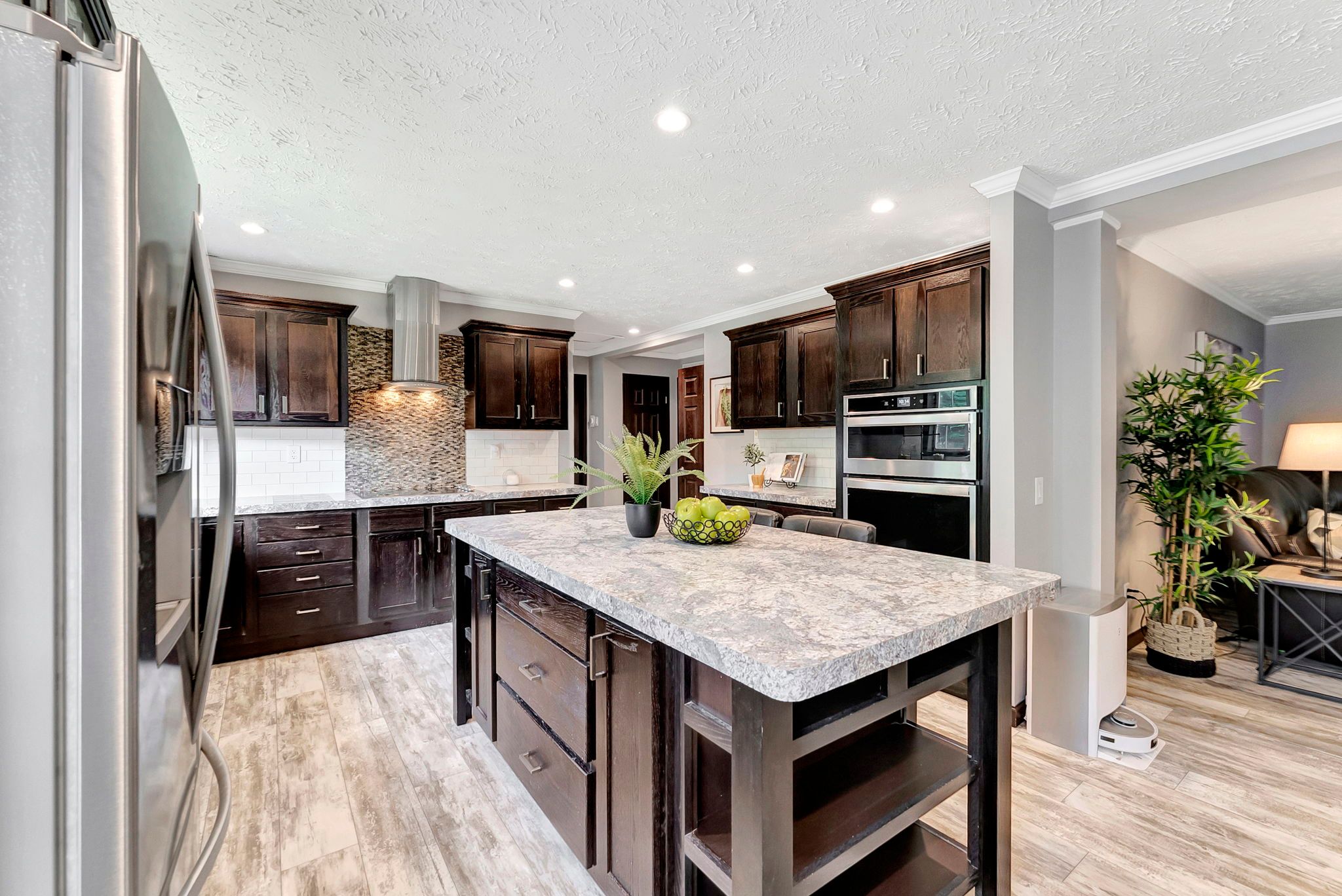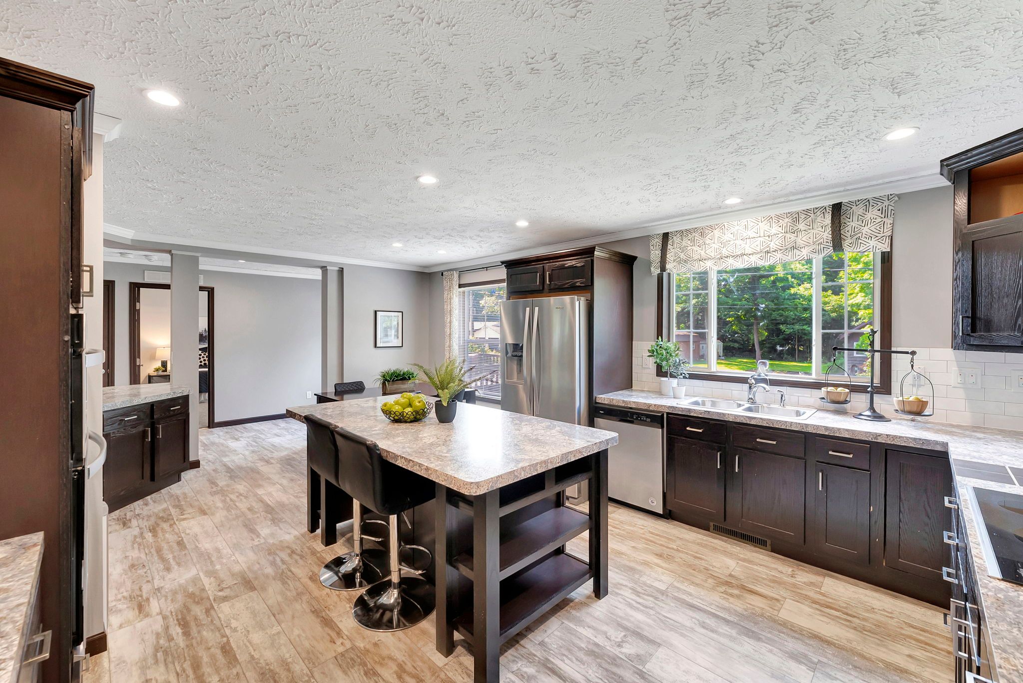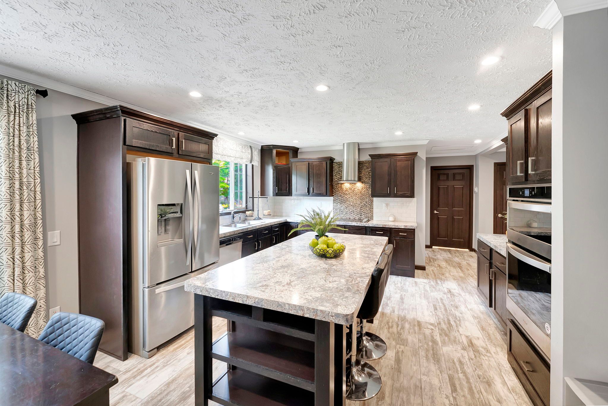 • Spacious eat-in kitchen with two islands and stainless steel appliances.