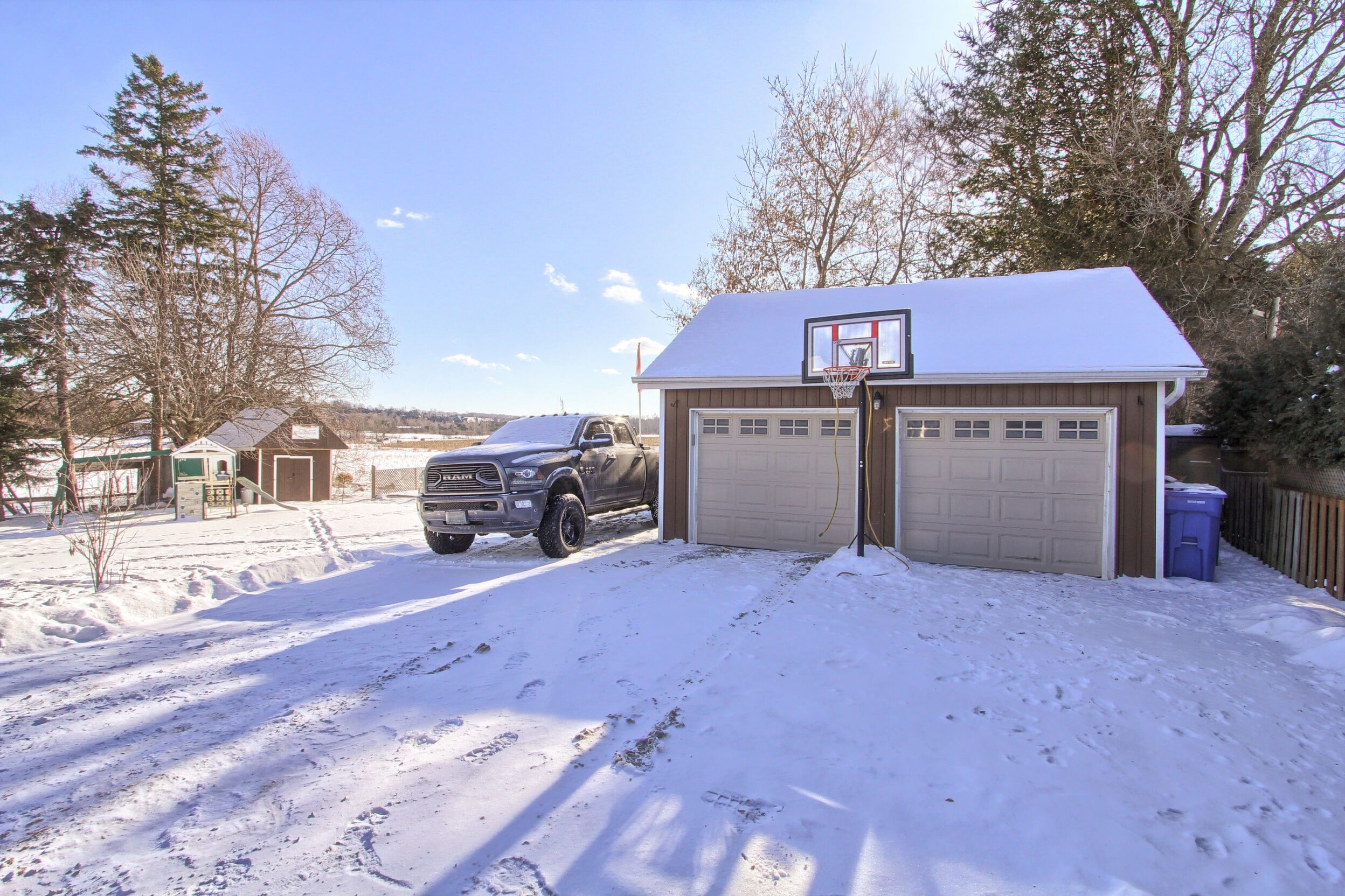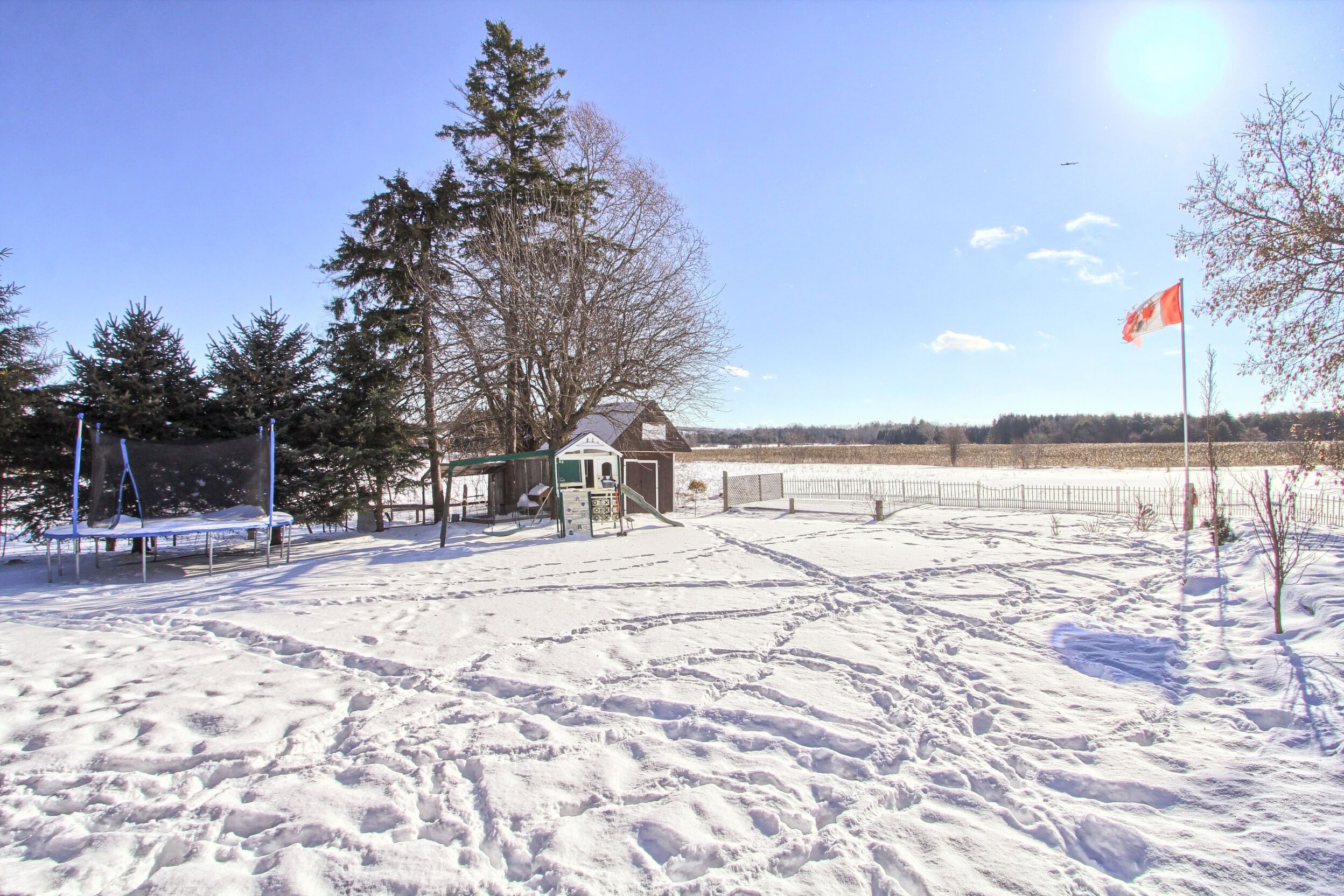 • Private south-facing backyard with scenic farm field views.