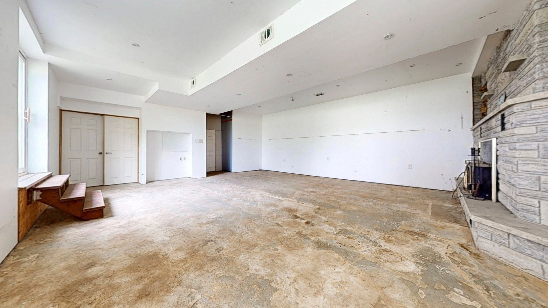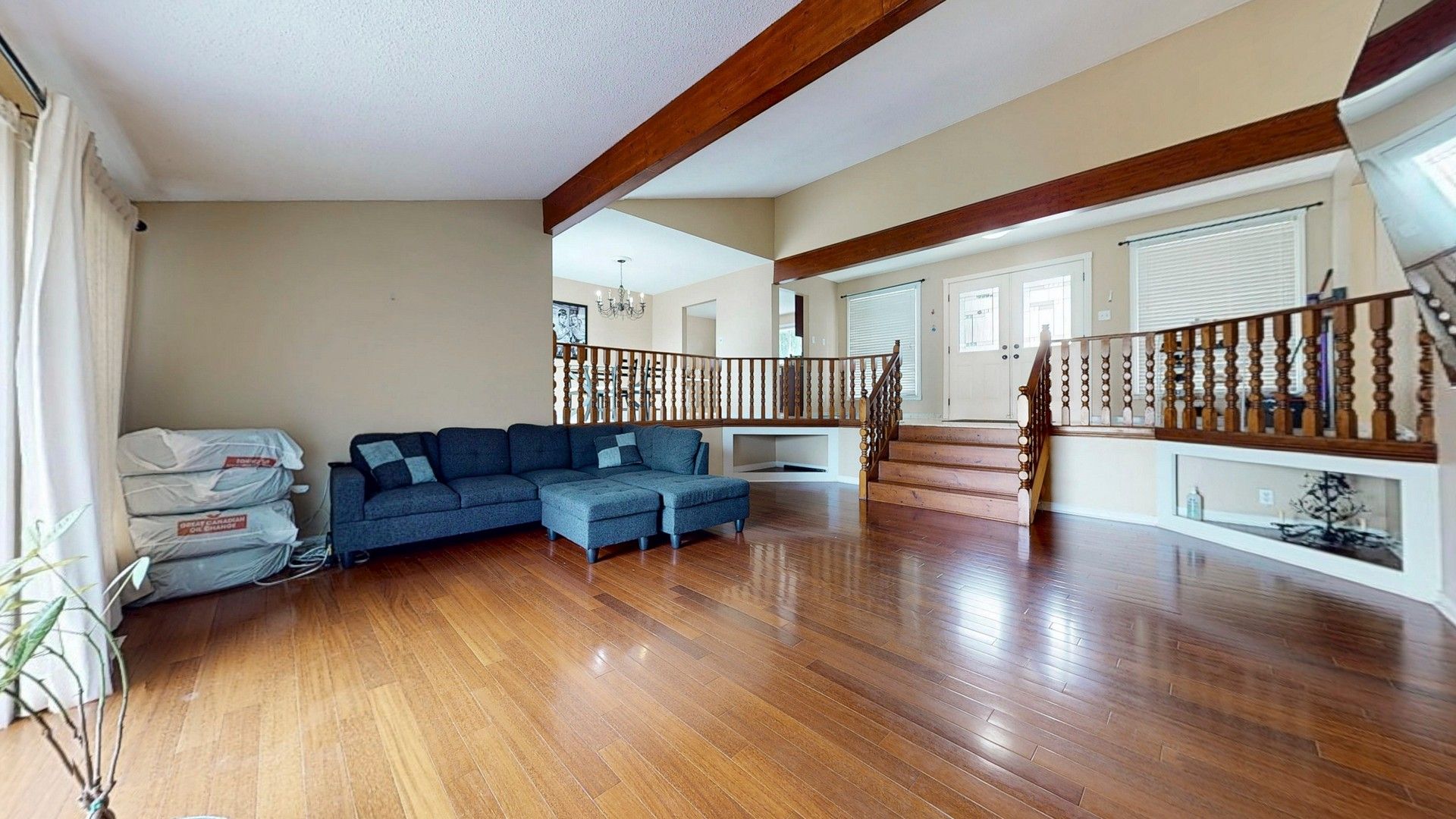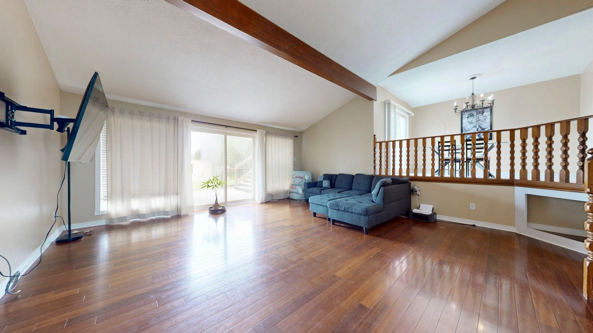 • Sunken family room has vaulted ceilings and rustic charm.