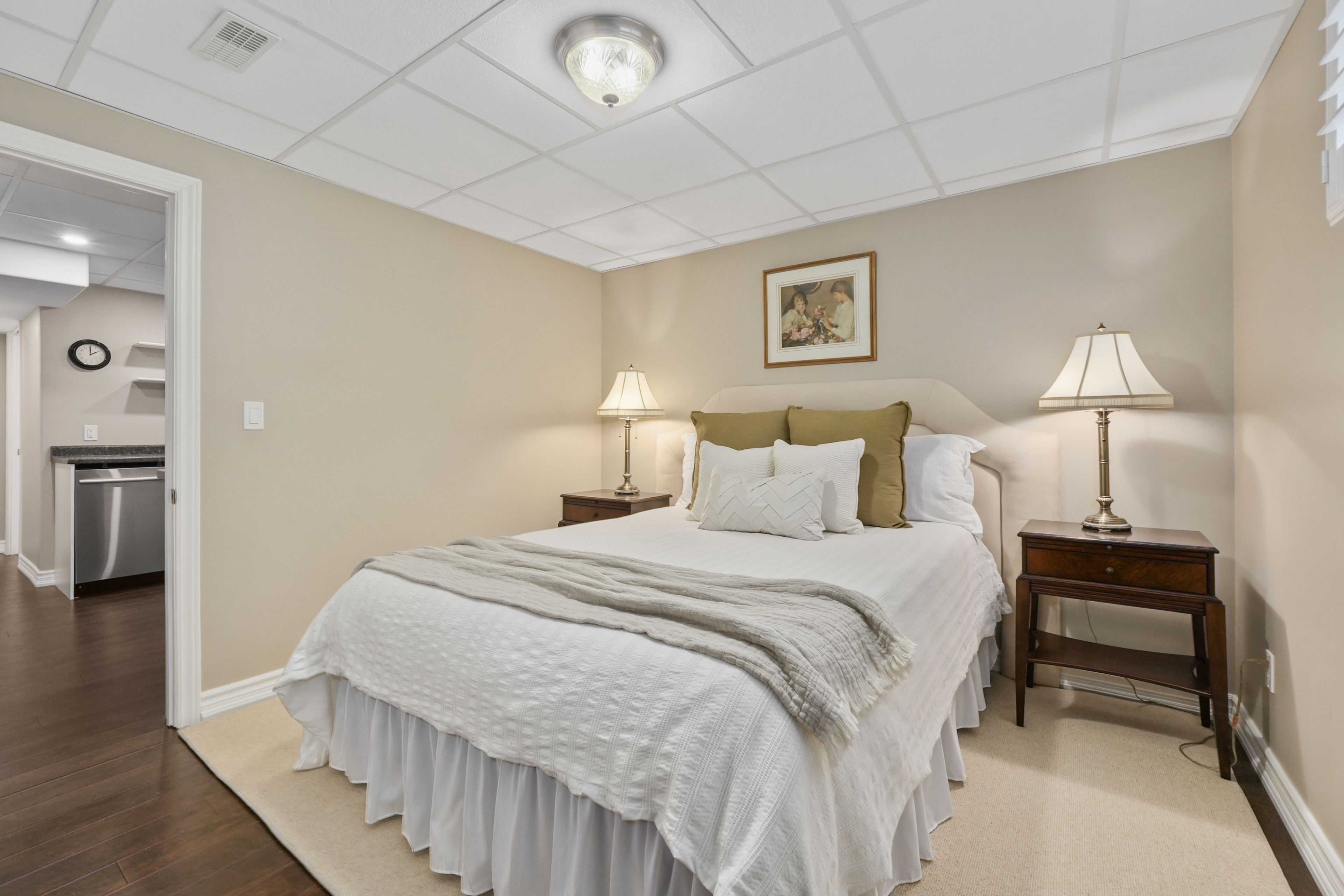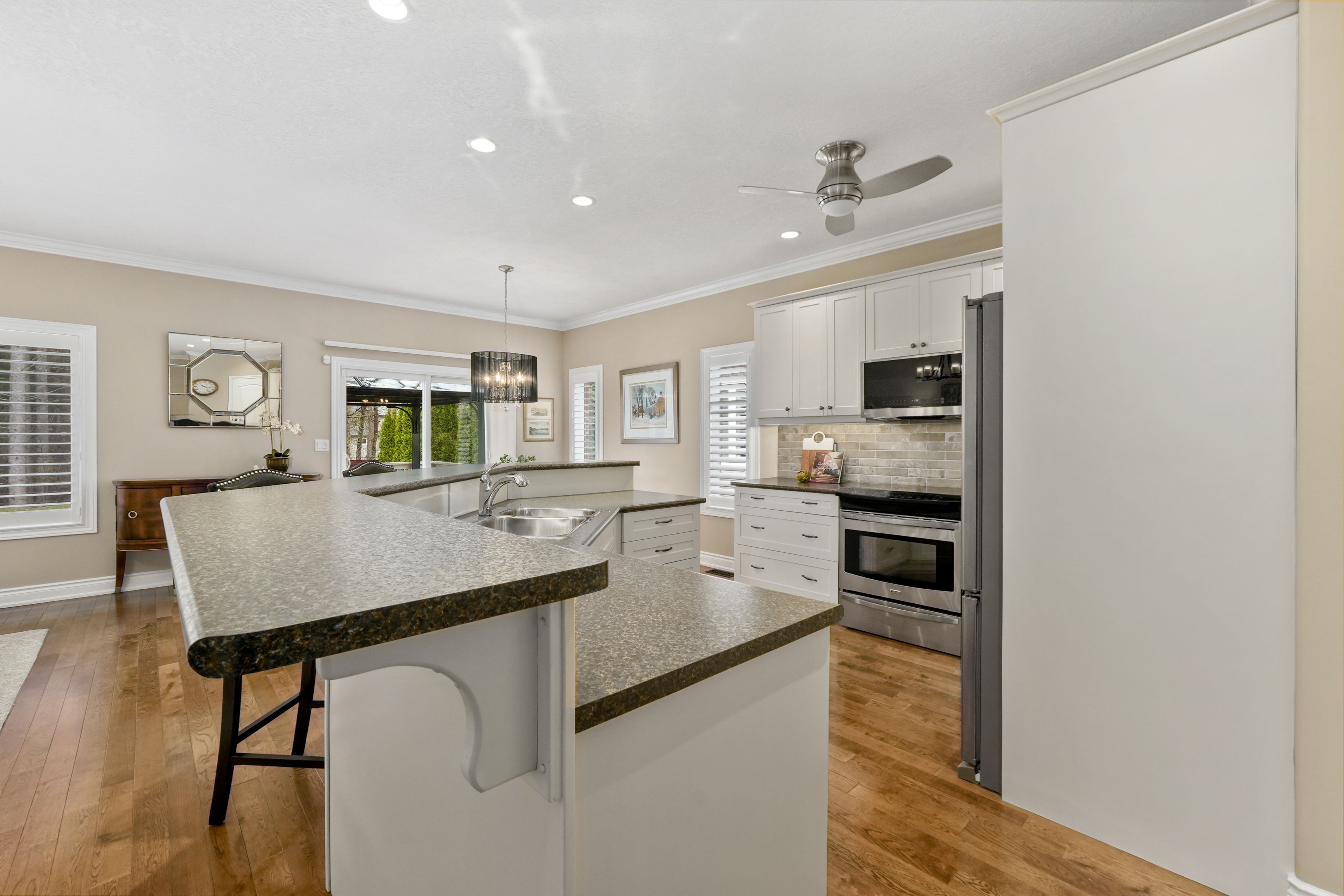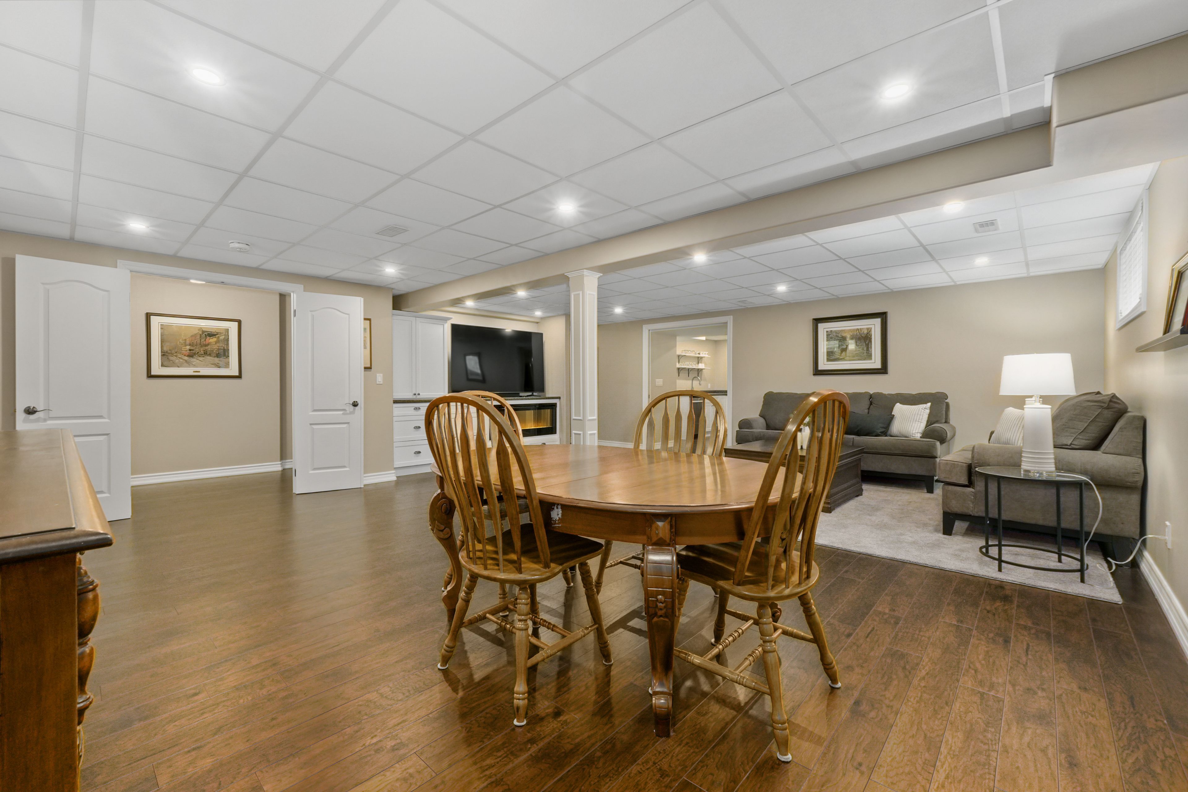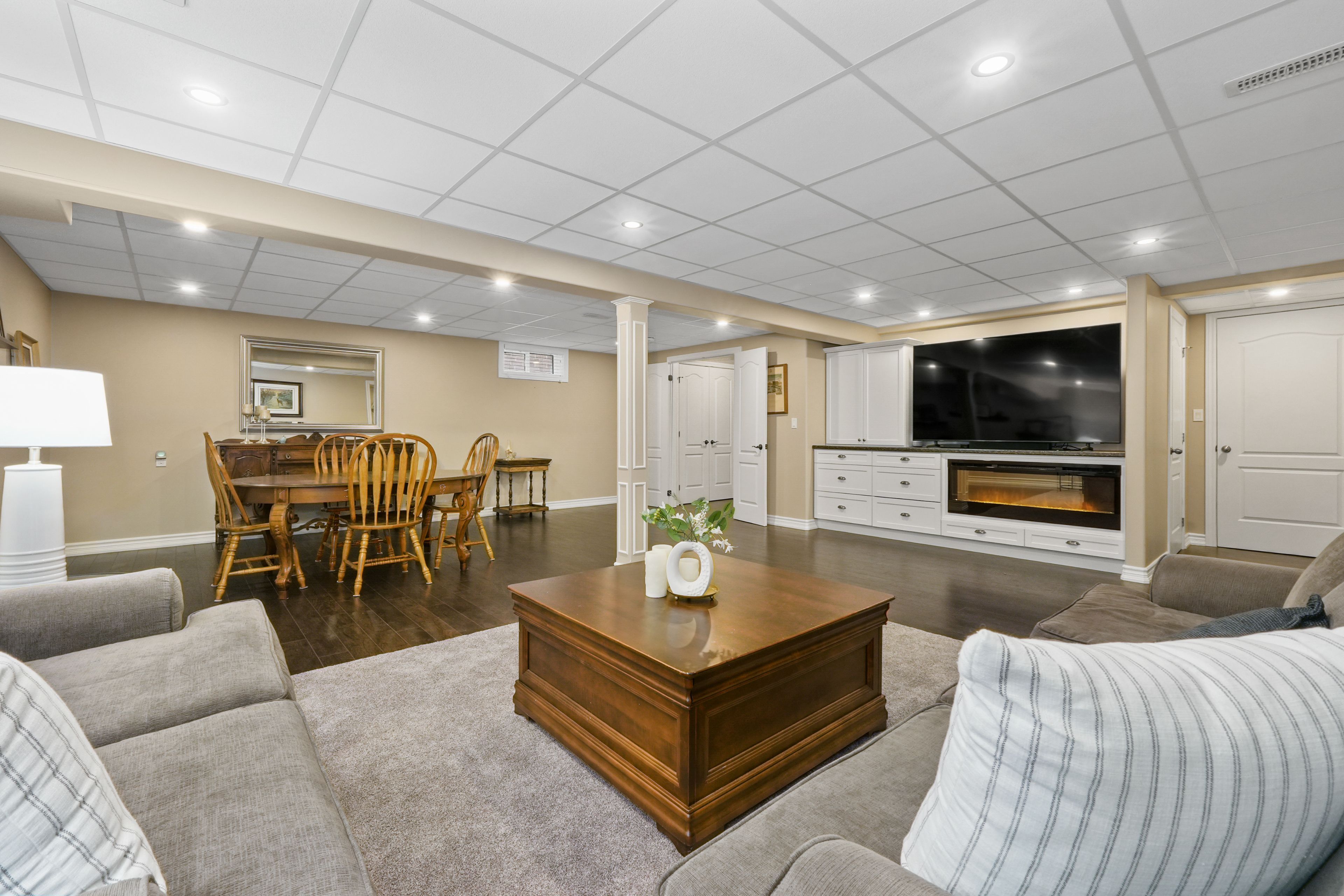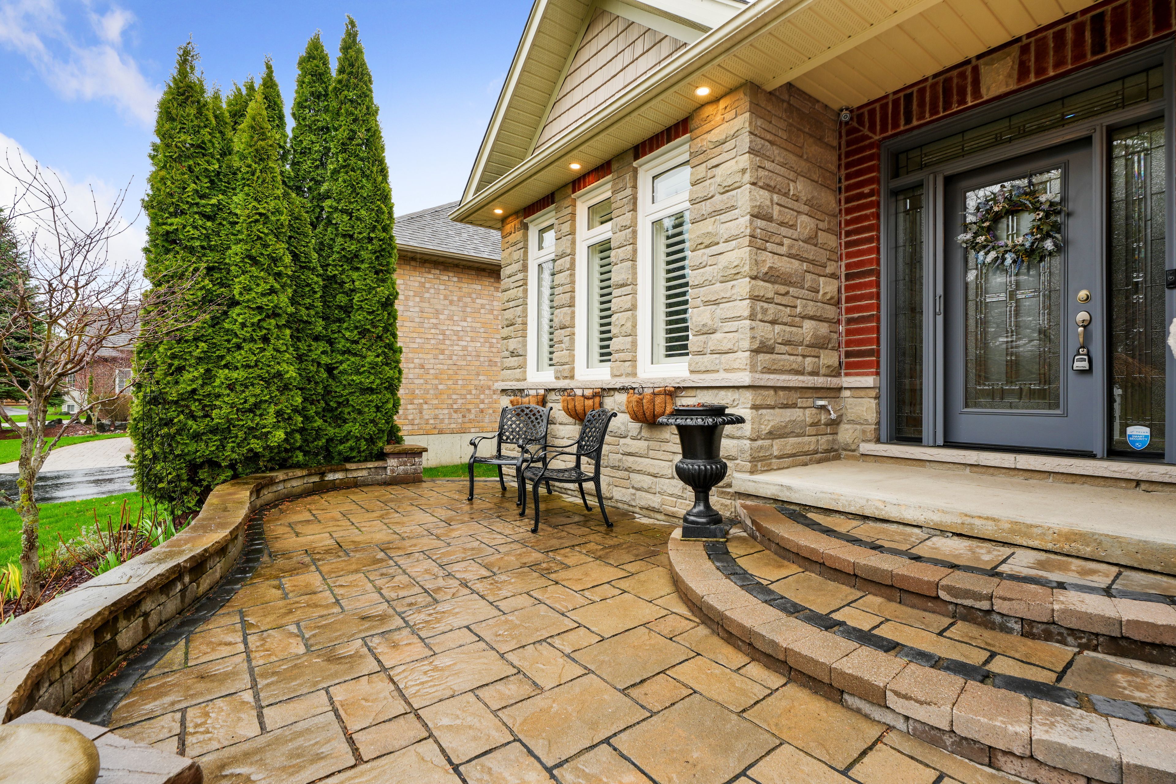Beautifully designed bungalow overflowing with curb appeal, complete with a fully finished basement and separate kitchen, offering exceptional flexibility for modern living. Step inside to an open-concept principal living space featuring a carpet-free layout, elegant crown moulding, and recessed lighting that creates a warm and inviting atmosphere. The spacious living area is filled with natural light from multiple windows, while the dining area offers a seamless walkout, perfect for entertaining or enjoying alfresco meals in the warmer months. The kitchen is thoughtfully designed with stainless steel appliances, ample counter and cupboard space, and a large island with a raised breakfast bar, serving as the heart of the home. The main floor continues with a spacious primary suite featuring a tray ceiling and a private ensuite with a glass shower enclosure. A guest bedroom, full bathroom, and a convenient laundry room with direct access to the garage complete this level. The lower-level in-law suite provides incredible versatility, offering a large rec room with built-ins, a dedicated dining or games area, a well-appointed kitchen, an additional bedroom with an egress window, a bathroom, and generous storage space-ideal for extended family or multi-generational living. Outside, enjoy a fenced backyard designed for both relaxation and entertaining, featuring a deck, patio, gazebo with soft ambient lighting for summer evenings, a custom-built shed with connected electricity, and beautifully cultivated gardens. Thoughtful exterior enhancements include downlights in the front and rear soffits for attractive nighttime illumination, along with convenient lighting at the side garage door and on the shed. Perfectly situated just moments from everyday amenities with easy access to the 401, this home delivers the ideal balance of comfort, style, and convenience. An exceptional opportunity to enjoy turnkey living with space for everyone, all under one roof.