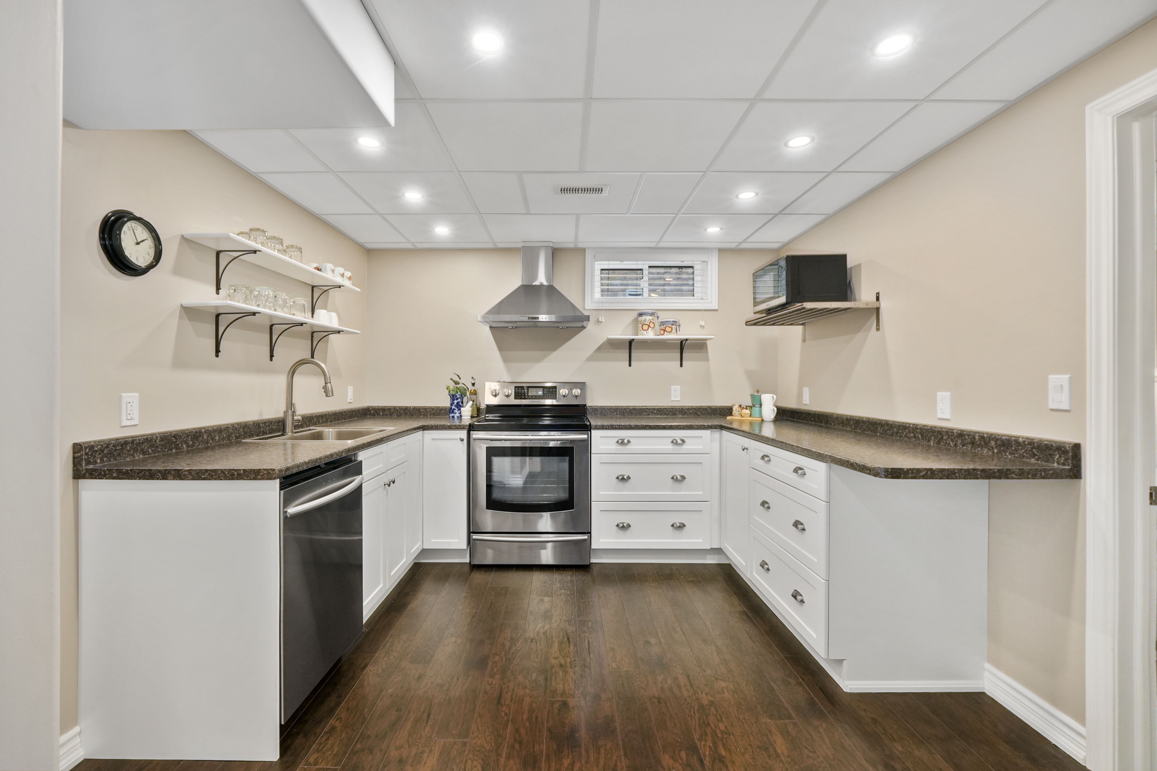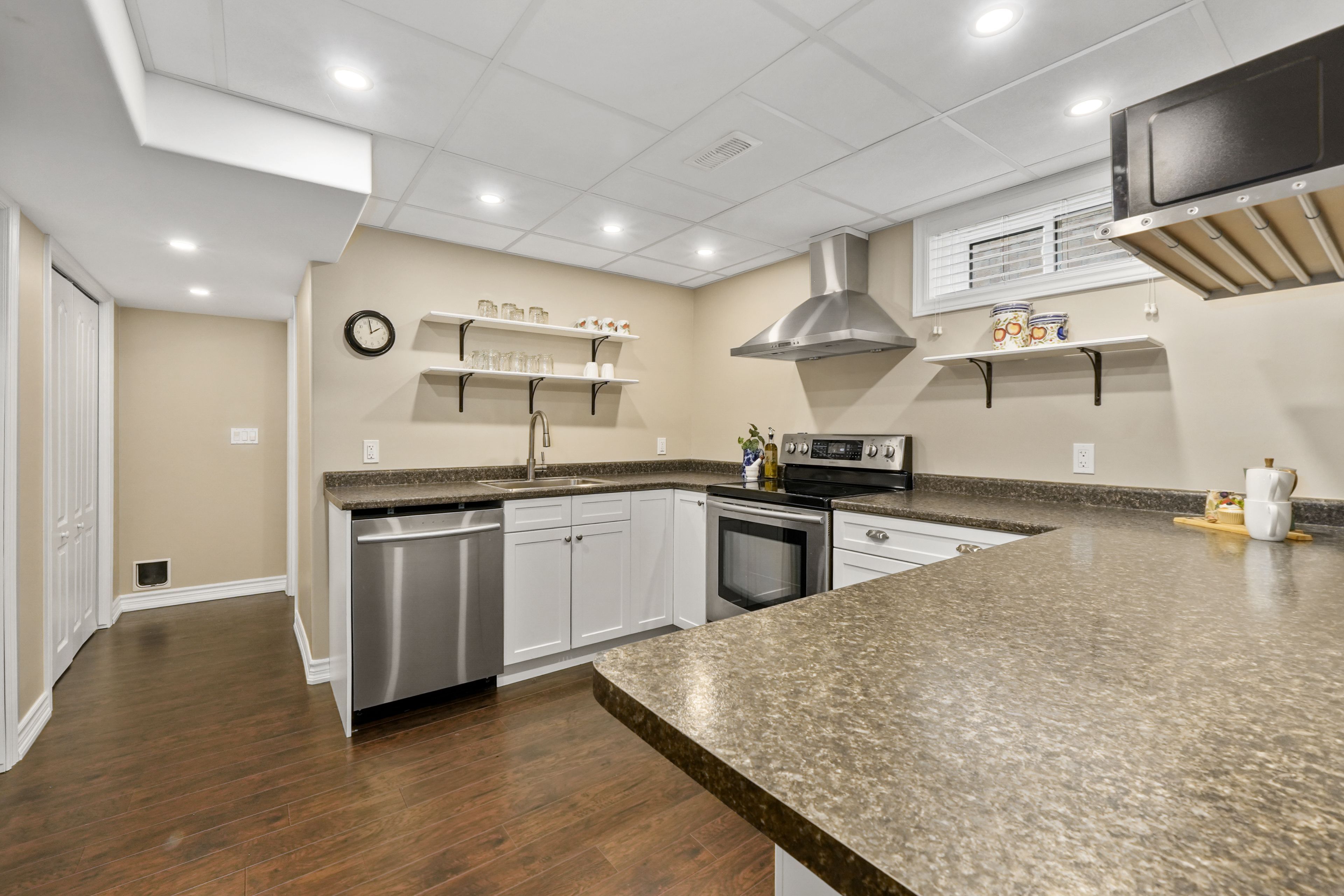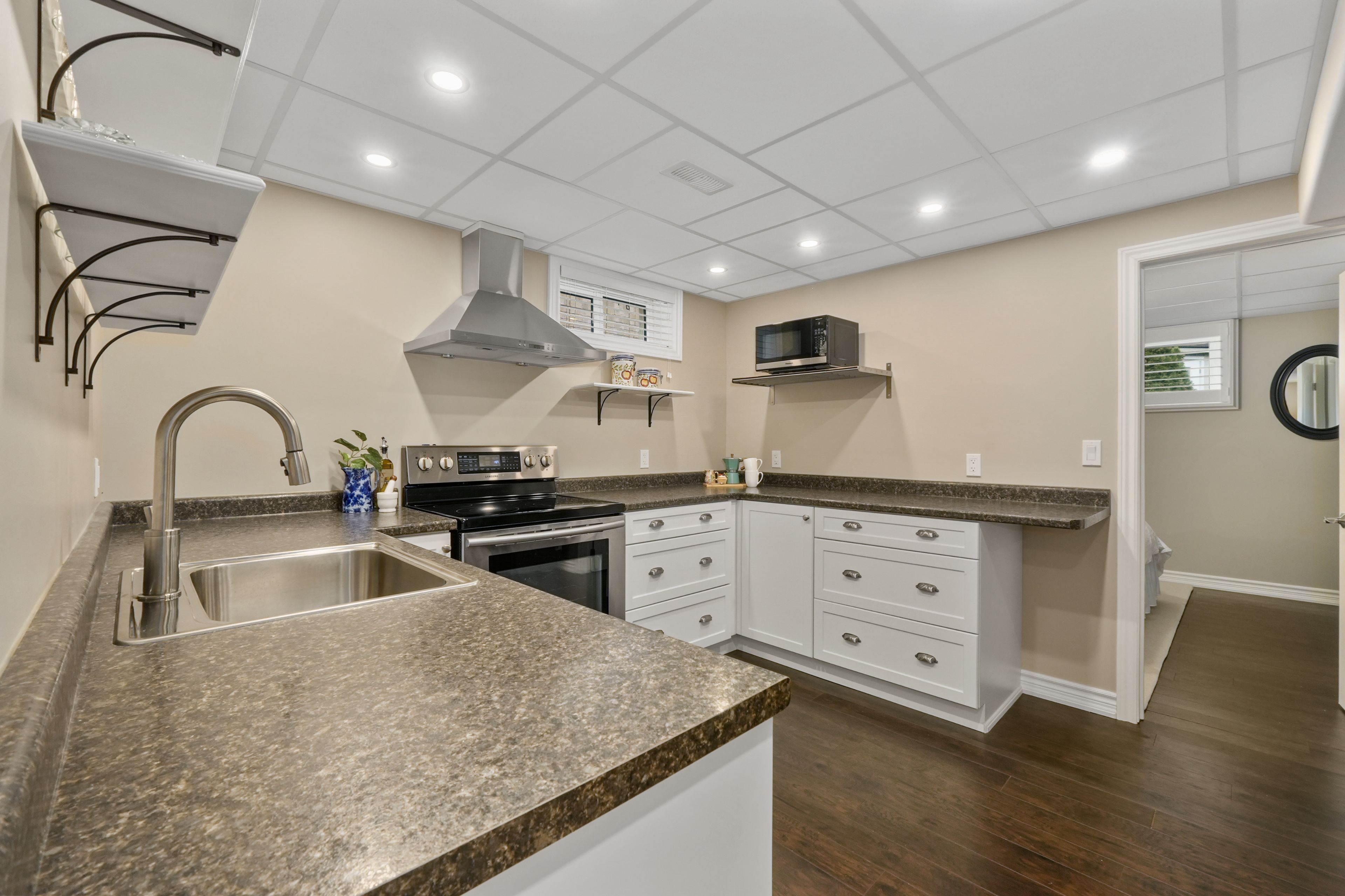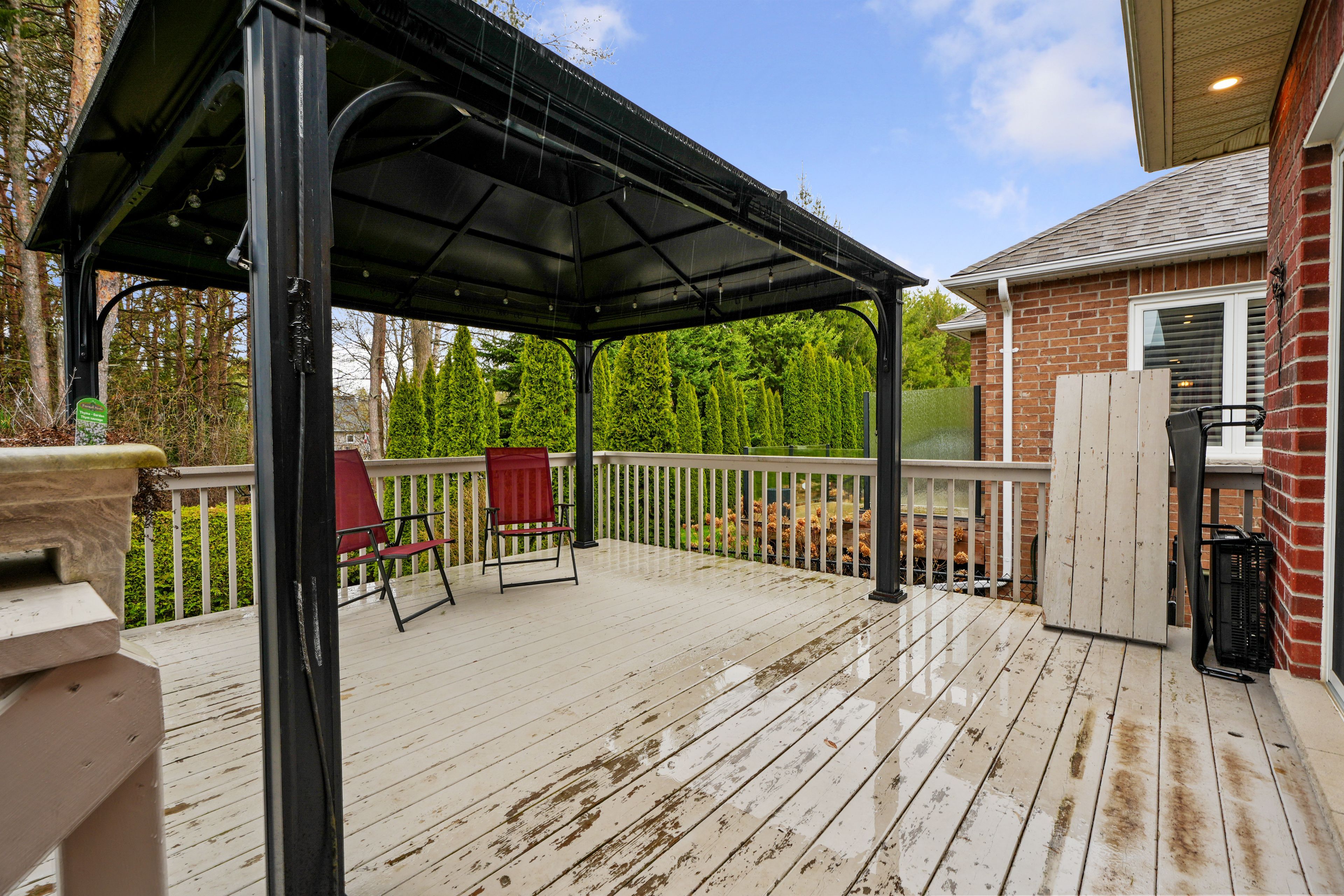 Beautifully designed bungalow overflowing with curb appeal, complete with a fully finished basement and separate kitchen, offering exceptional flexibility for modern living. Step inside to an open-concept principal living space featuring a carpet-free layout, elegant crown moulding, and recessed lighting that creates a warm and inviting atmosphere. The spacious living area is filled with natural light from multiple windows, while the dining area offers a seamless walkout, perfect for entertaining or enjoying alfresco meals in the warmer months. The kitchen is thoughtfully designed with stainless steel appliances, ample counter and cupboard space, and a large island with a raised breakfast bar, serving as the heart of the home. The main floor continues with a spacious primary suite featuring a tray ceiling and a private ensuite with a glass shower enclosure. A guest bedroom, full bathroom, and a convenient laundry room with direct access to the garage complete this level. The lower-level in-law suite provides incredible versatility, offering a large rec room with built-ins, a dedicated dining or games area, a well-appointed kitchen, an additional bedroom with an egress window, a bathroom, and generous storage space-ideal for extended family or multi-generational living. Outside, enjoy a fenced backyard designed for both relaxation and entertaining, featuring a deck, patio, gazebo with soft ambient lighting for summer evenings, a custom-built shed with connected electricity, and beautifully cultivated gardens. Thoughtful exterior enhancements include downlights in the front and rear soffits for attractive nighttime illumination, along with convenient lighting at the side garage door and on the shed. Perfectly situated just moments from everyday amenities with easy access to the 401, this home delivers the ideal balance of comfort, style, and convenience. An exceptional opportunity to enjoy turnkey living with space for everyone, all under one roof.