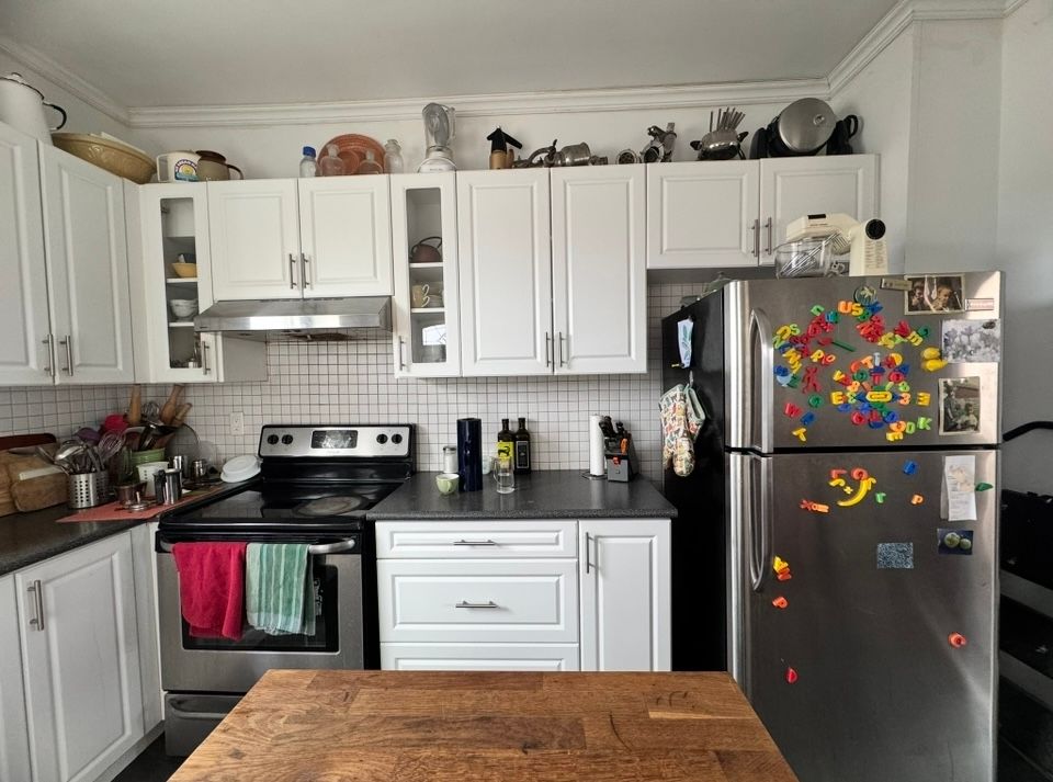 • Bright kitchen with modern cabinetry, stainless steel appliances, and center island.