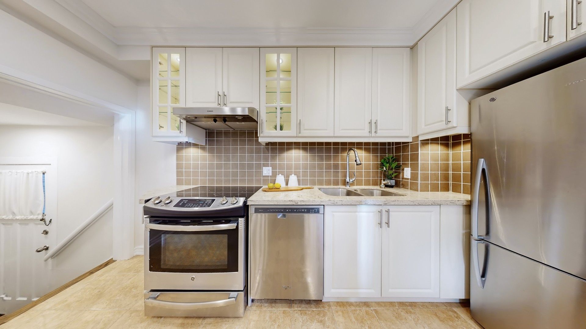 • Modern kitchen with center island, perfect for cooking.