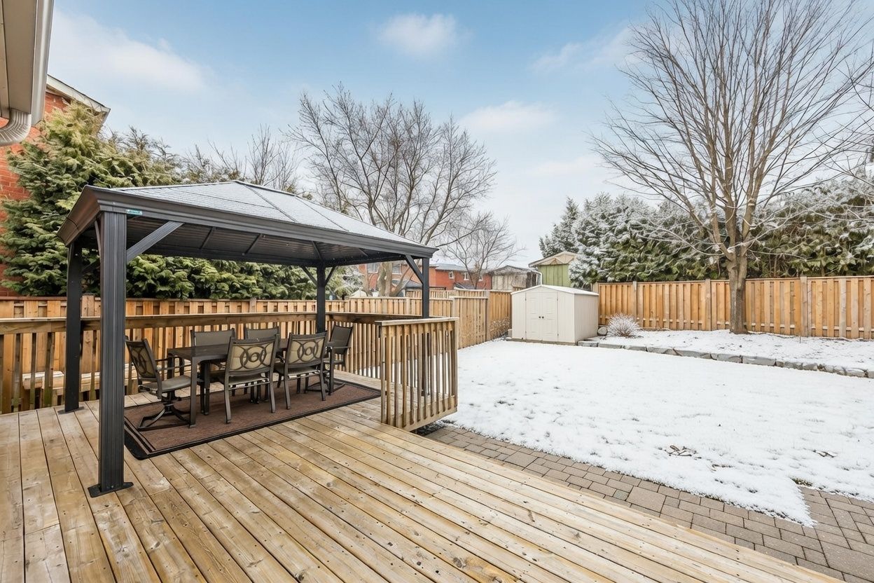 • Large deck and patio with a metal gazebo in a fully fenced backyard.
