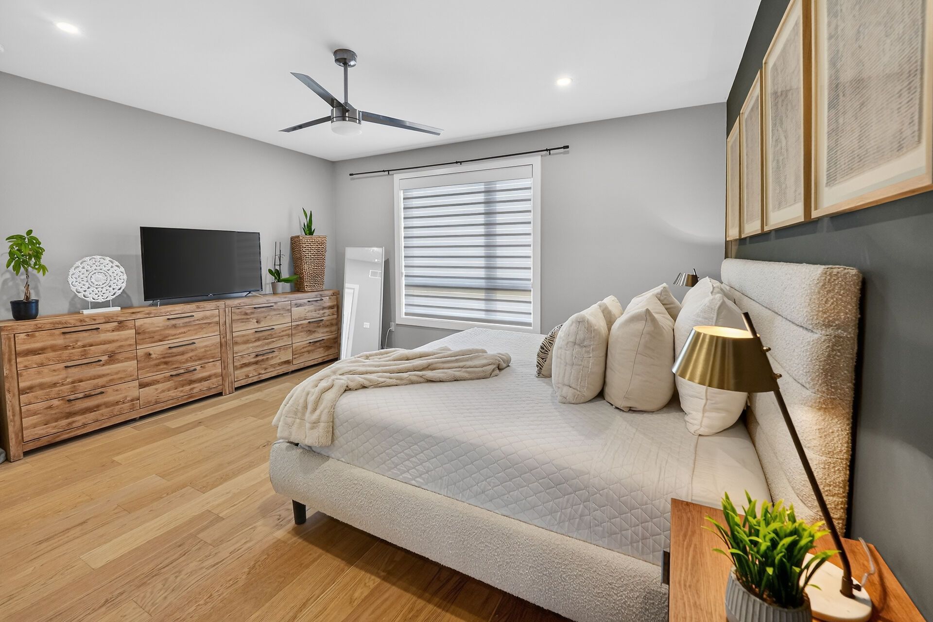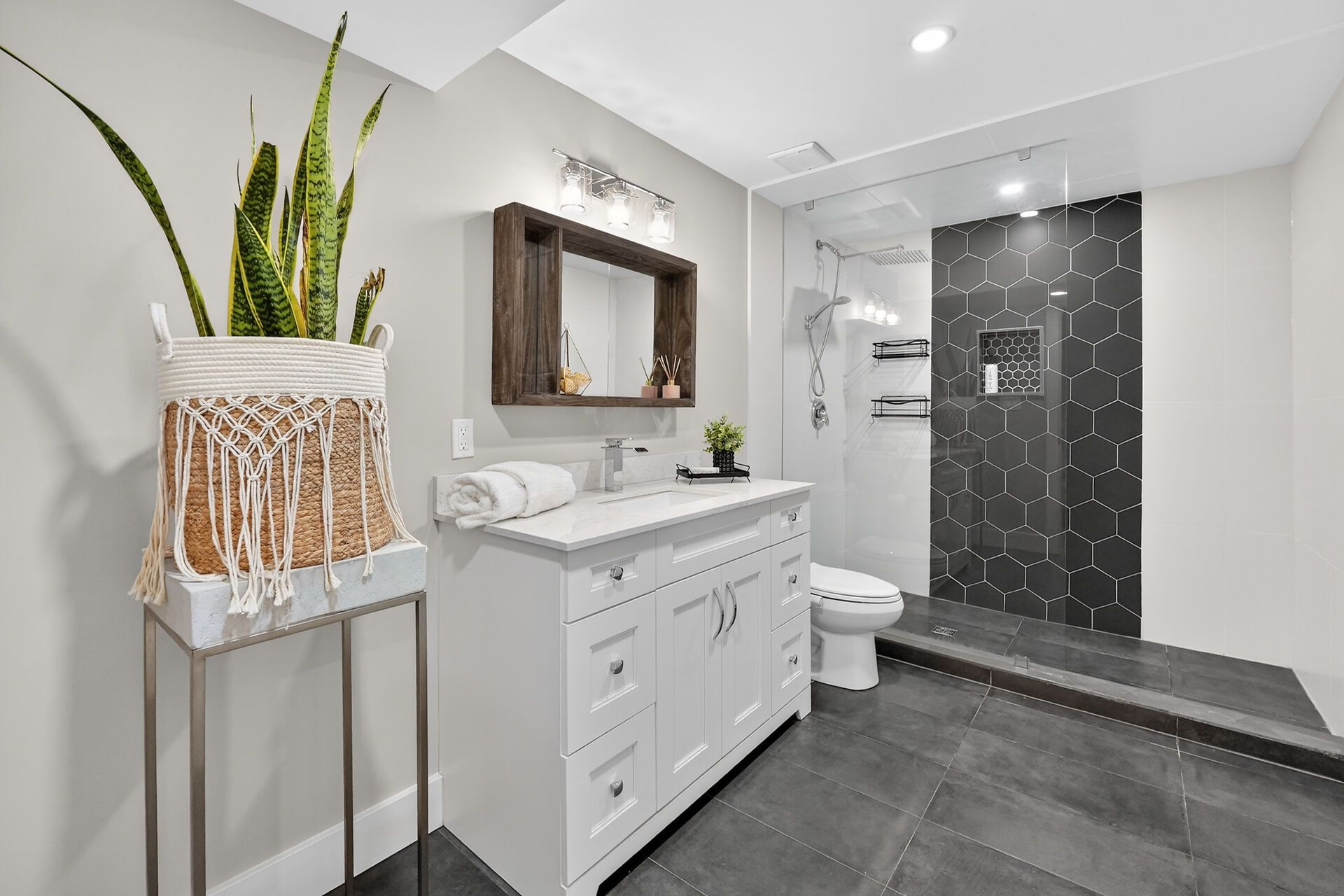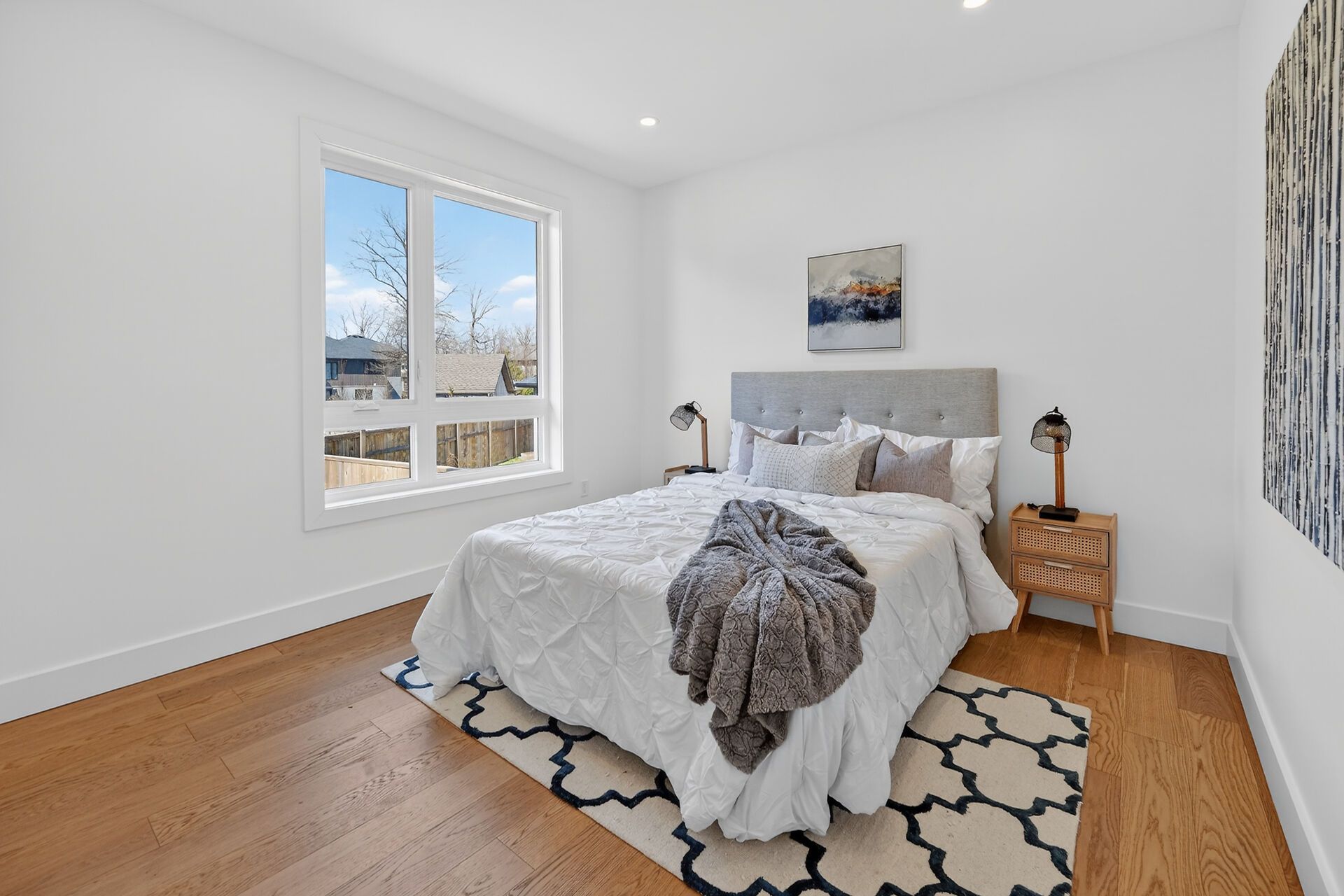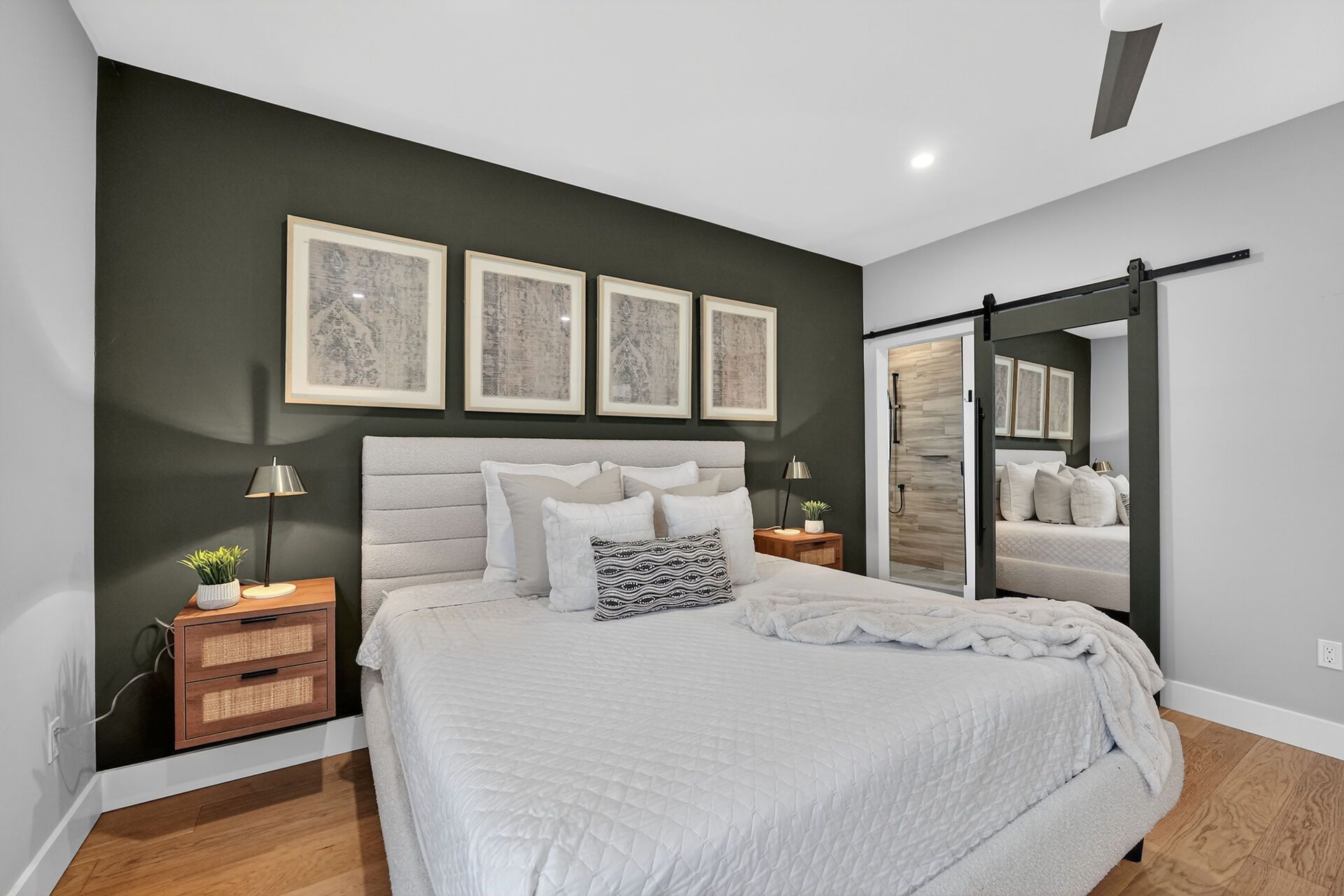 • Contemporary design with nine-foot ceilings and hardwood floors throughout.