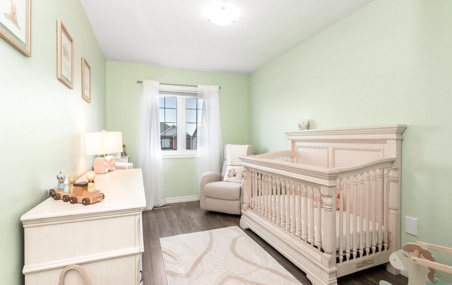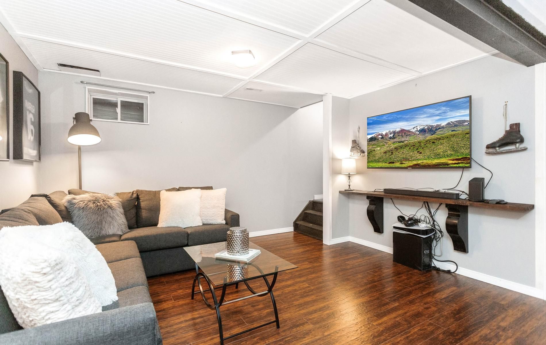 • Living room has laminate flooring and a big window for natural light.