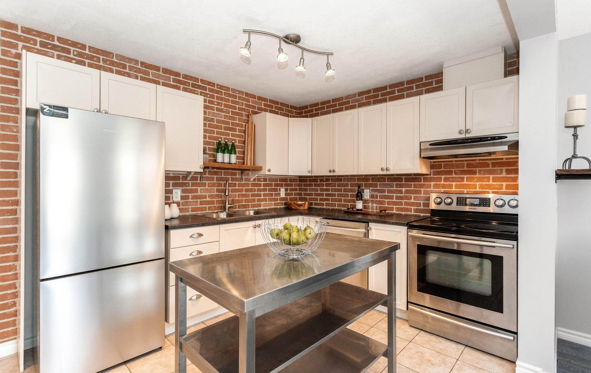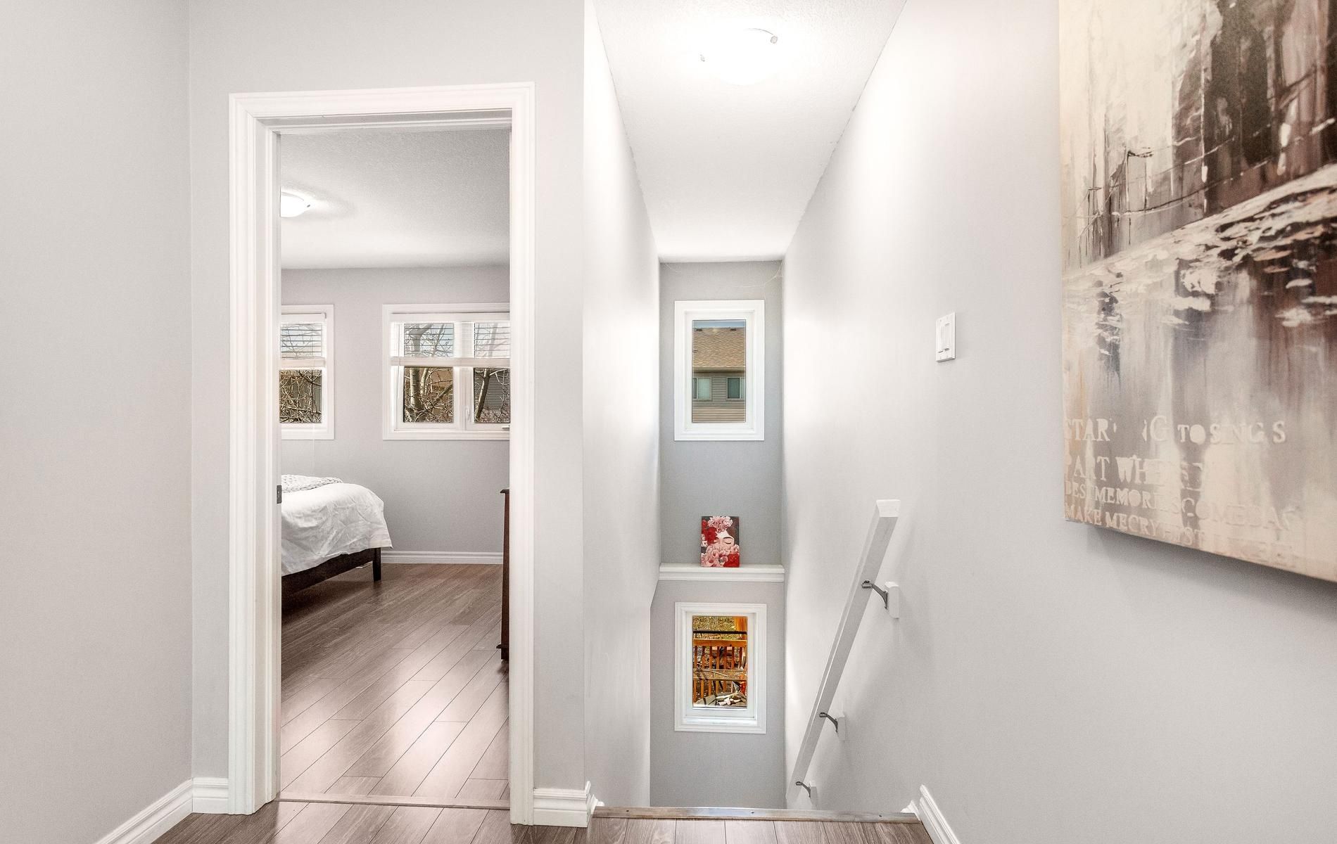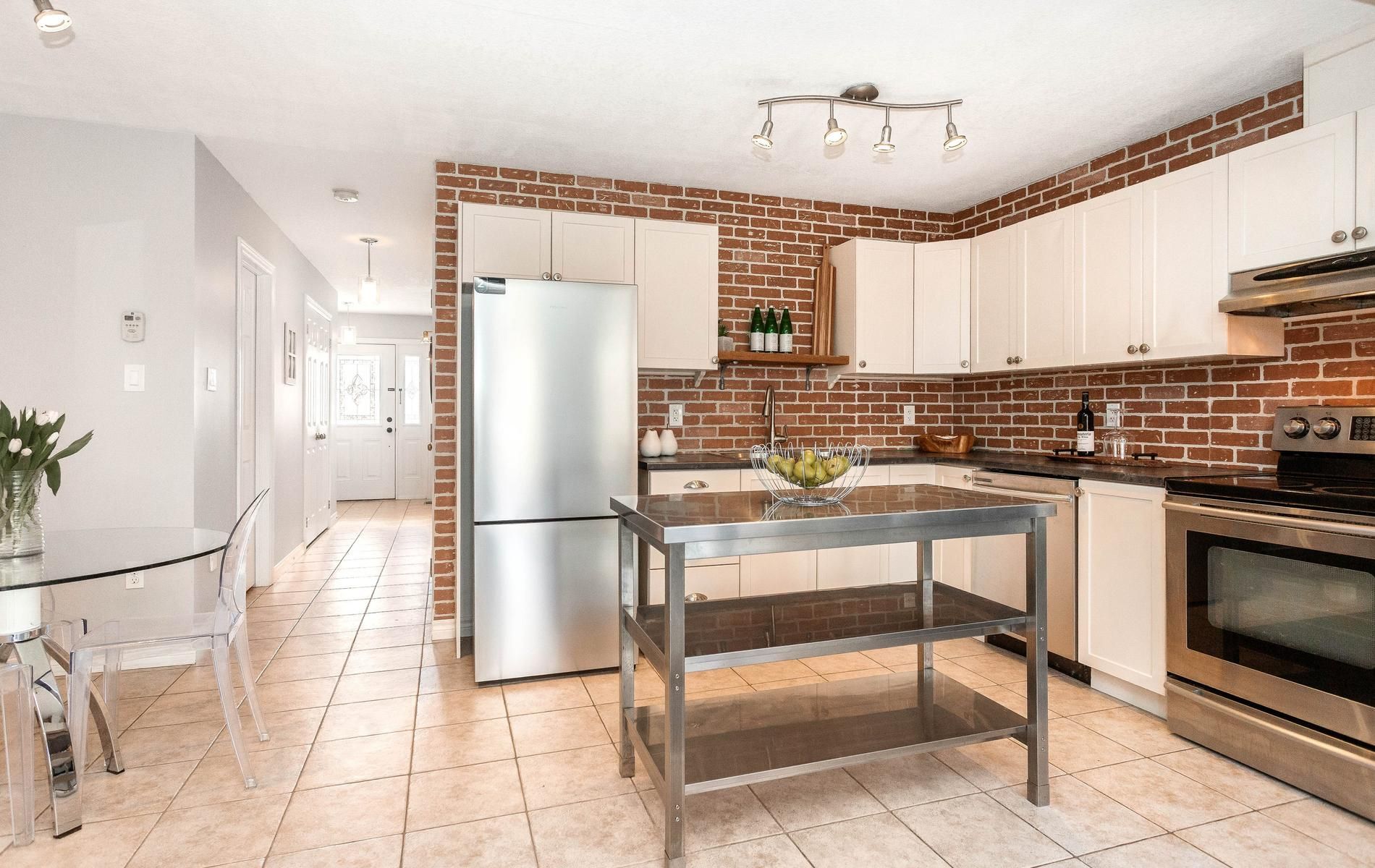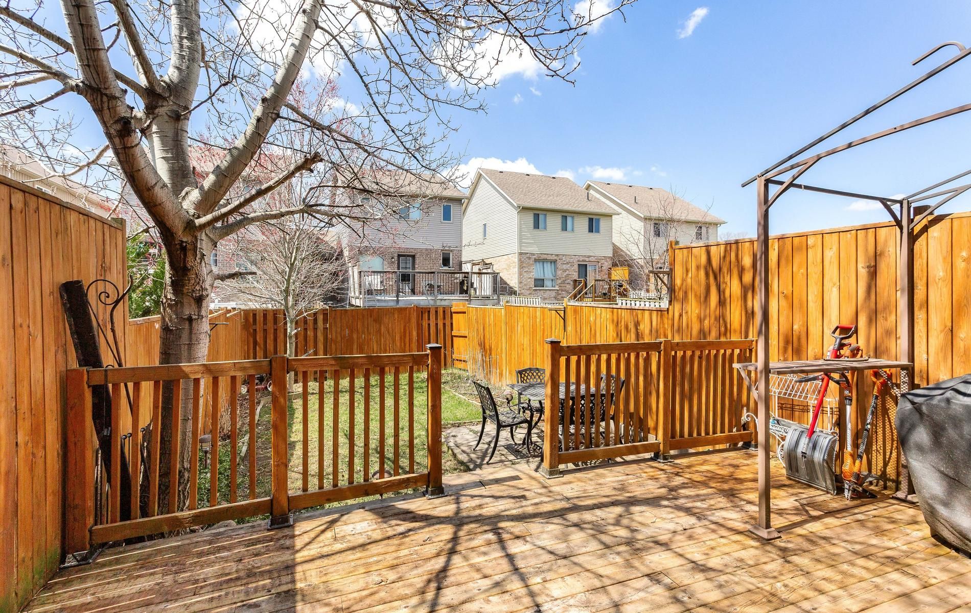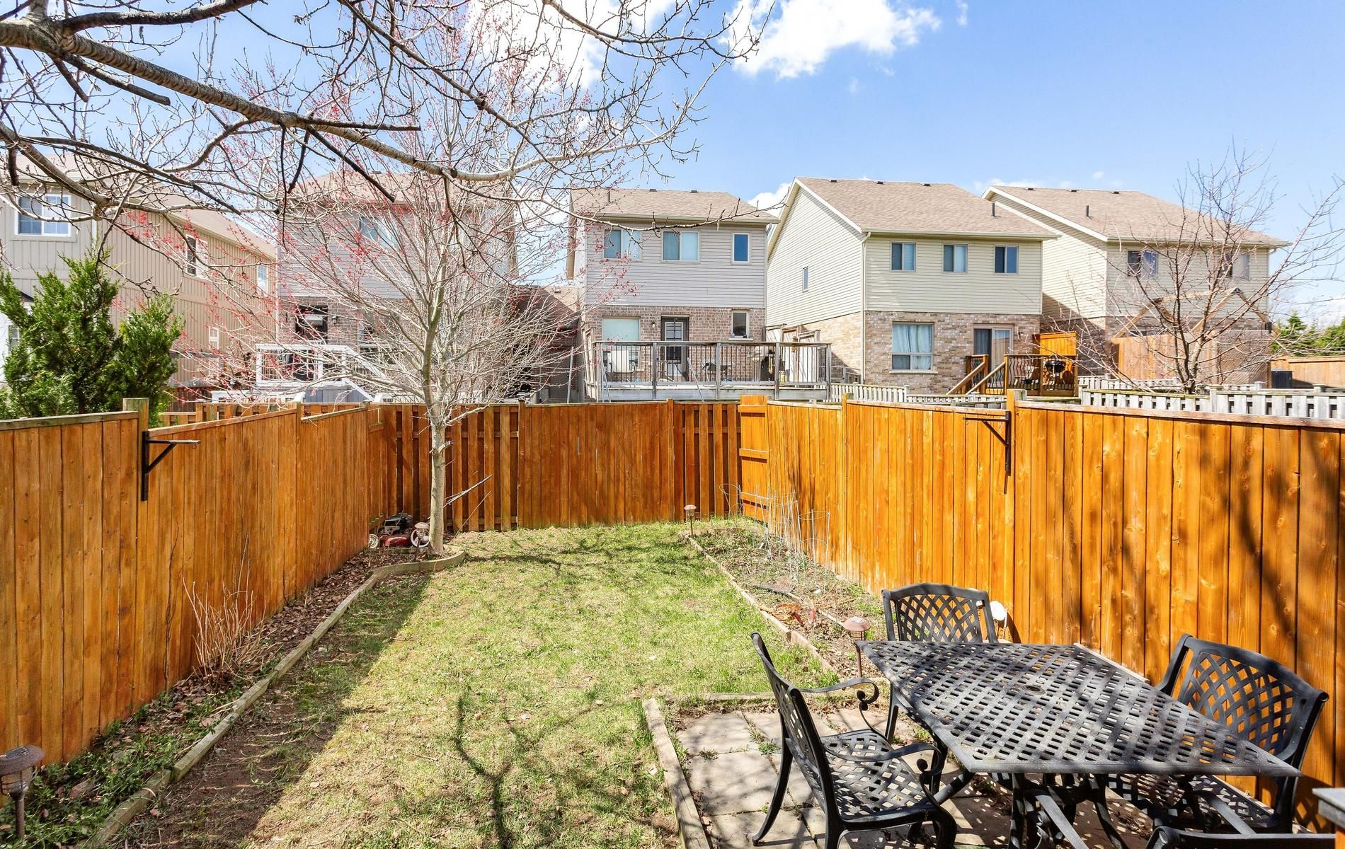 Inviting freehold townhome featuring an open concept main level offering an eat in kitchen w' white cabinetry, tile flooring, ss appliances, movable stainless steel island, urban chic backsplash & a custom wood shelf. The living room has laminate flooring, o/l's the fully fenced backyard, offers a walkout to the large deck and grill gazebo. (grill gazebo has frame only. Needs a top canopy). Also featured is a large window for plenty of natural daylight. The main level offers tile & laminate flooring (no carpet), has a convenient 2pc powder rm + interior access to the garage. Spacious upper landing leads to the primary bedroom offering his & her double closets, beautiful accent wall & 2 large windows. Two additional comfortably sized bedrooms have b/i closets & good size windows. The main 4pc washroom is spacious & offers neutral tile flooring, modern vanity & soaker tub. Finished rec room for additional living space & entertaining offers a built in bar area with shelving + a stylish rolling barn door! Great space to entertain family & friends. The lower level also houses a laundry room & storage space. Roof shingles 5/2025, located close to shops, restaurants, cafe's, schools, dog park, public trans. And loads of amenities! Convenient access to highways 10 & 9.