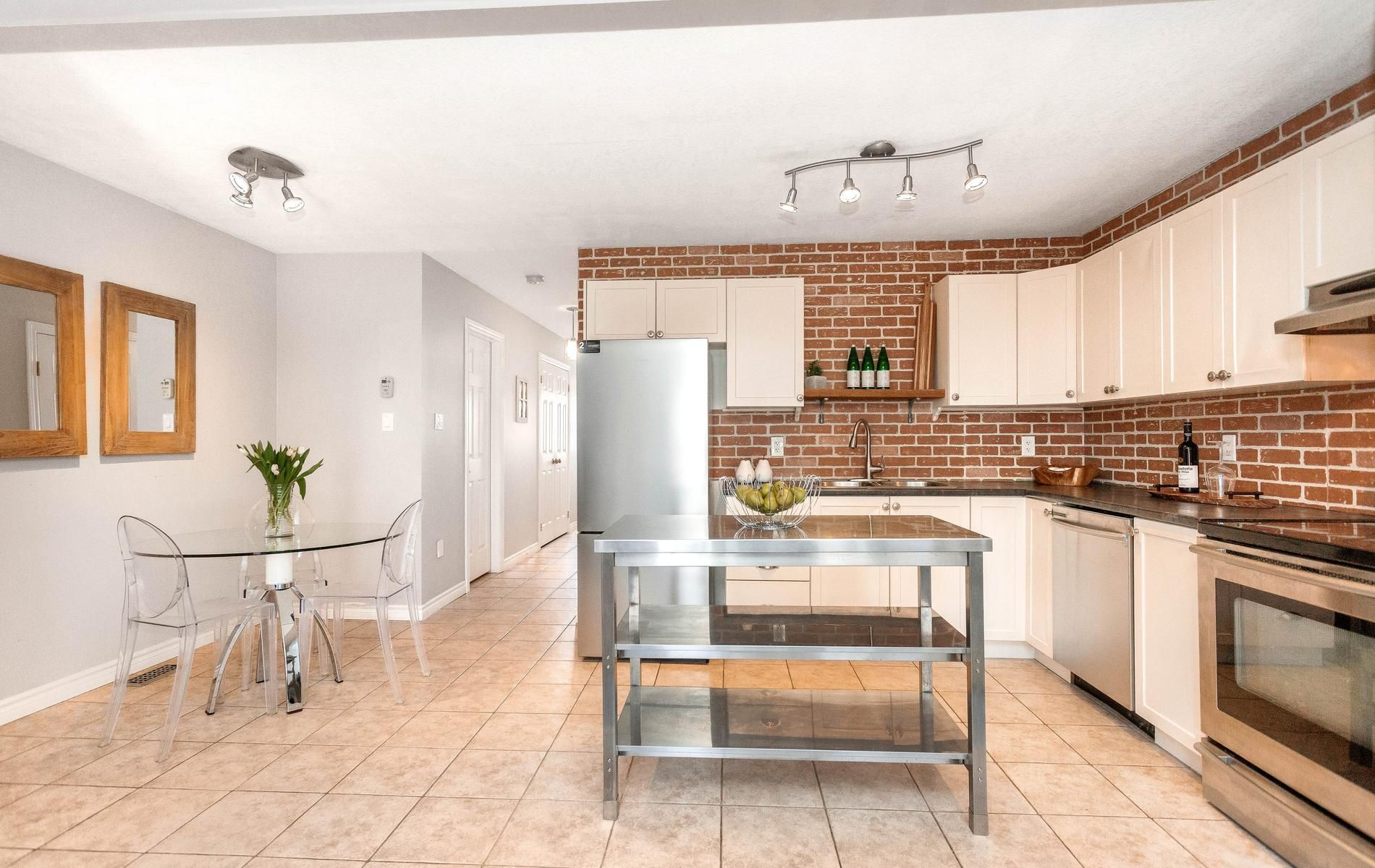 • Eat-in kitchen boasts stainless steel appliances and stylish cabinetry.
