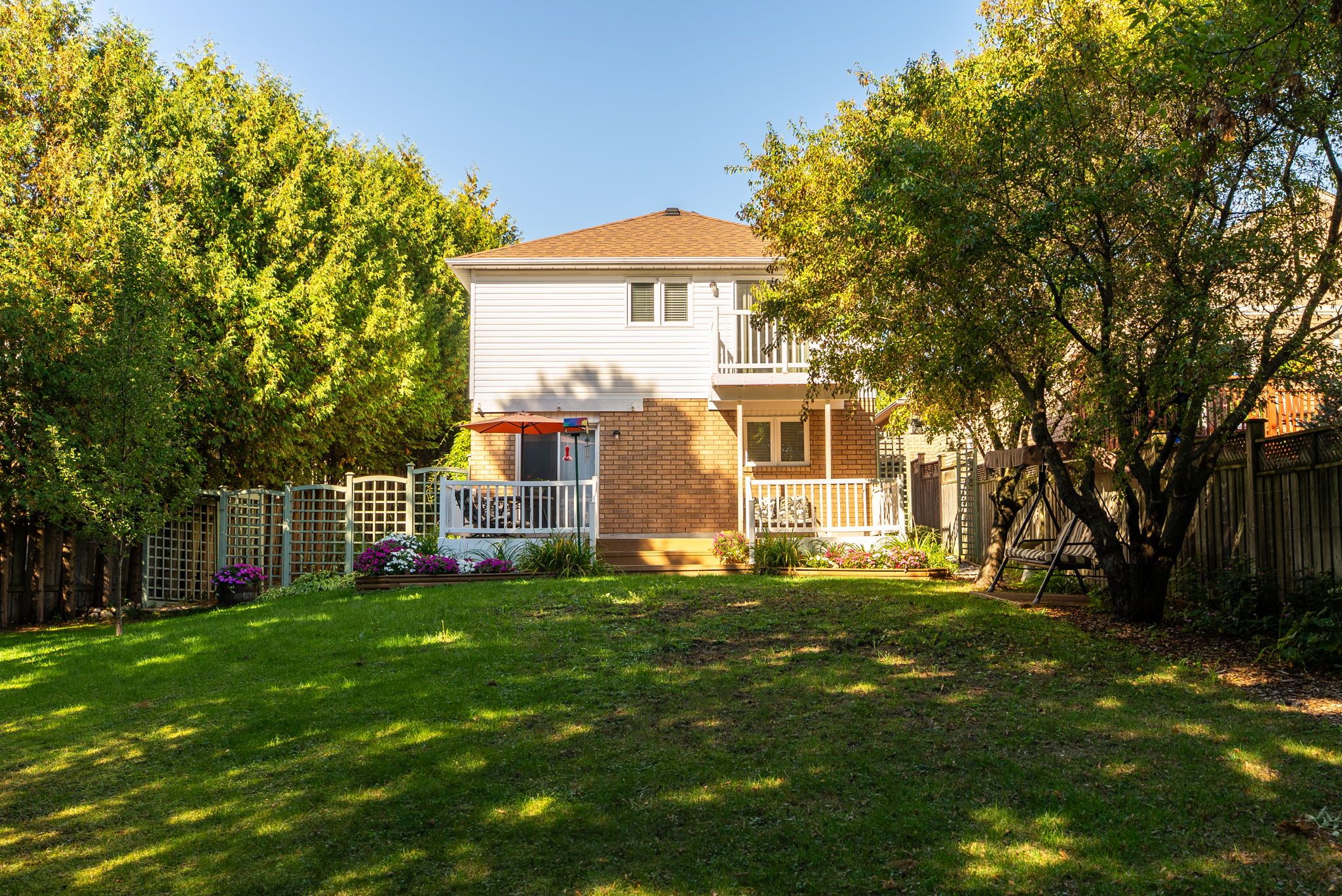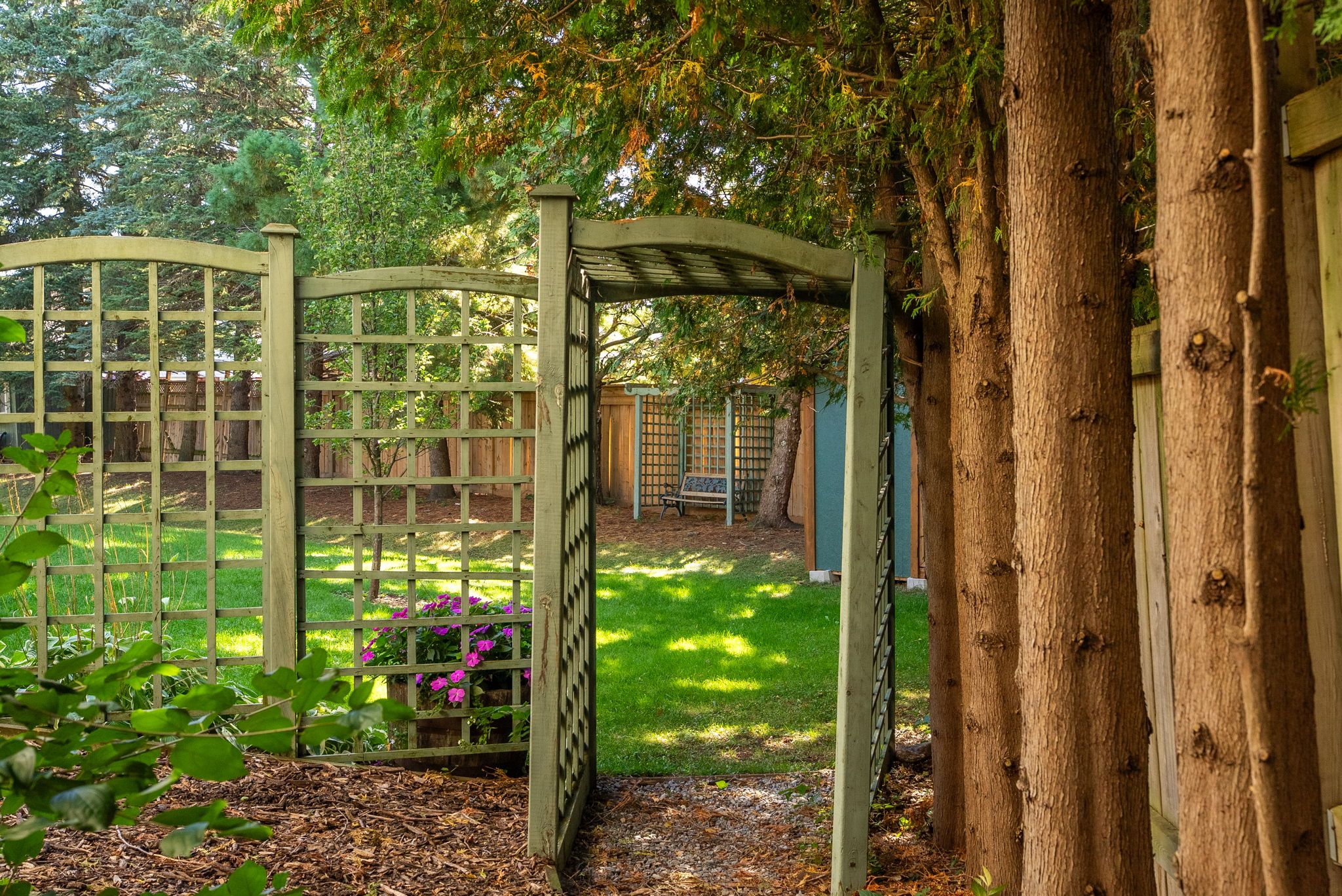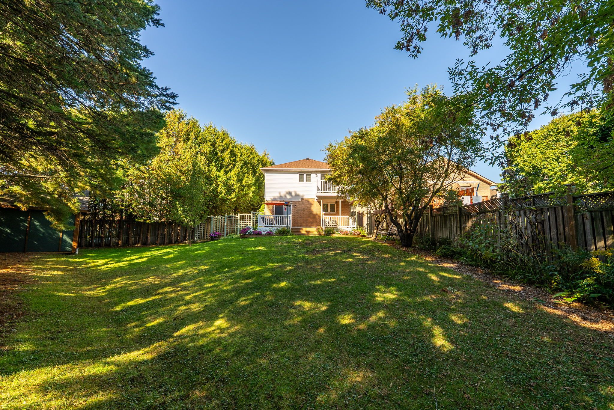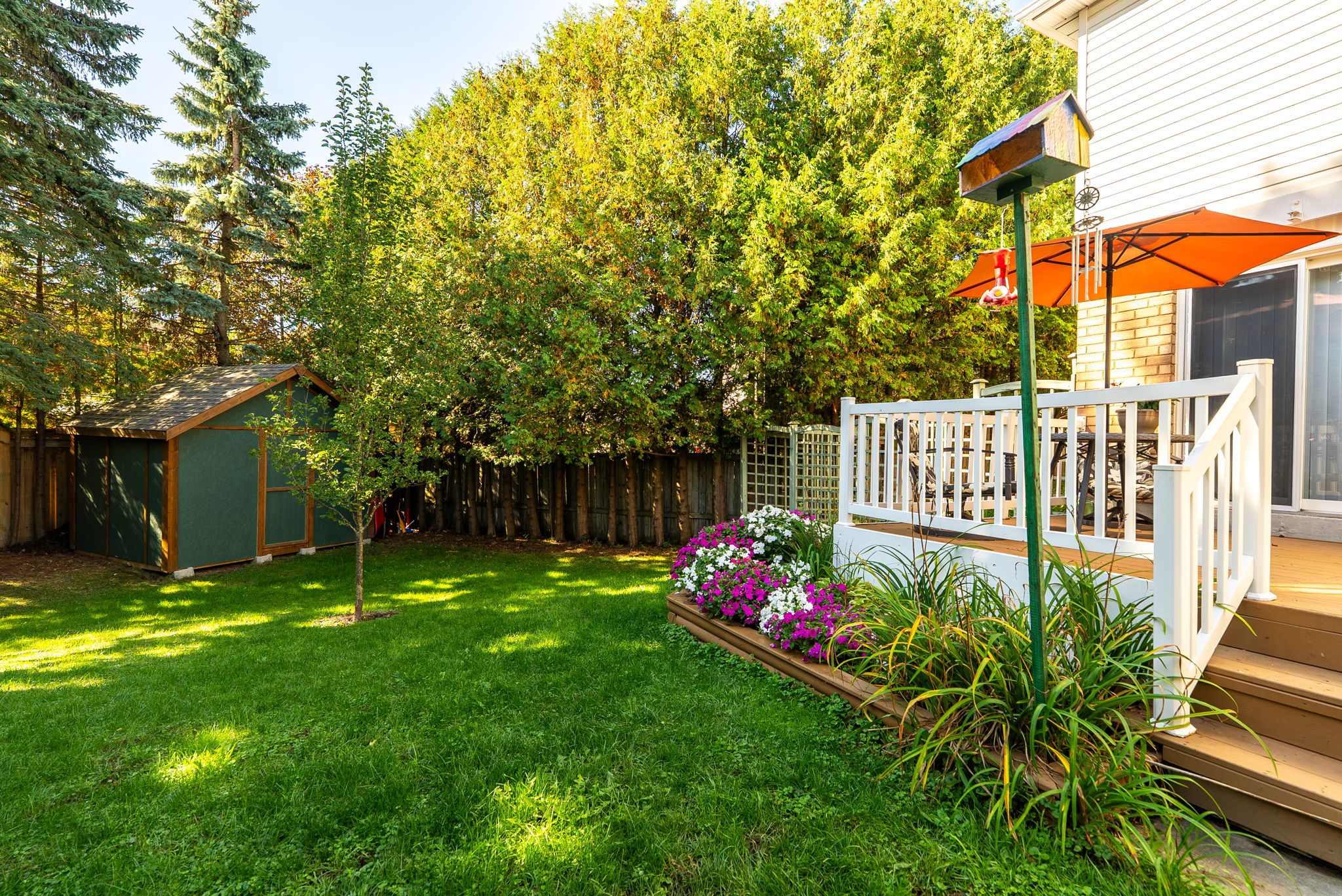 • Private backyard oasis surrounded by mature trees and lush gardens.