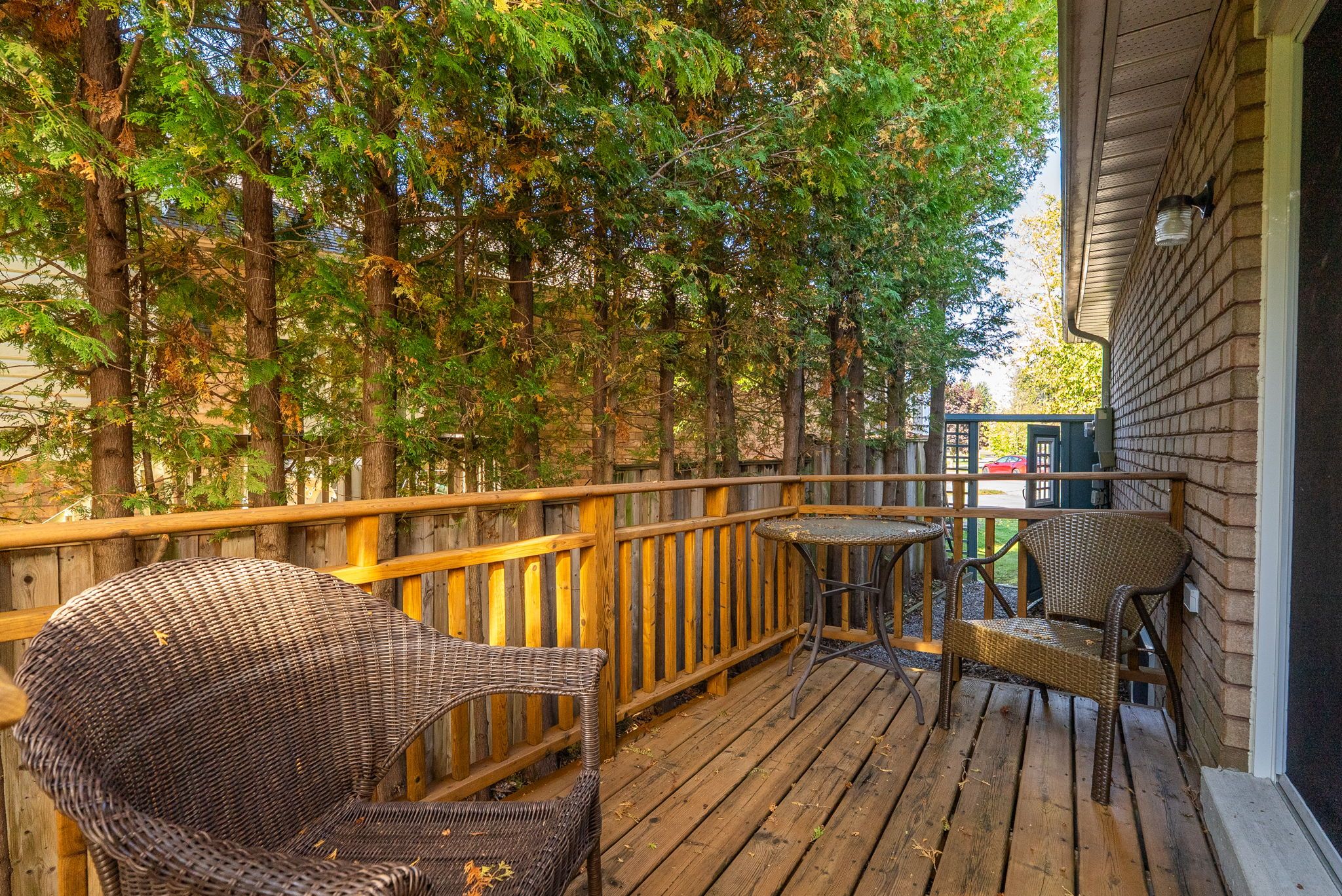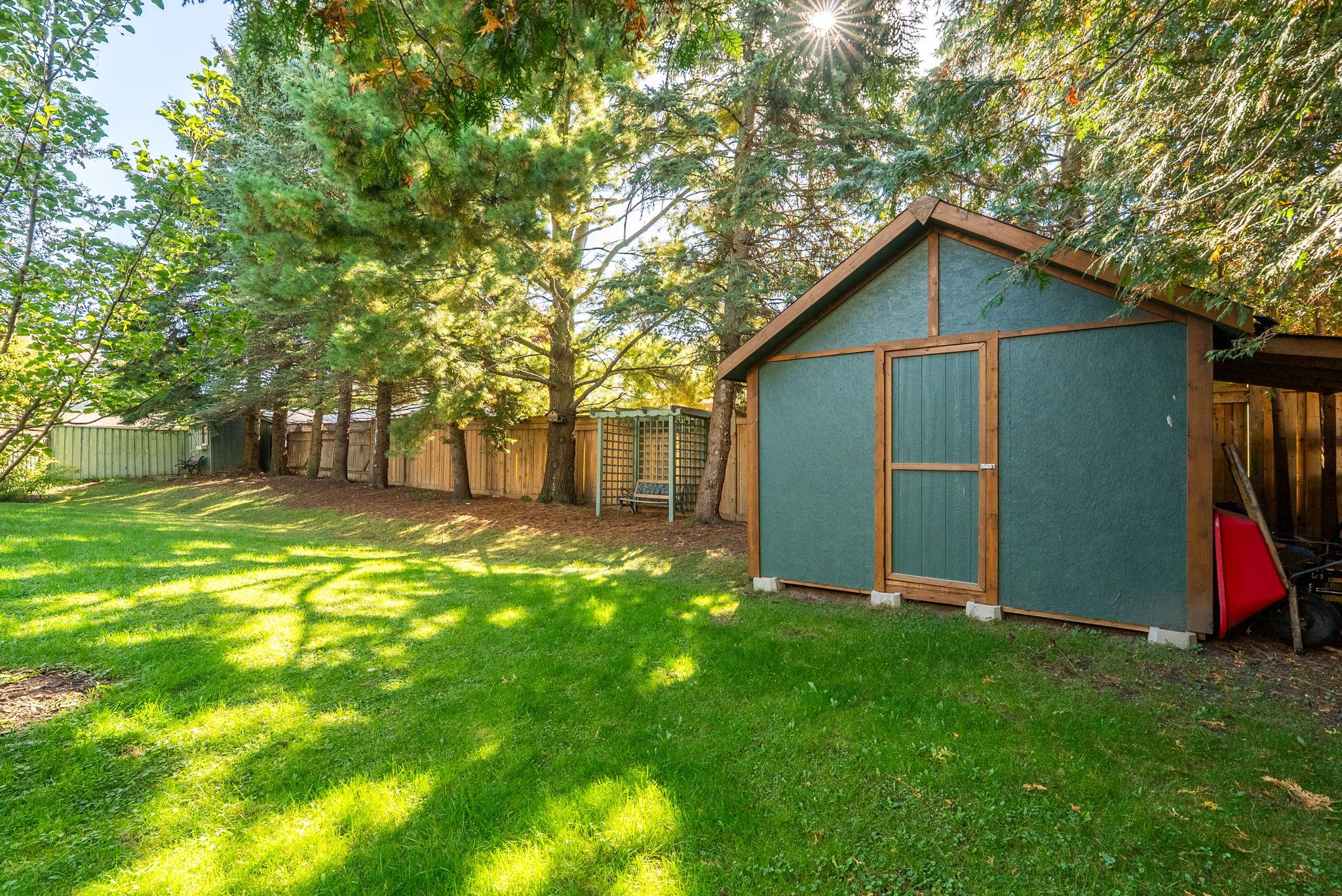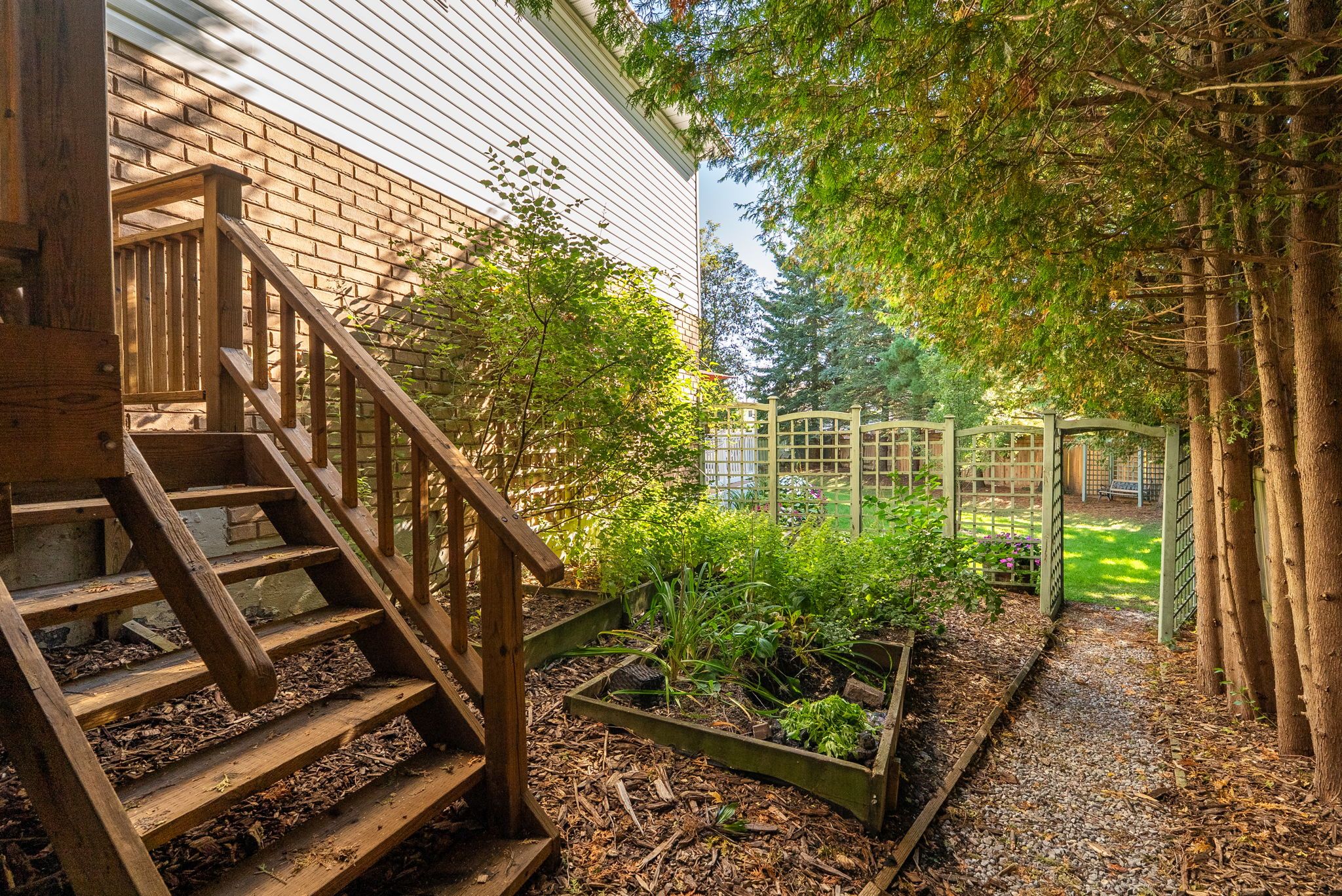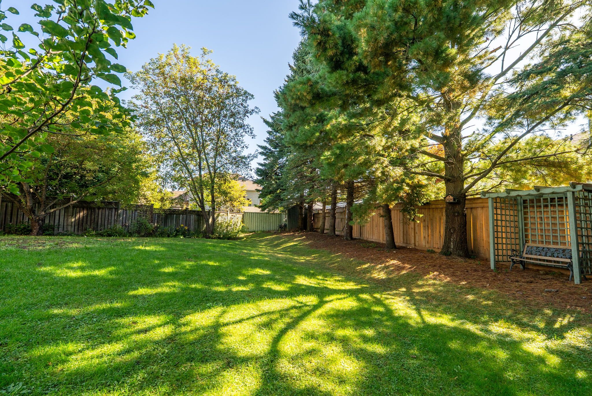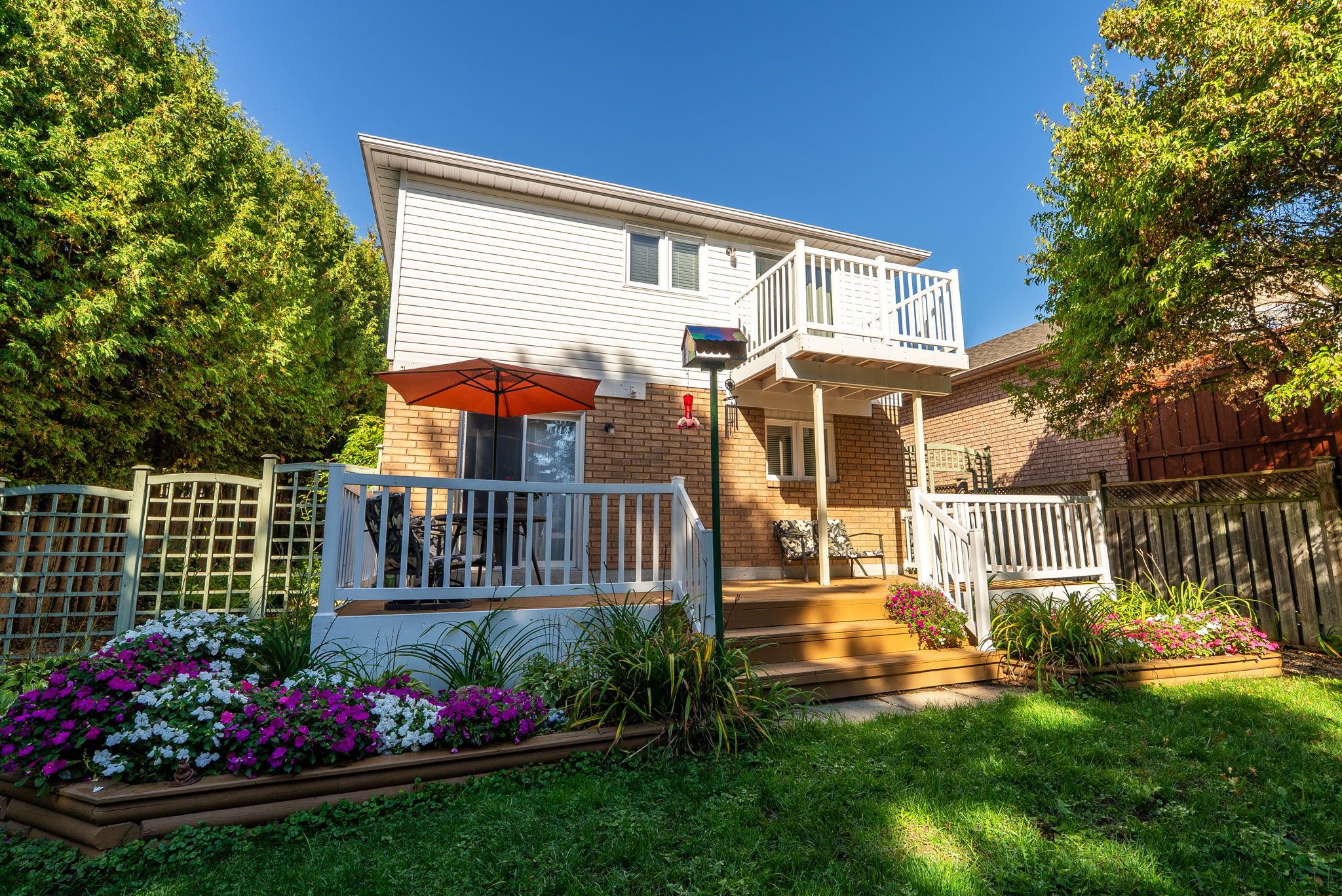 • Private backyard oasis surrounded by mature trees and lush gardens.