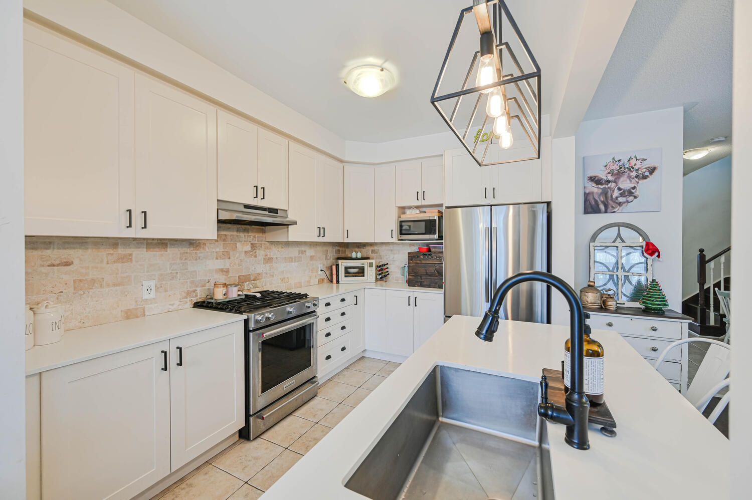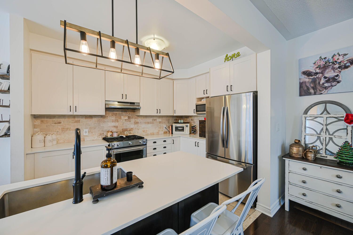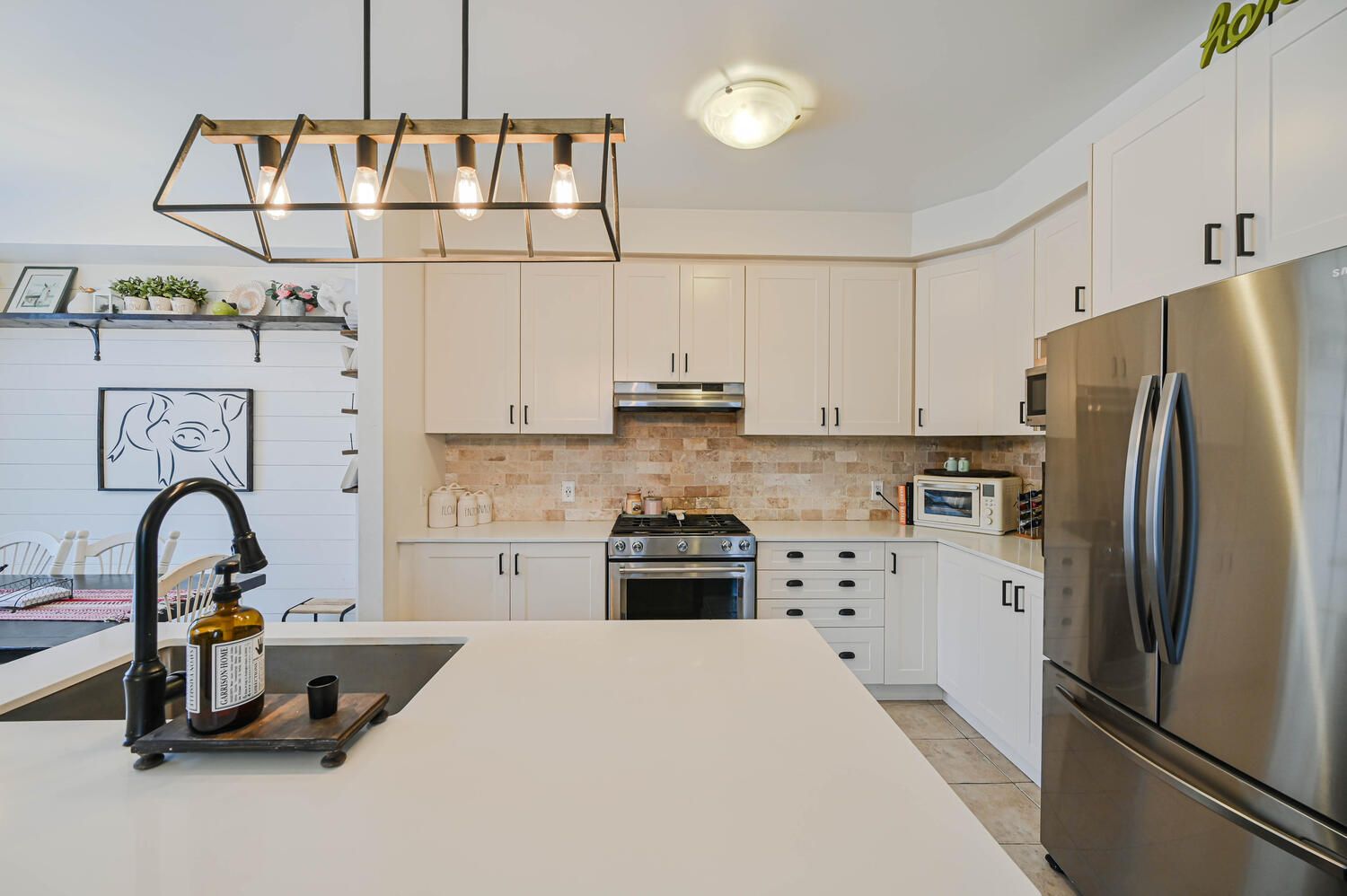 • Elegant open-concept design with modern eat-in kitchen and stainless steel appliances.