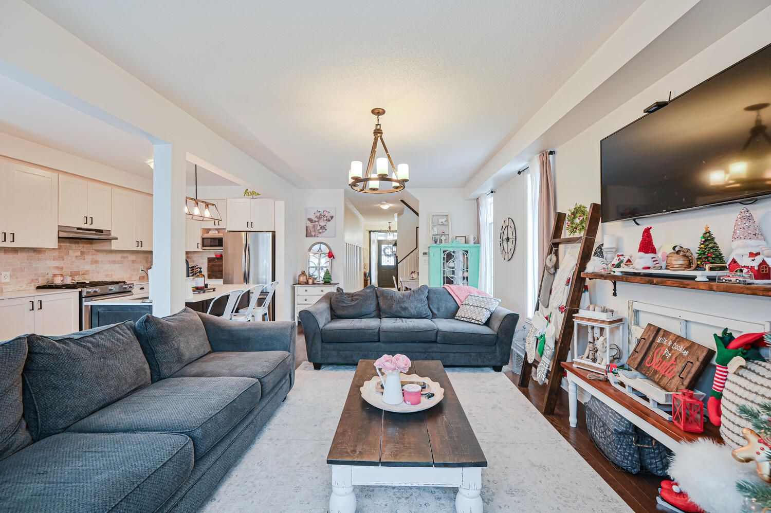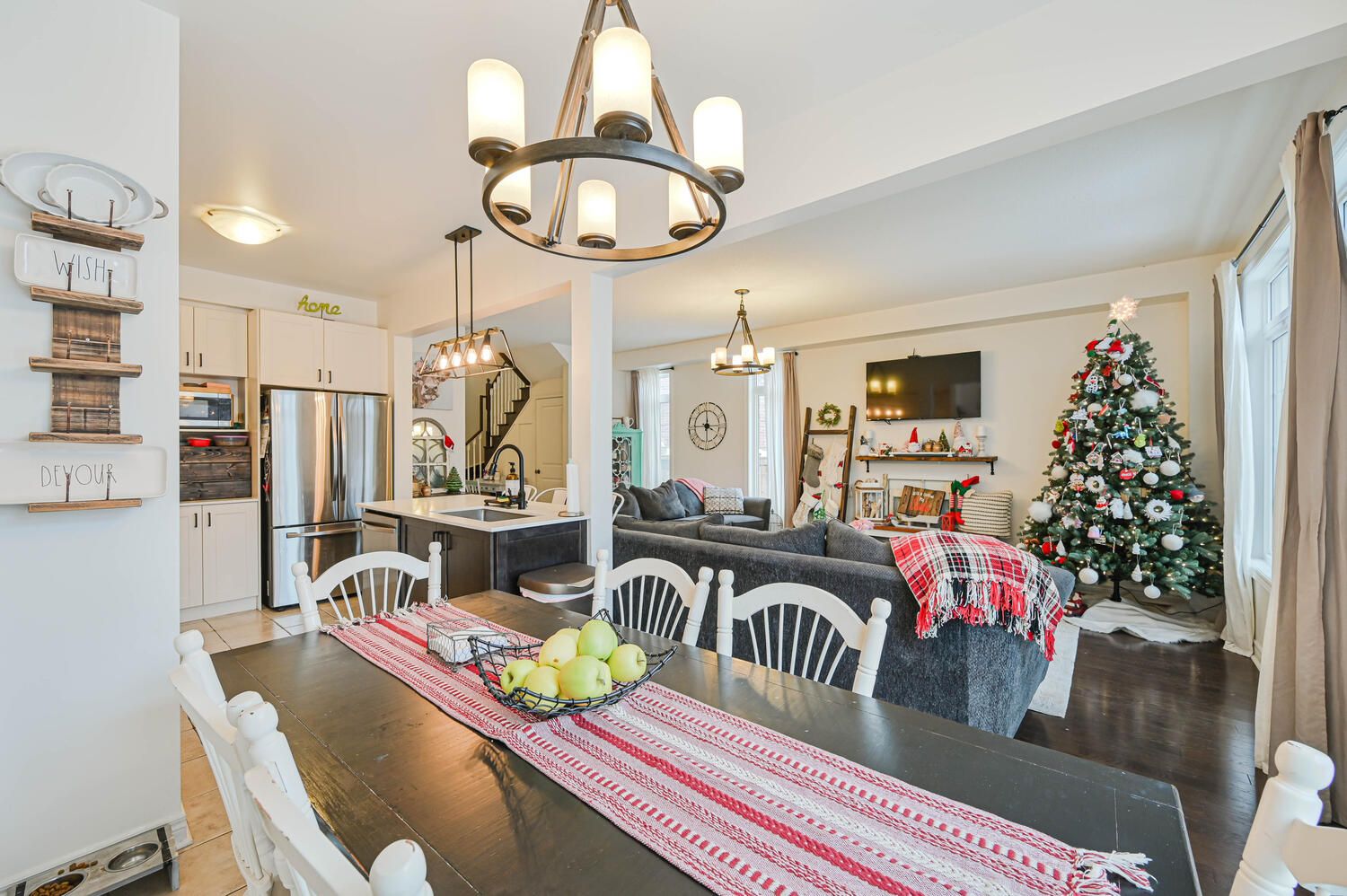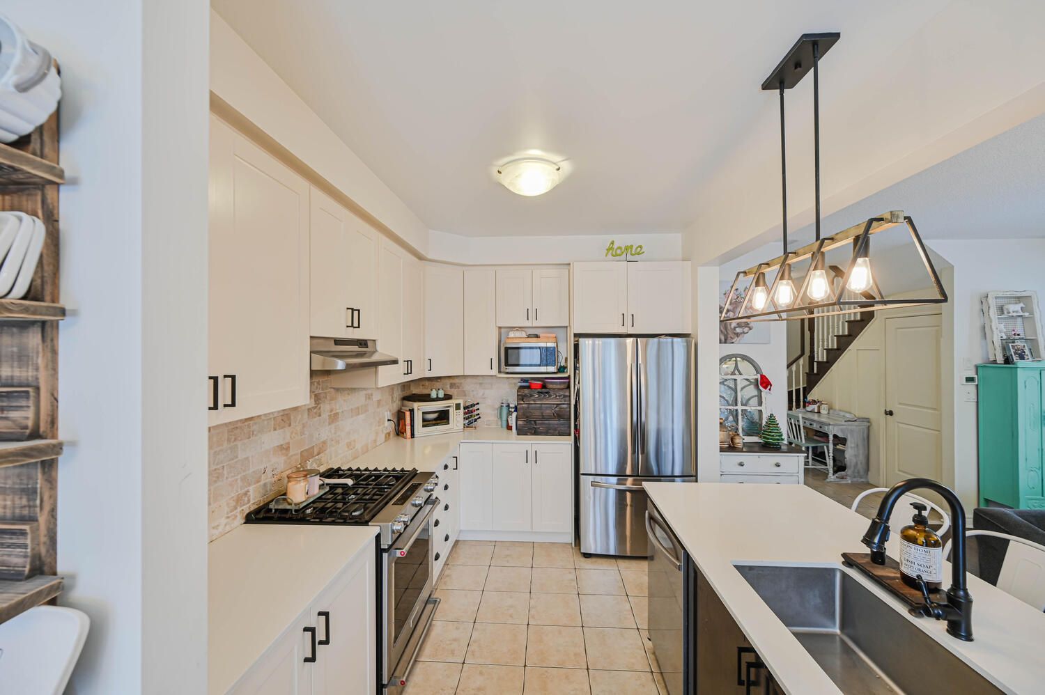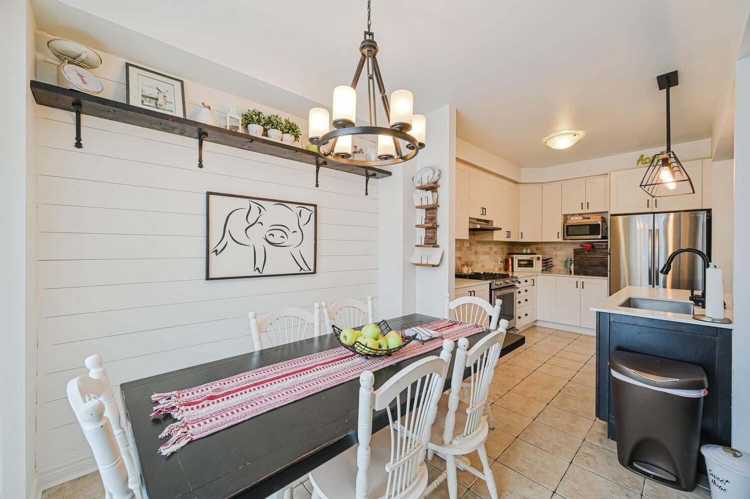 • Elegant open-concept design with modern eat-in kitchen and stainless steel appliances.