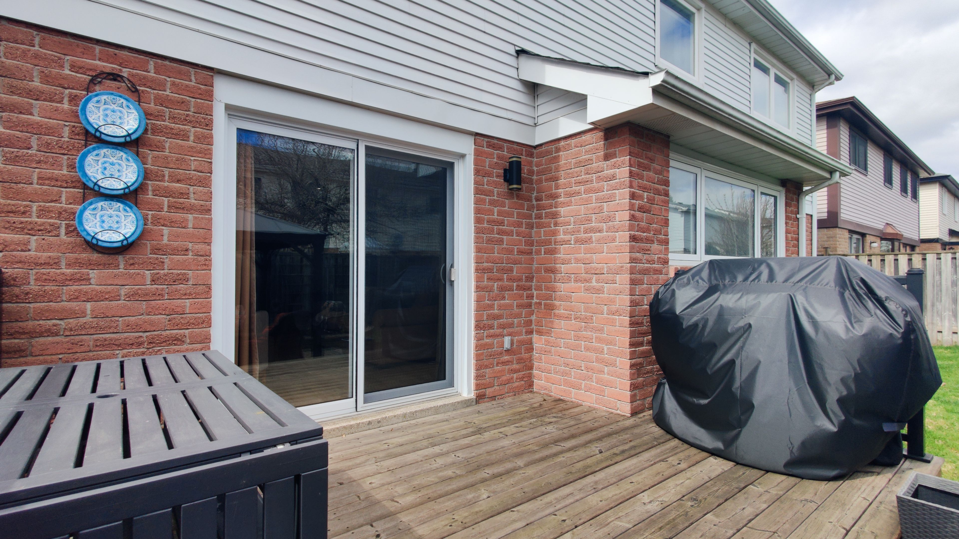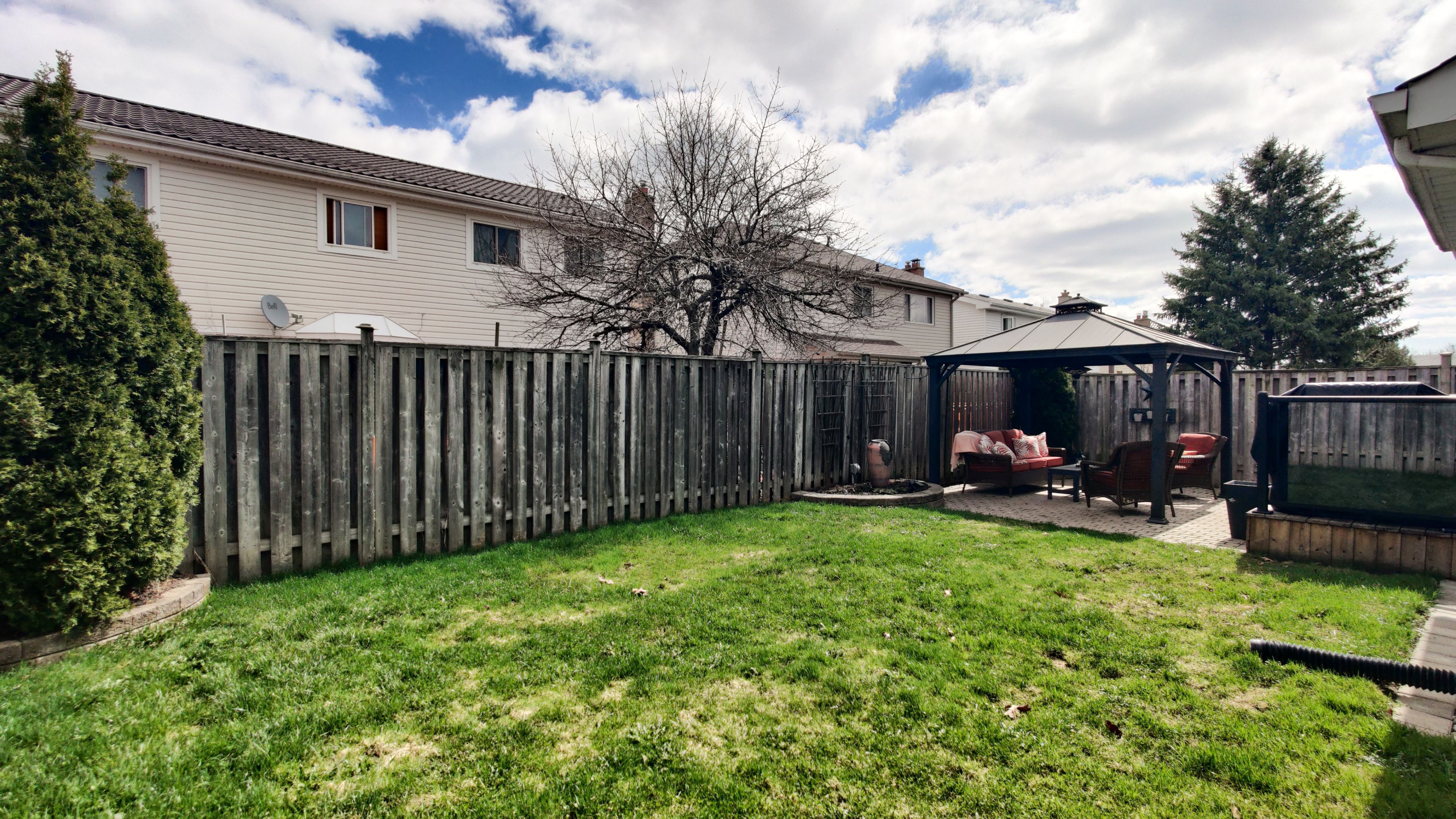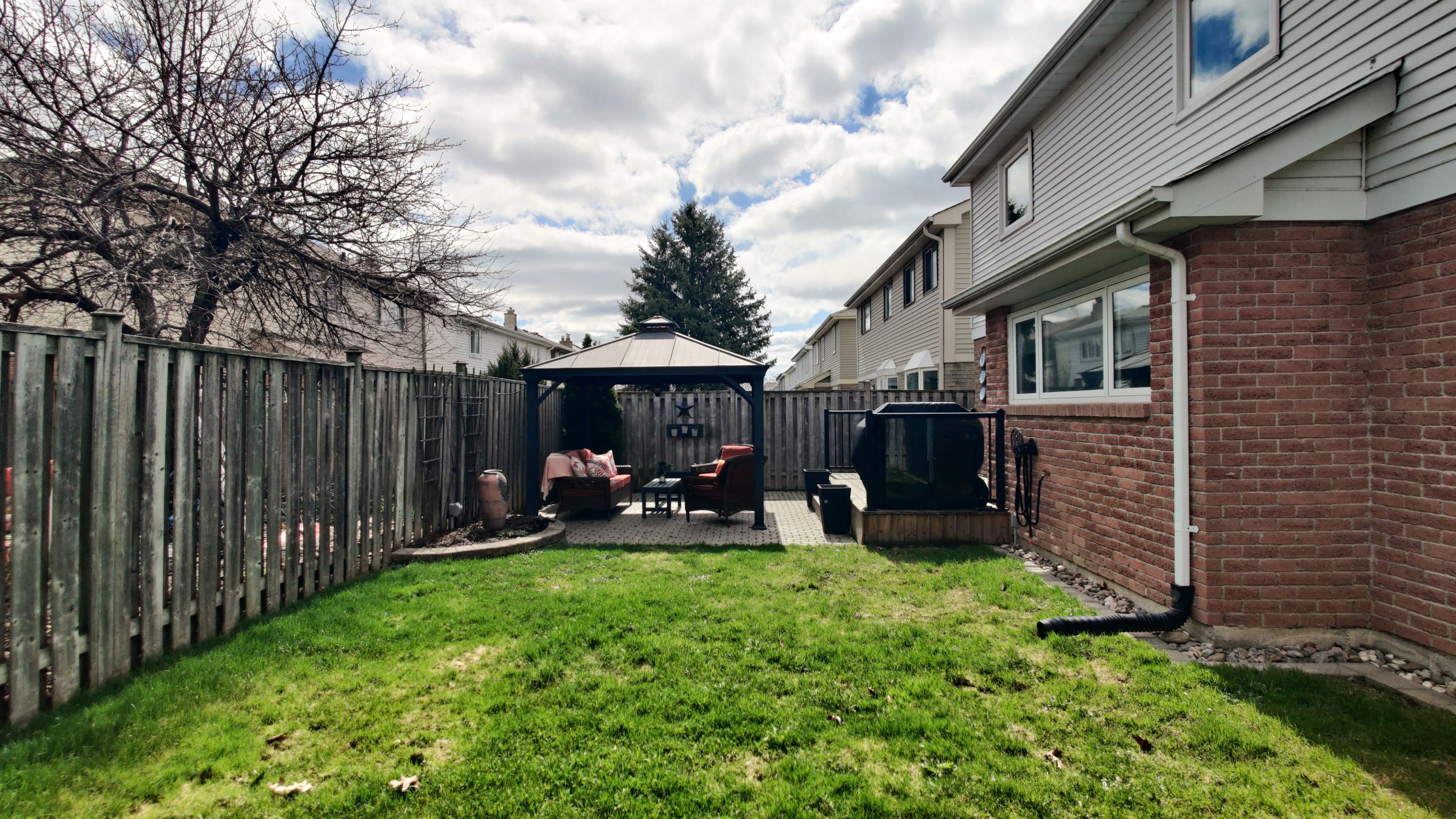 • Private fenced backyard with a deck, stone patio, and gazebo.