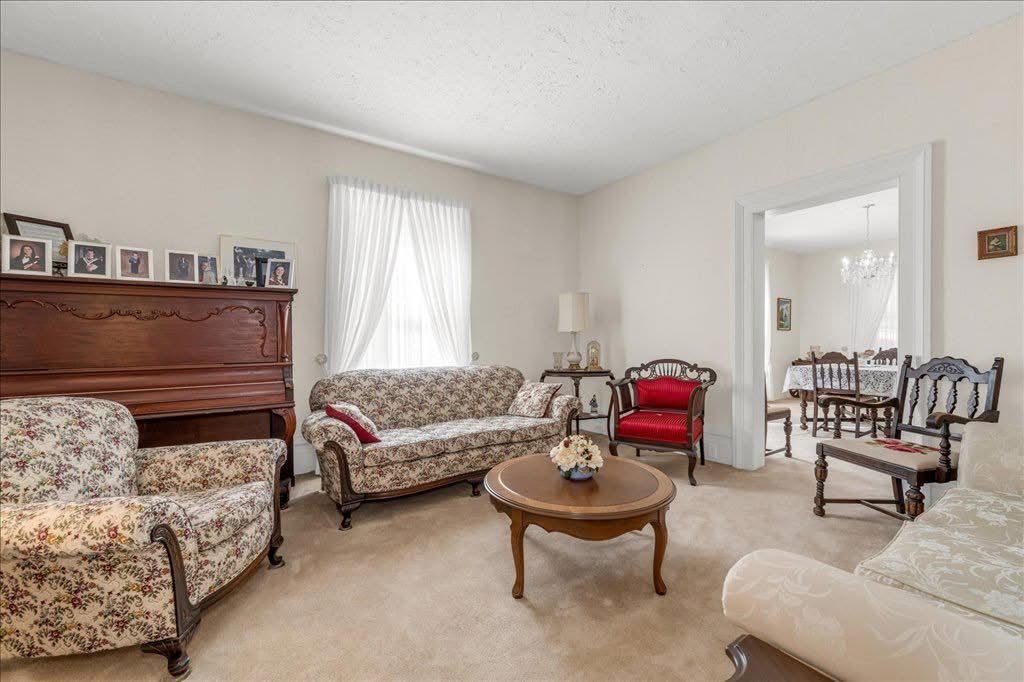 • Cozy living room with an electric fireplace, original wood fireplace intact.
