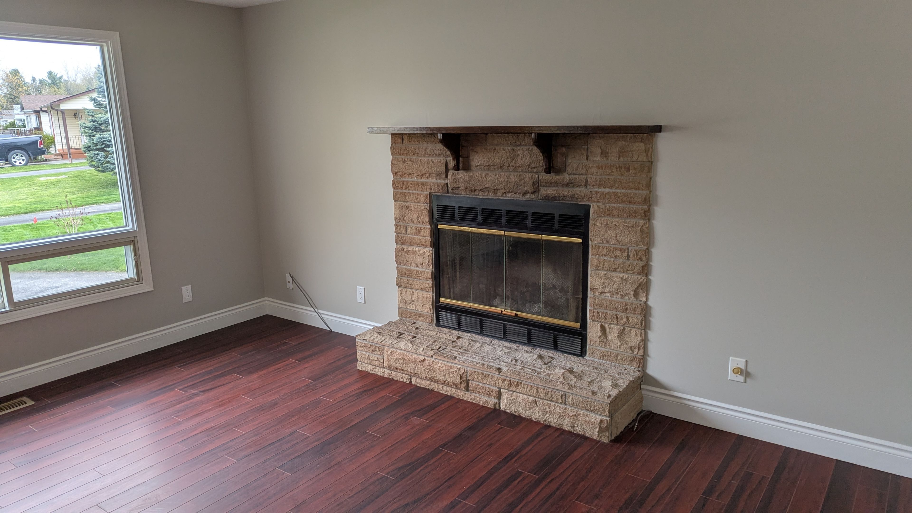 • Generous living and dining area with picture windows and a fireplace.