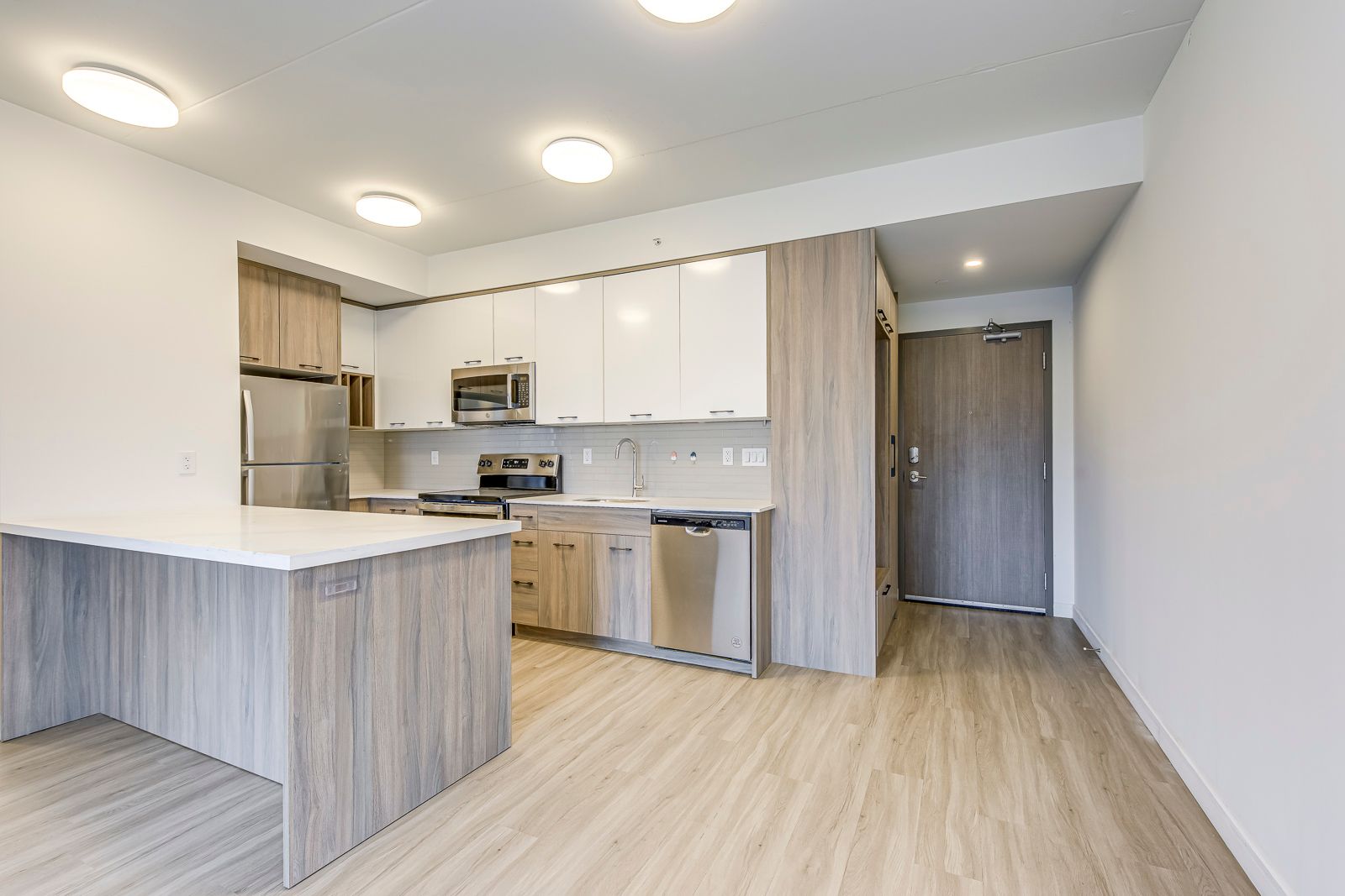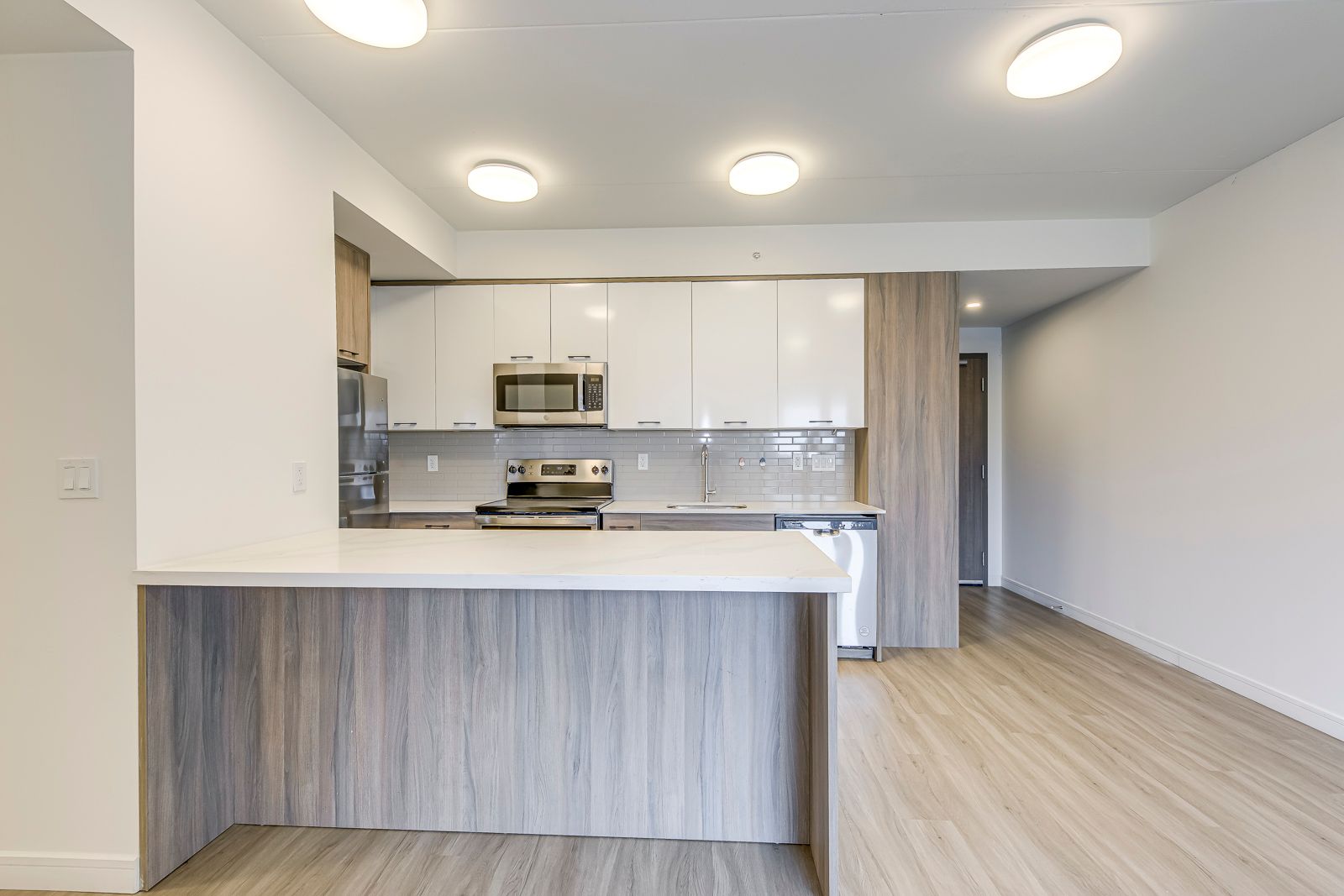 Welcome to the beautiful wayfarer suite at walnut place. This spacious 898 sq. Ft. Apartment opens with a welcoming foyer and built-in closets. The primary bedroom offers peaceful northern lake views and a private 3-piece ensuite. Large windows throughout the suite fill every room with natural light. Two additional generously sized bedrooms, a modern 4-piece bathroom, and in-suite laundry add to the comfort and convenience. The kitchen features stainless steel appliances, abundant cabinetry, an island, and an open-concept layout that flows seamlessly into the living area. Step out from the living room onto the west-facing balcony and enjoy sunset views over the city. Stylish, bright, and ideally located-this is downtown living at its best.