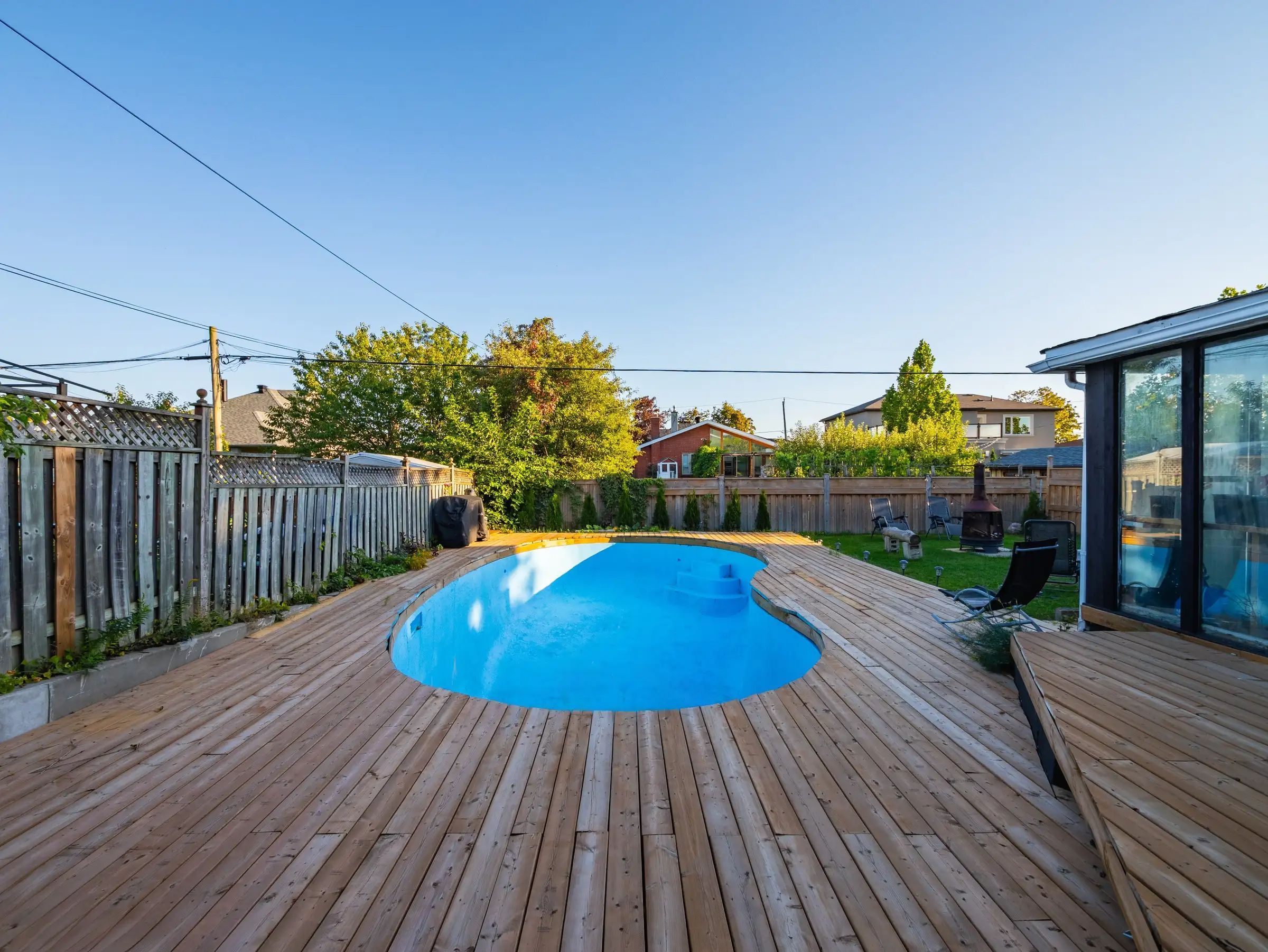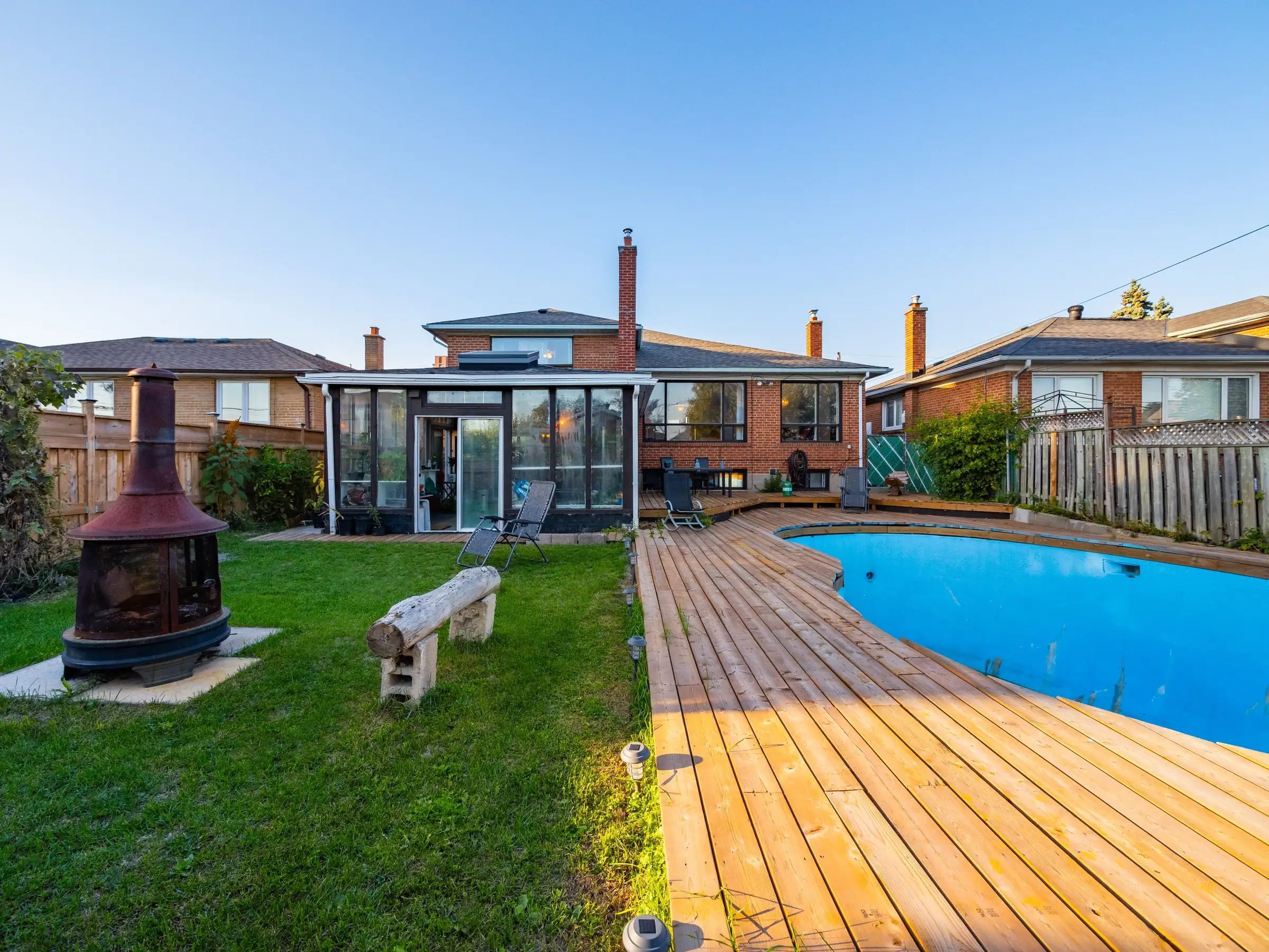 • Private backyard oasis with a large deck, in-ground pool, and solarium.
