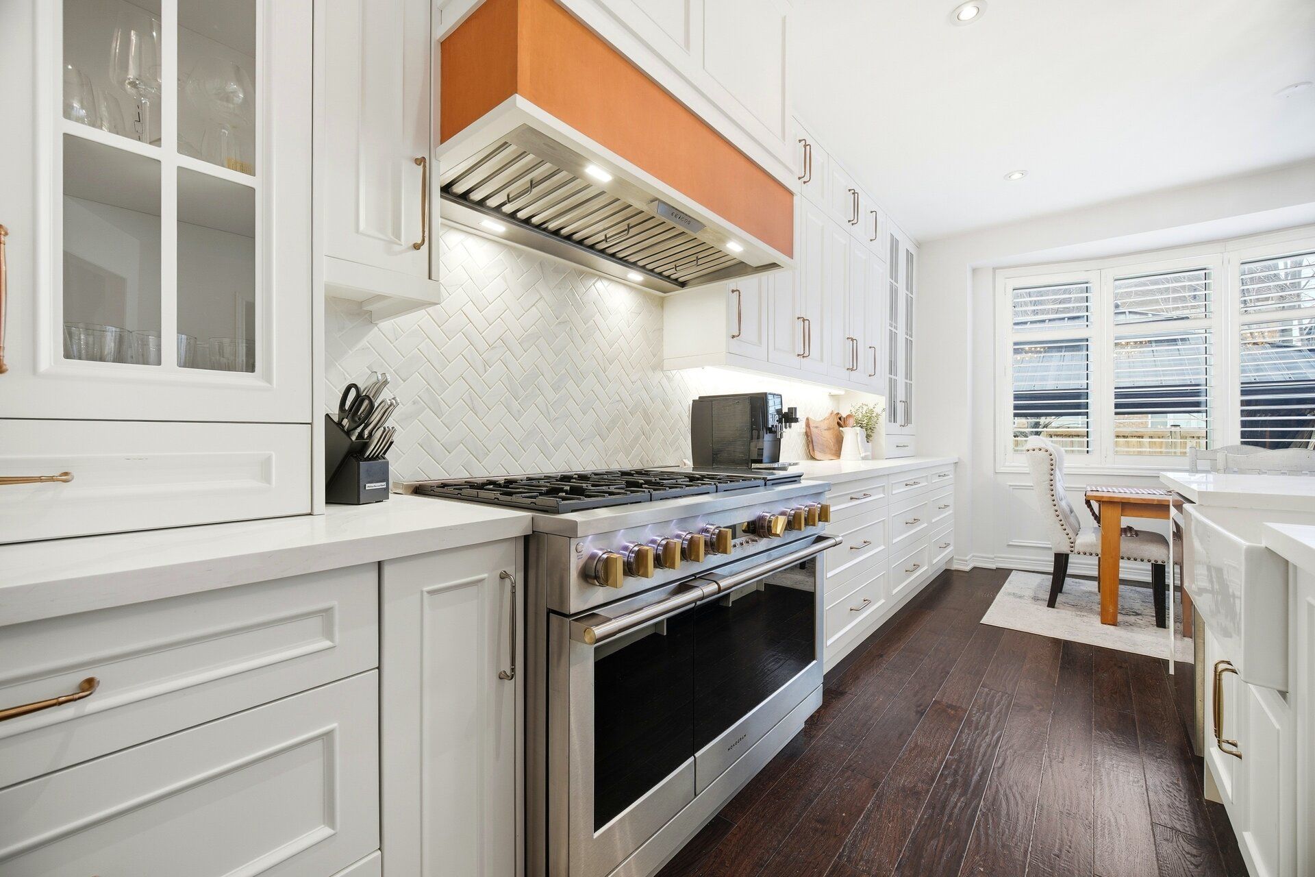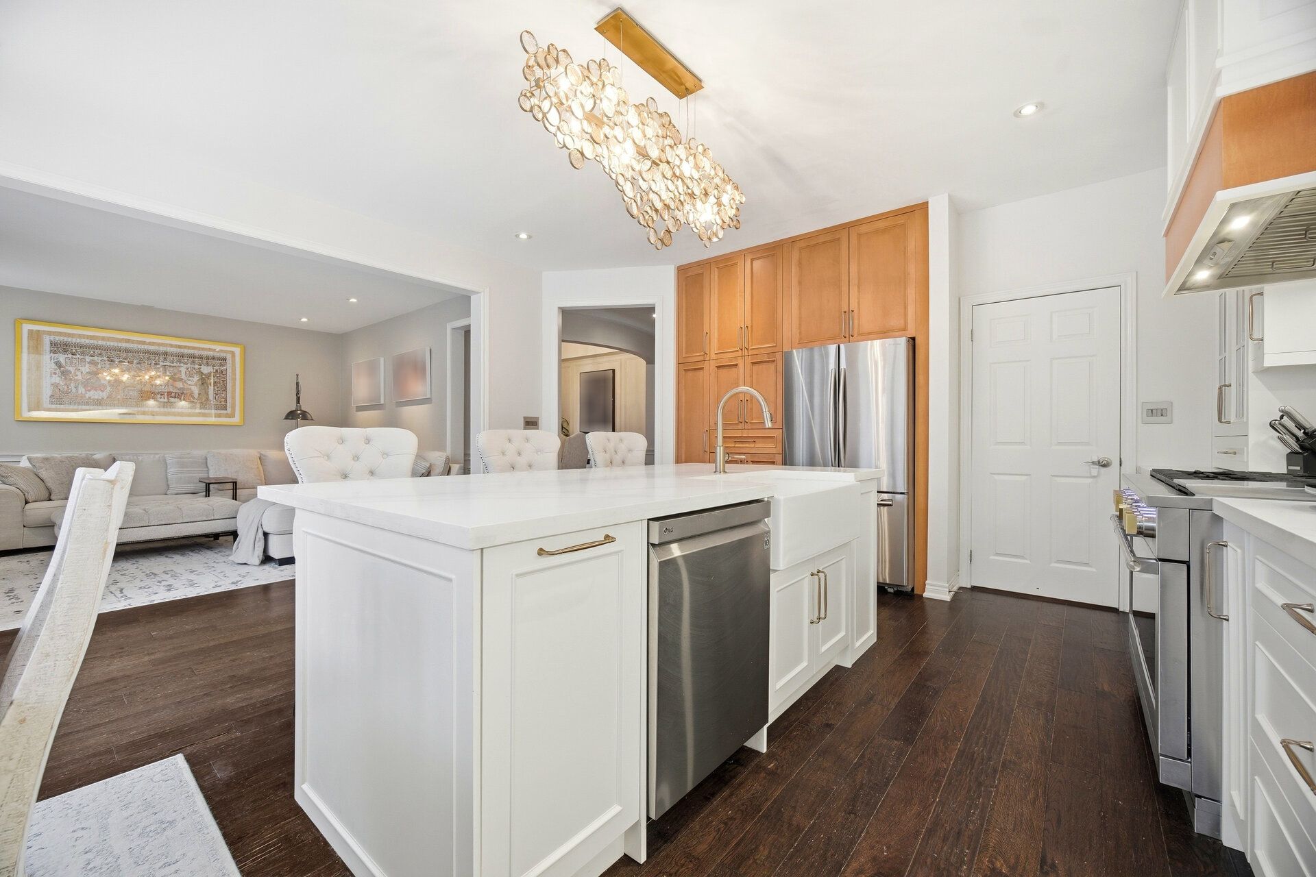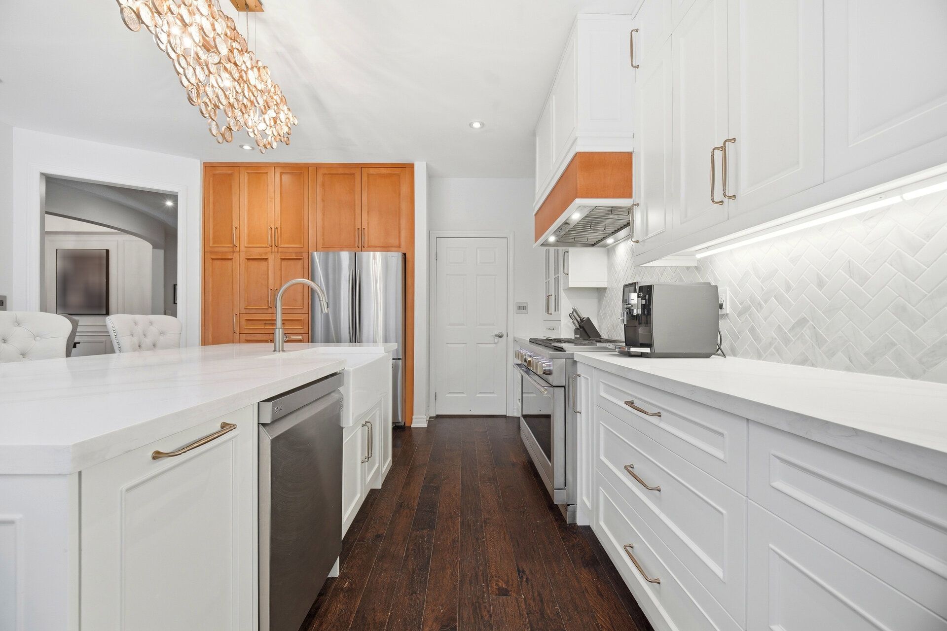 • High-end kitchen featuring quartz countertops and stainless steel appliances.