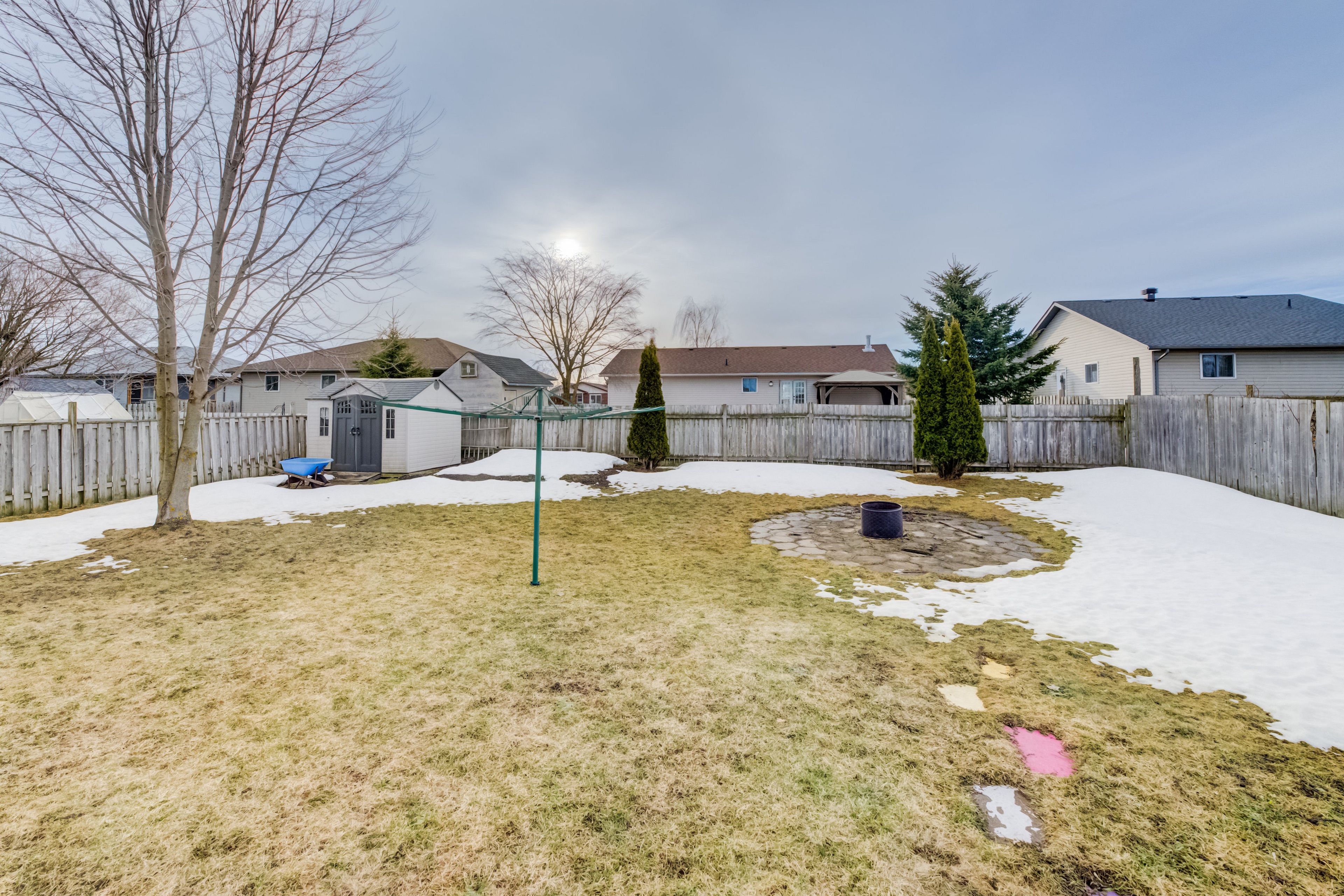 • Fully fenced backyard features a deck, firepit, and storage shed.