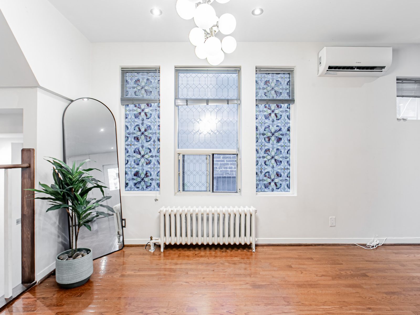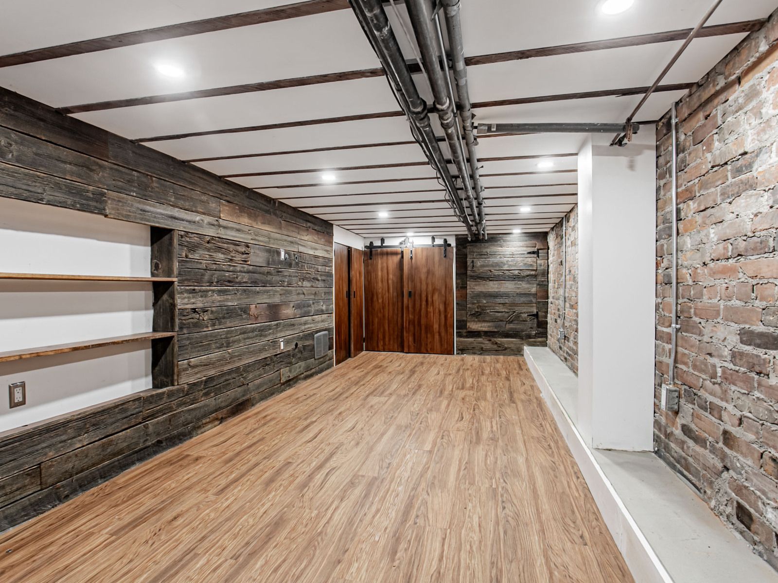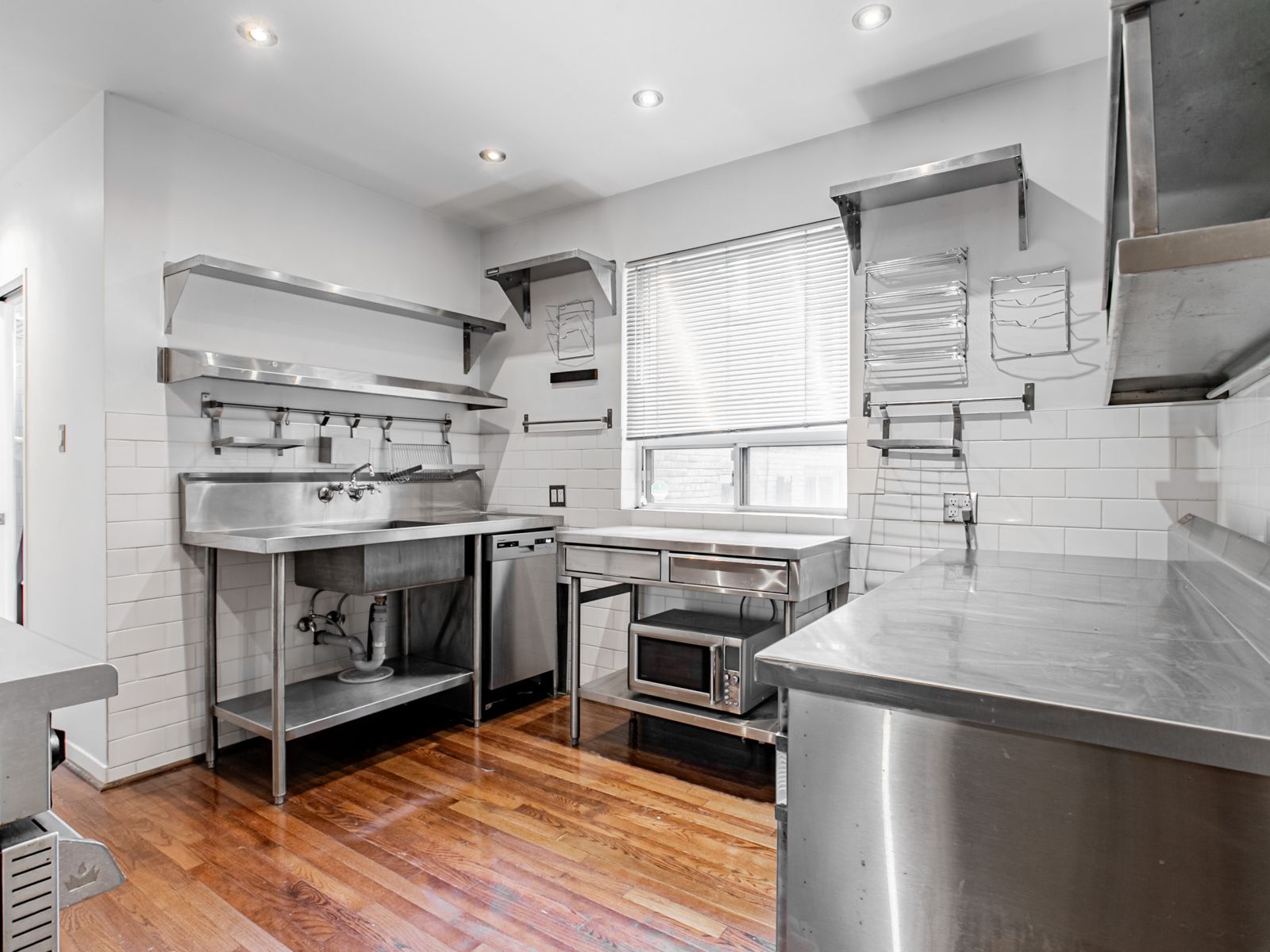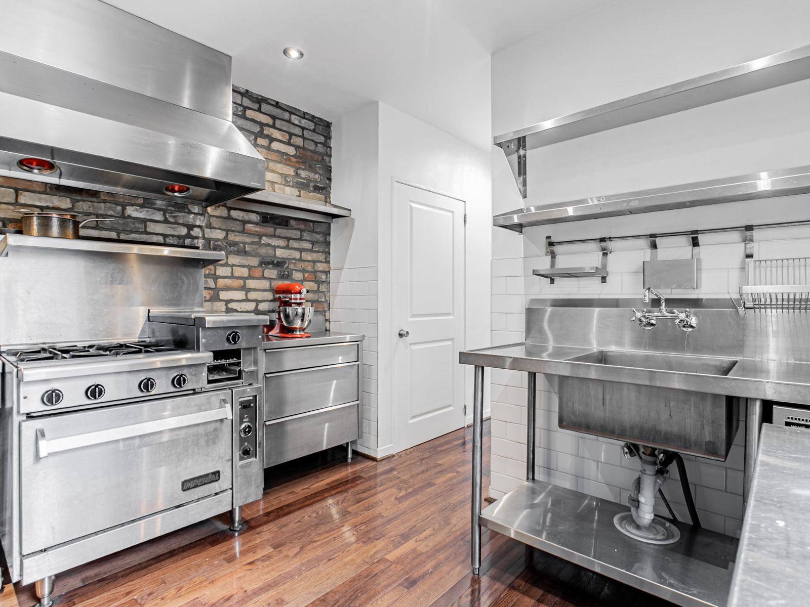 • Bright open-concept layout with original exposed brick and hardwood floors.