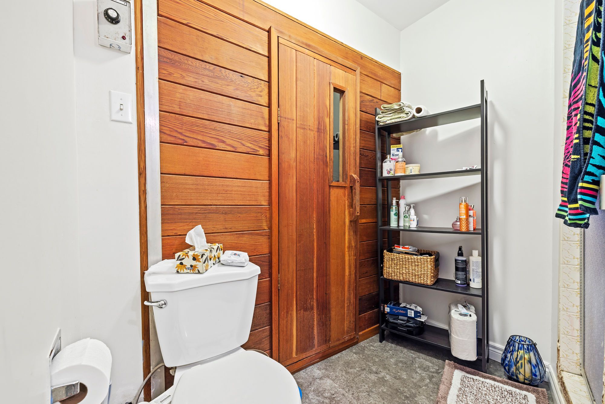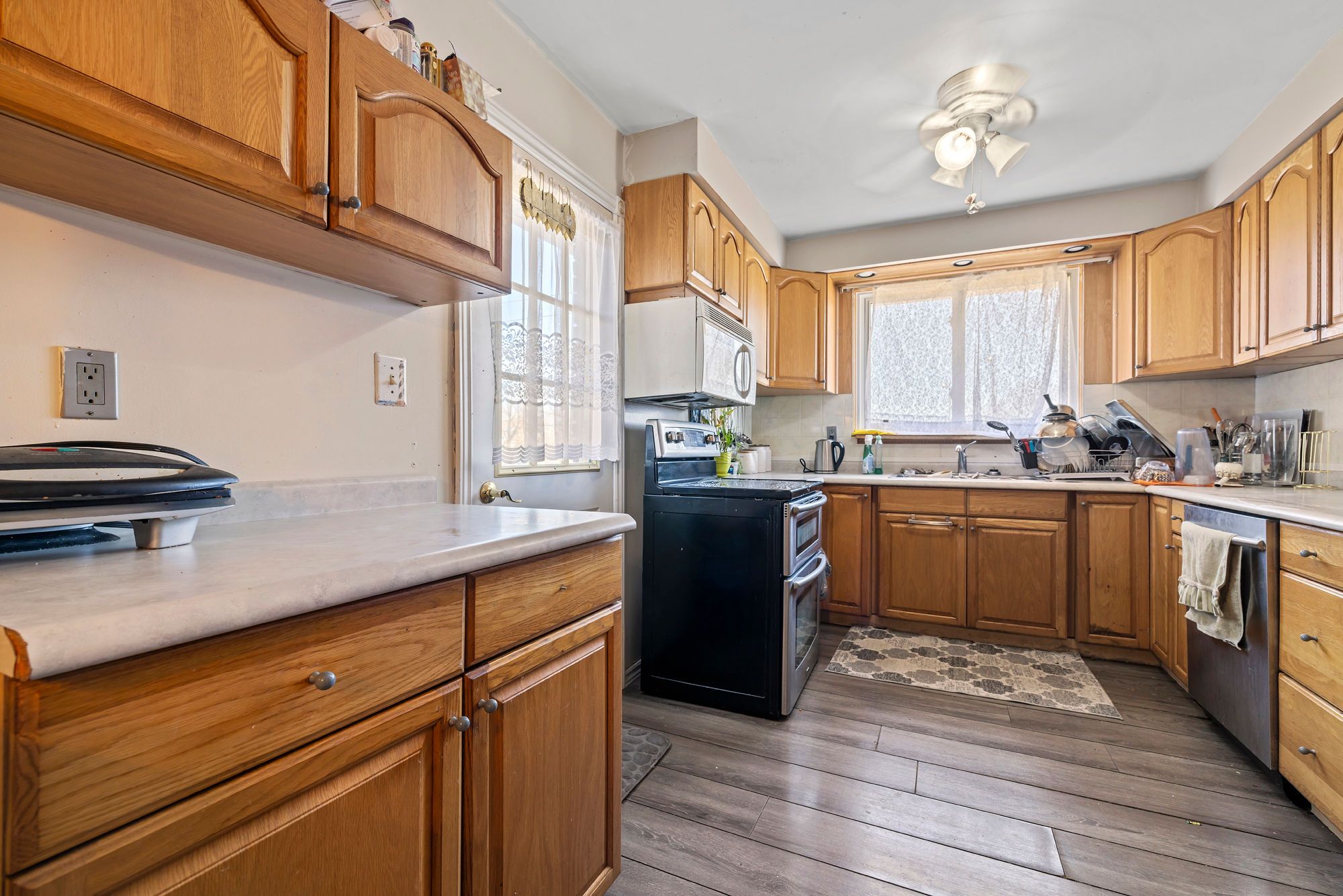 • Eat-in kitchen with wooden cabinets and backyard access.