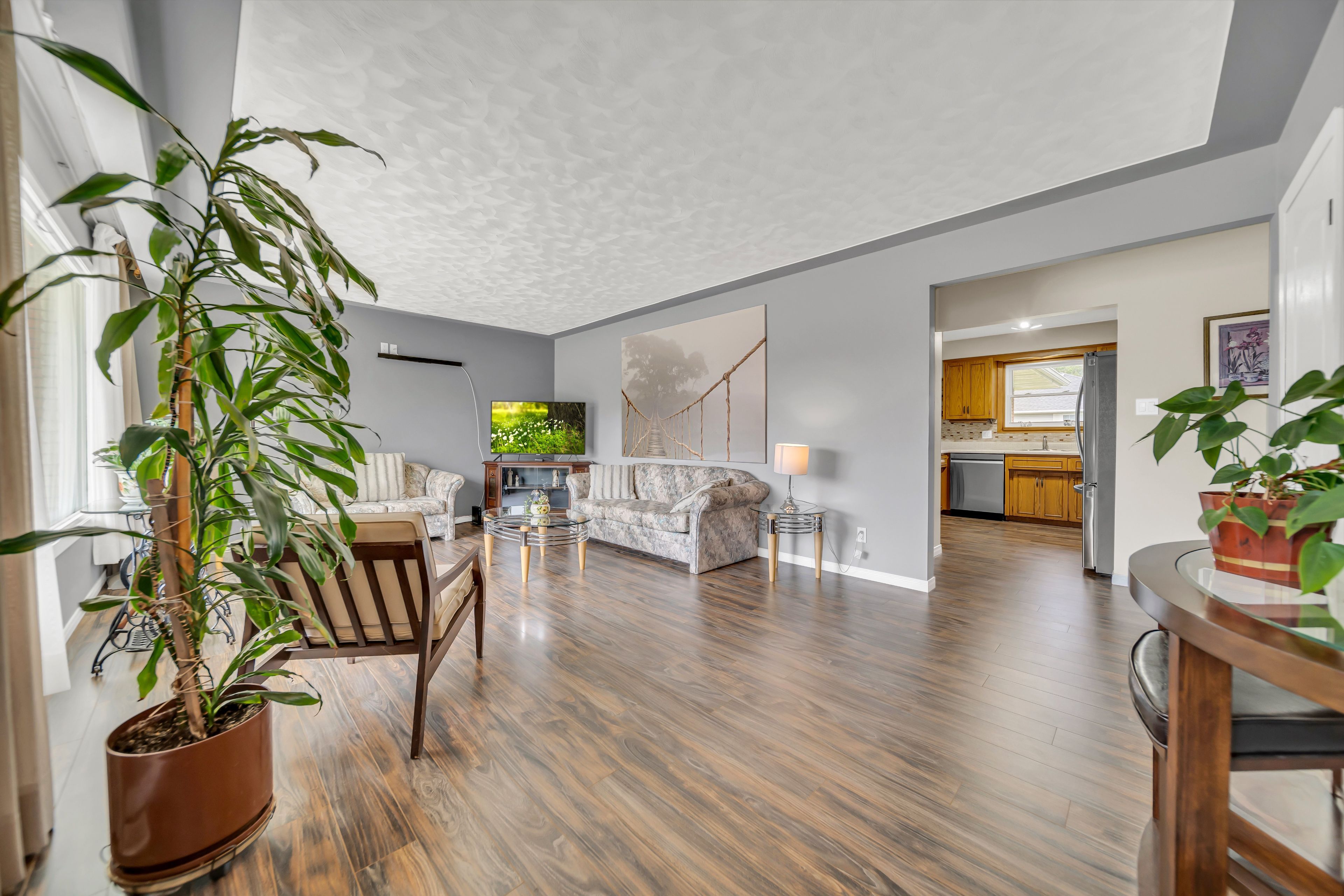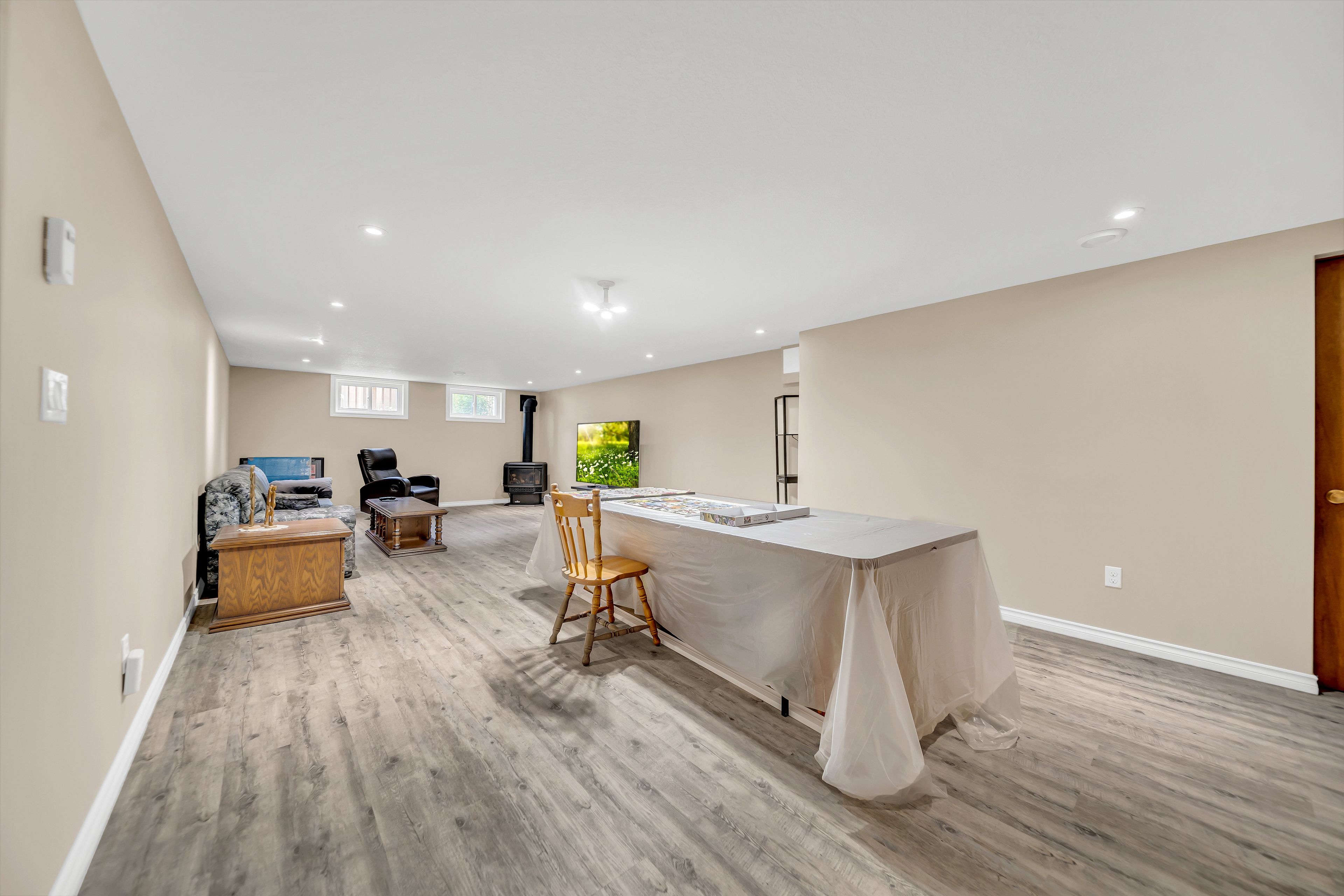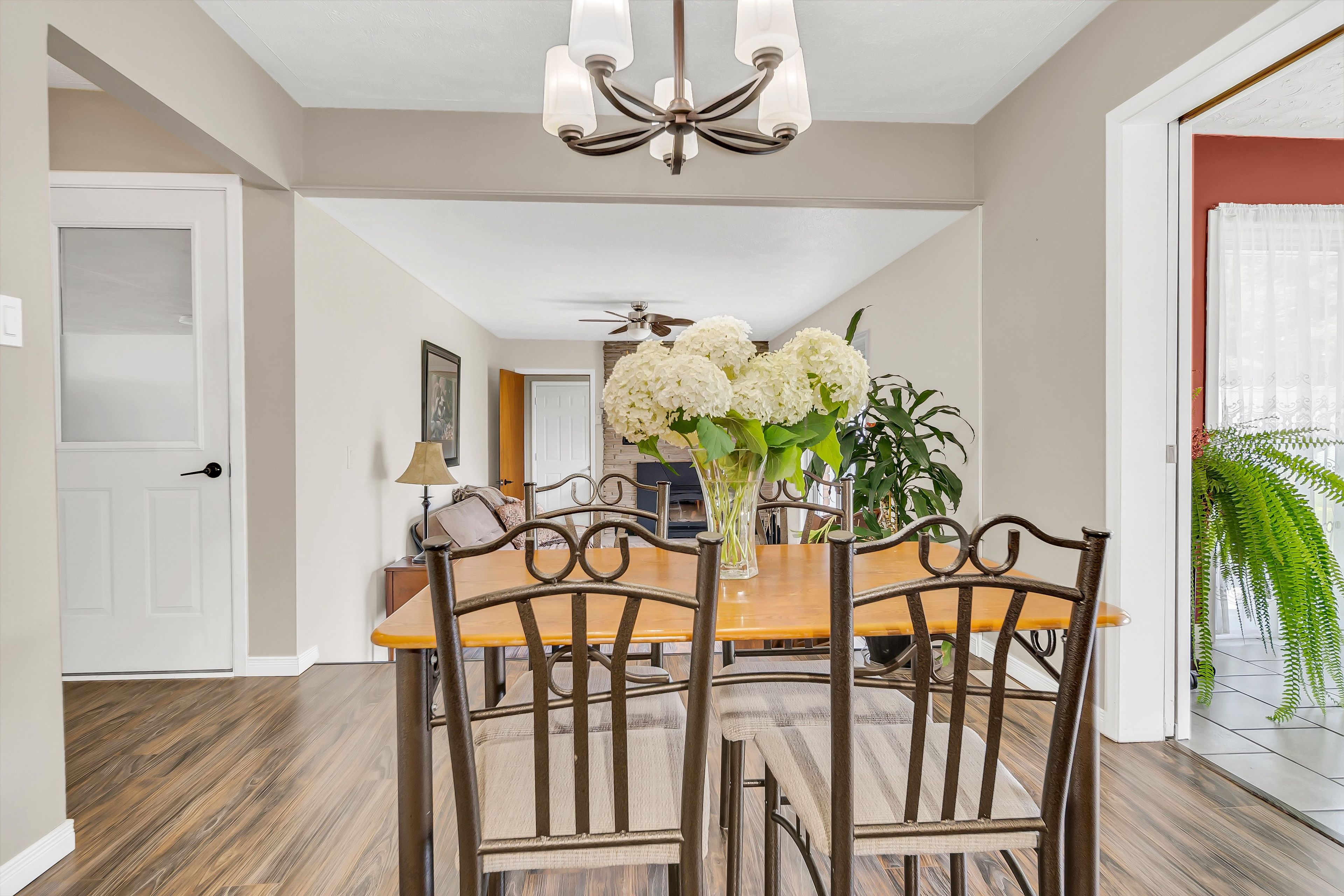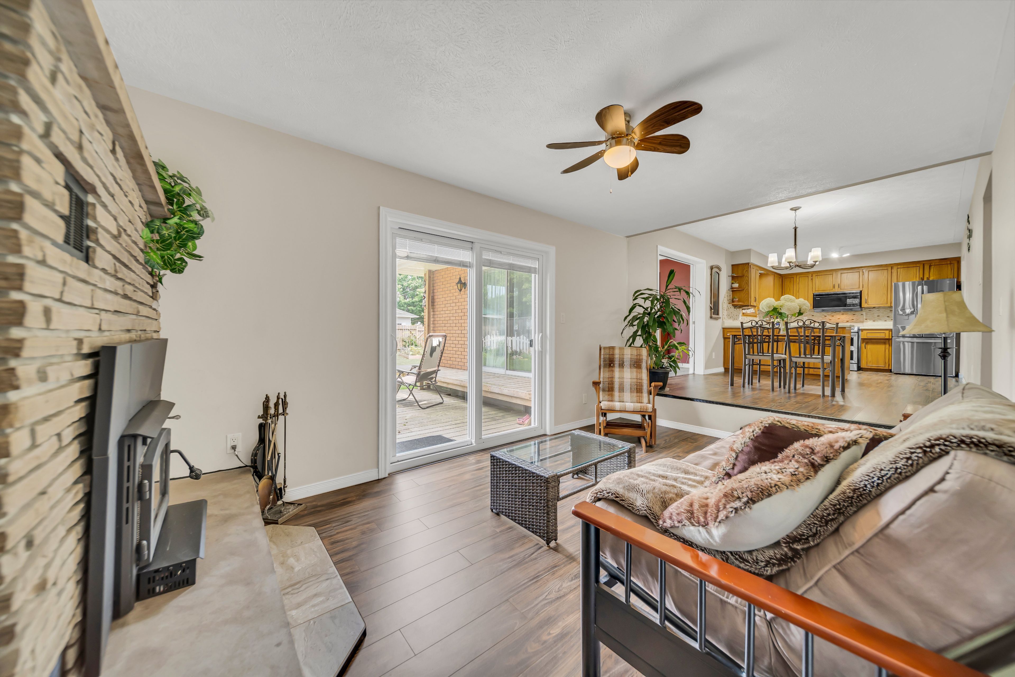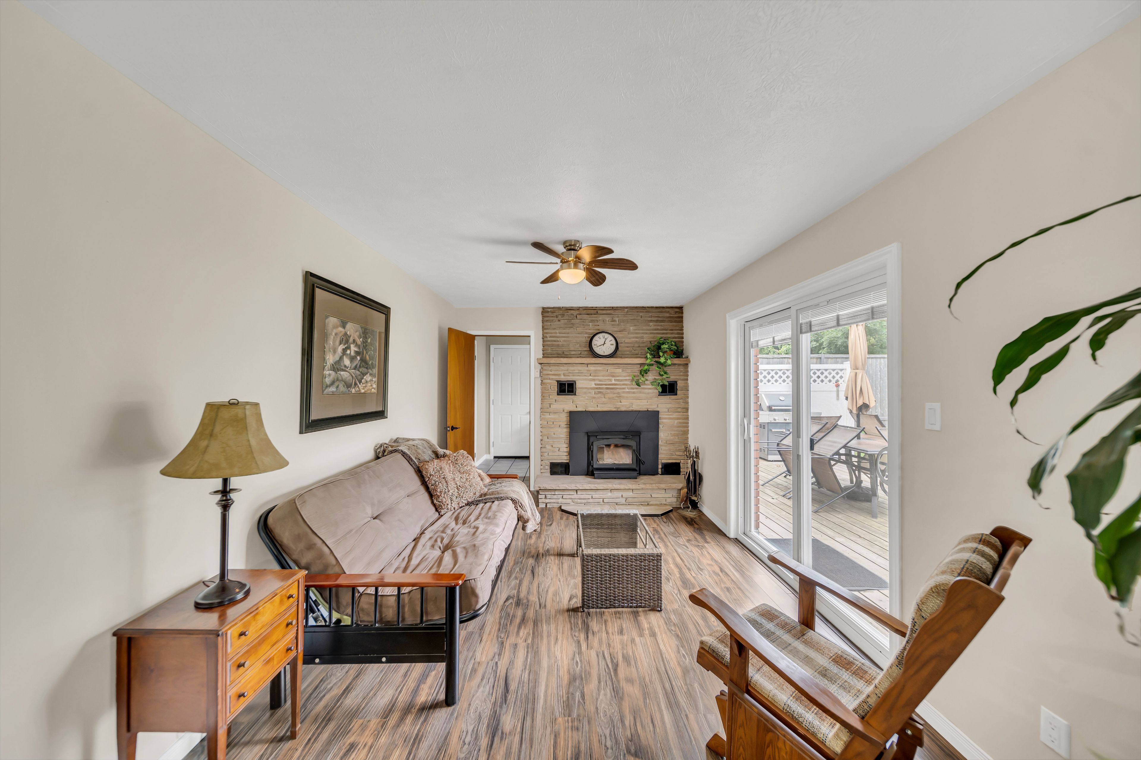 • Bright, open layout with laminate flooring and a cozy wood-burning fireplace.