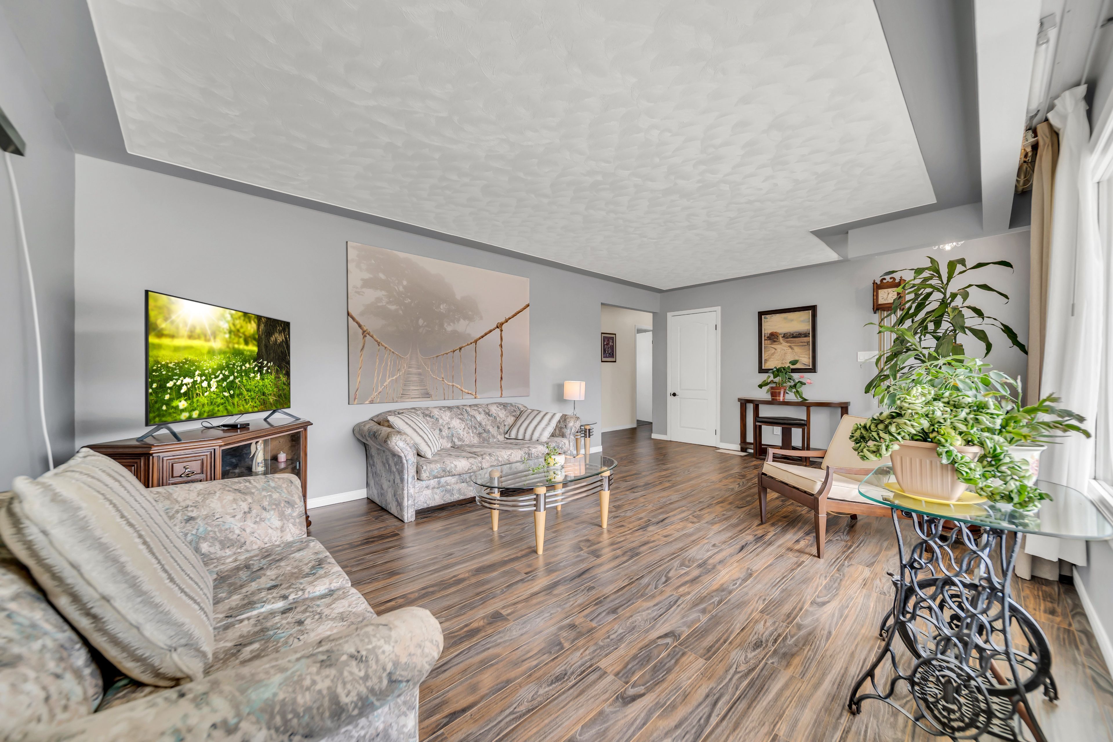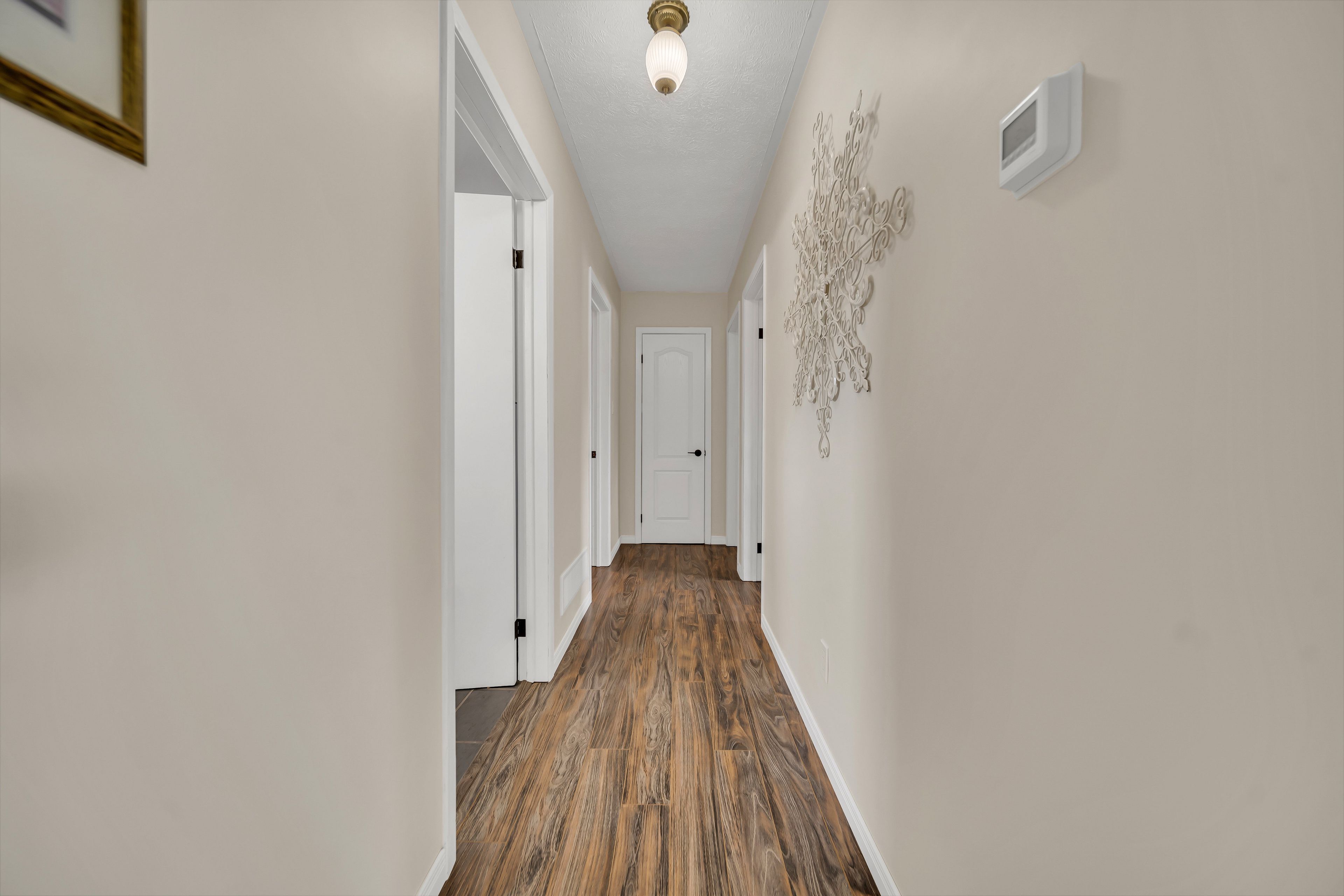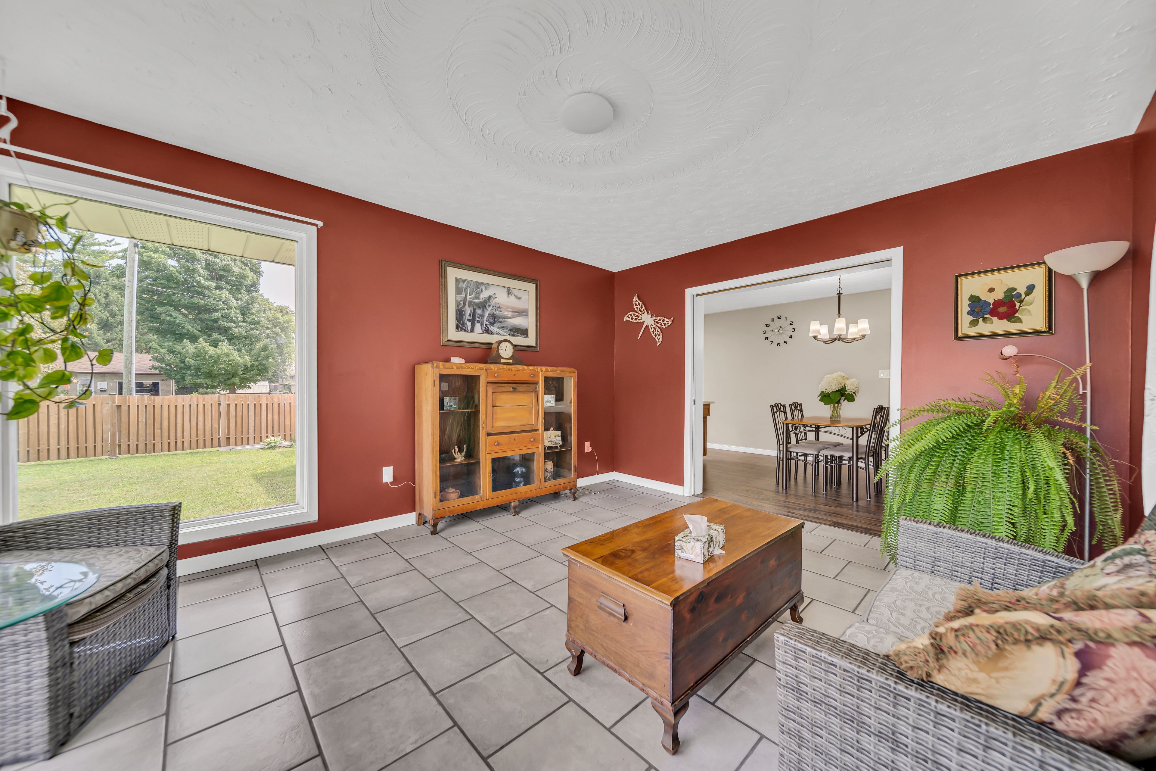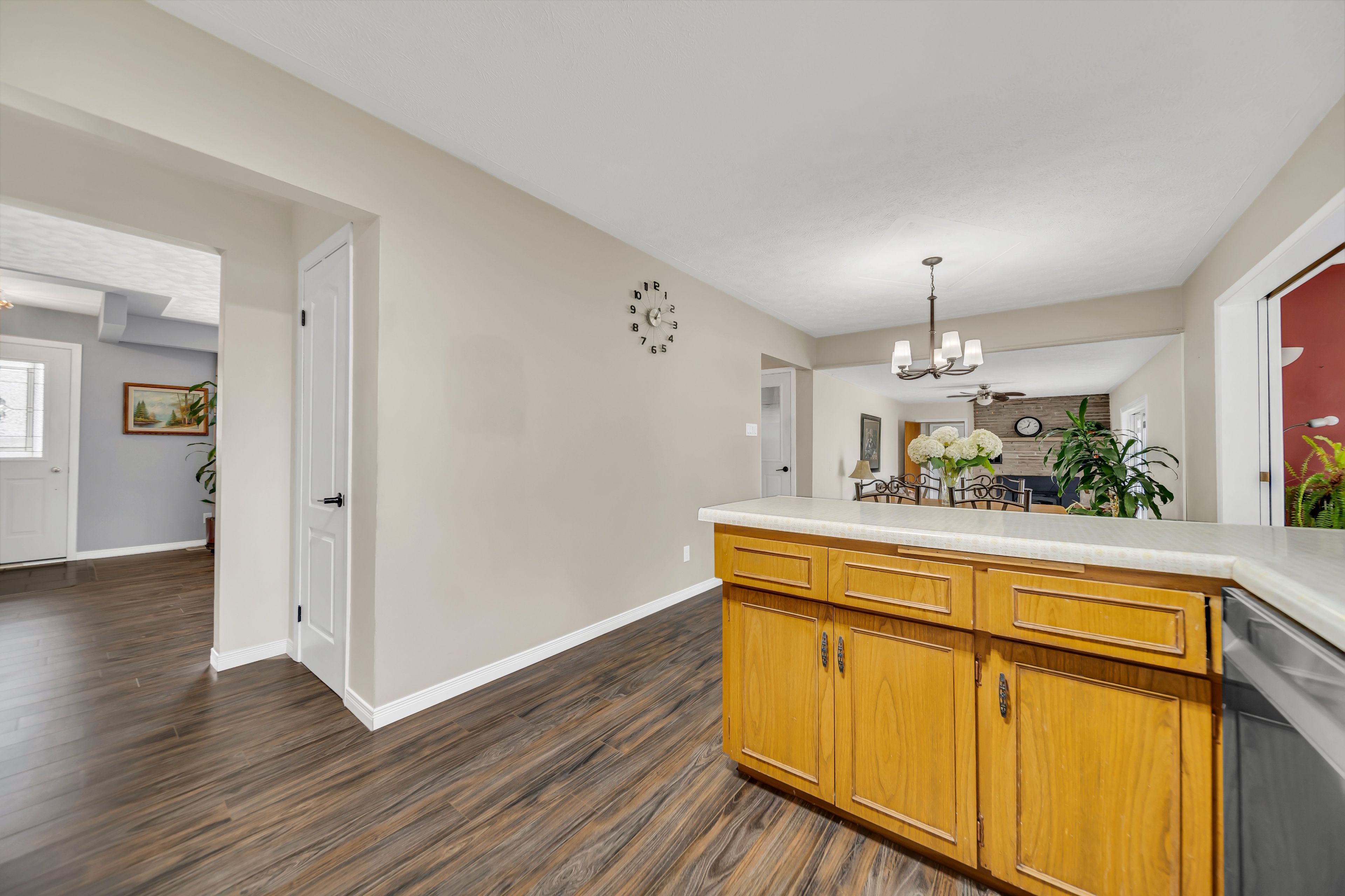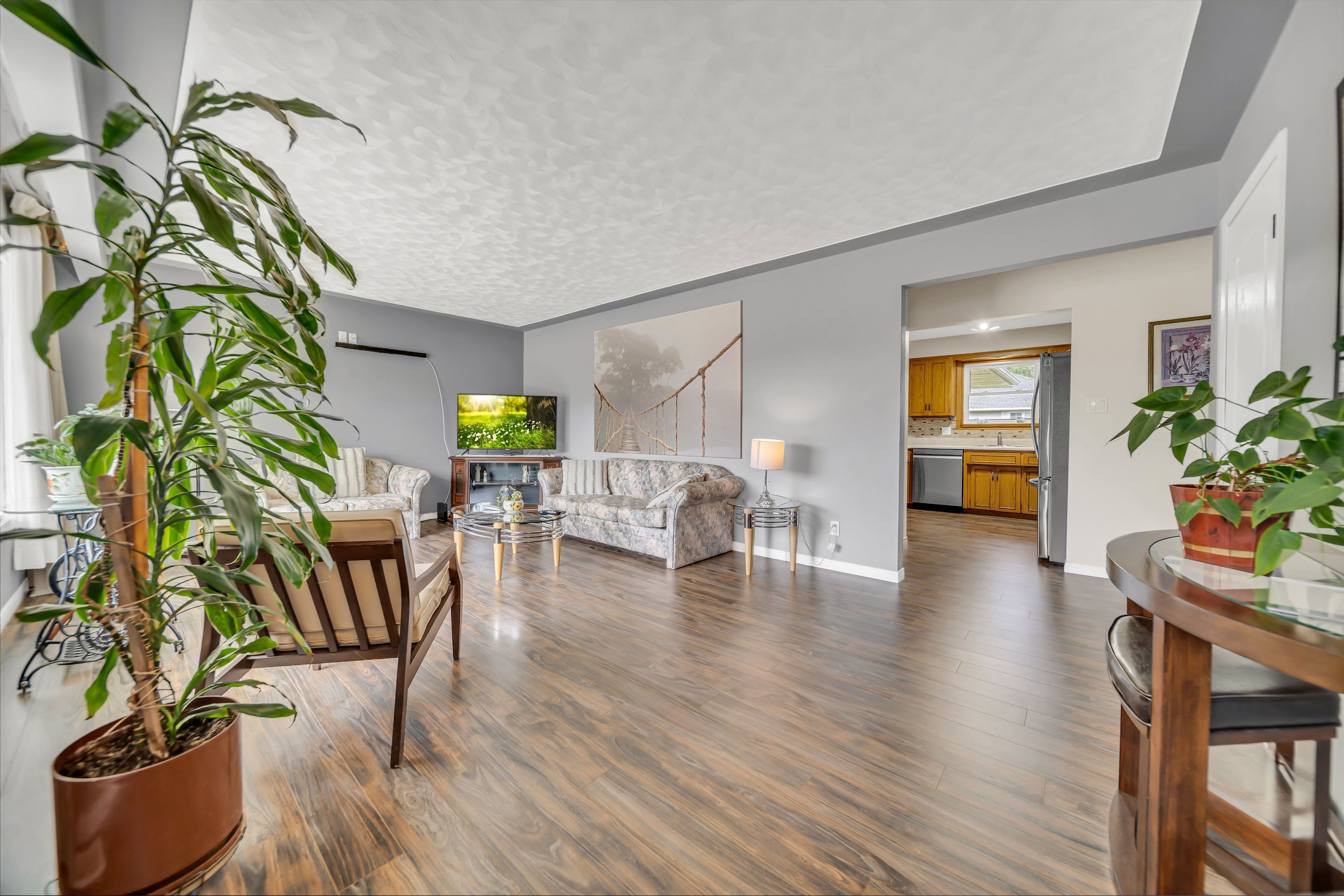 • Bright, open layout with laminate flooring and a cozy wood-burning fireplace.