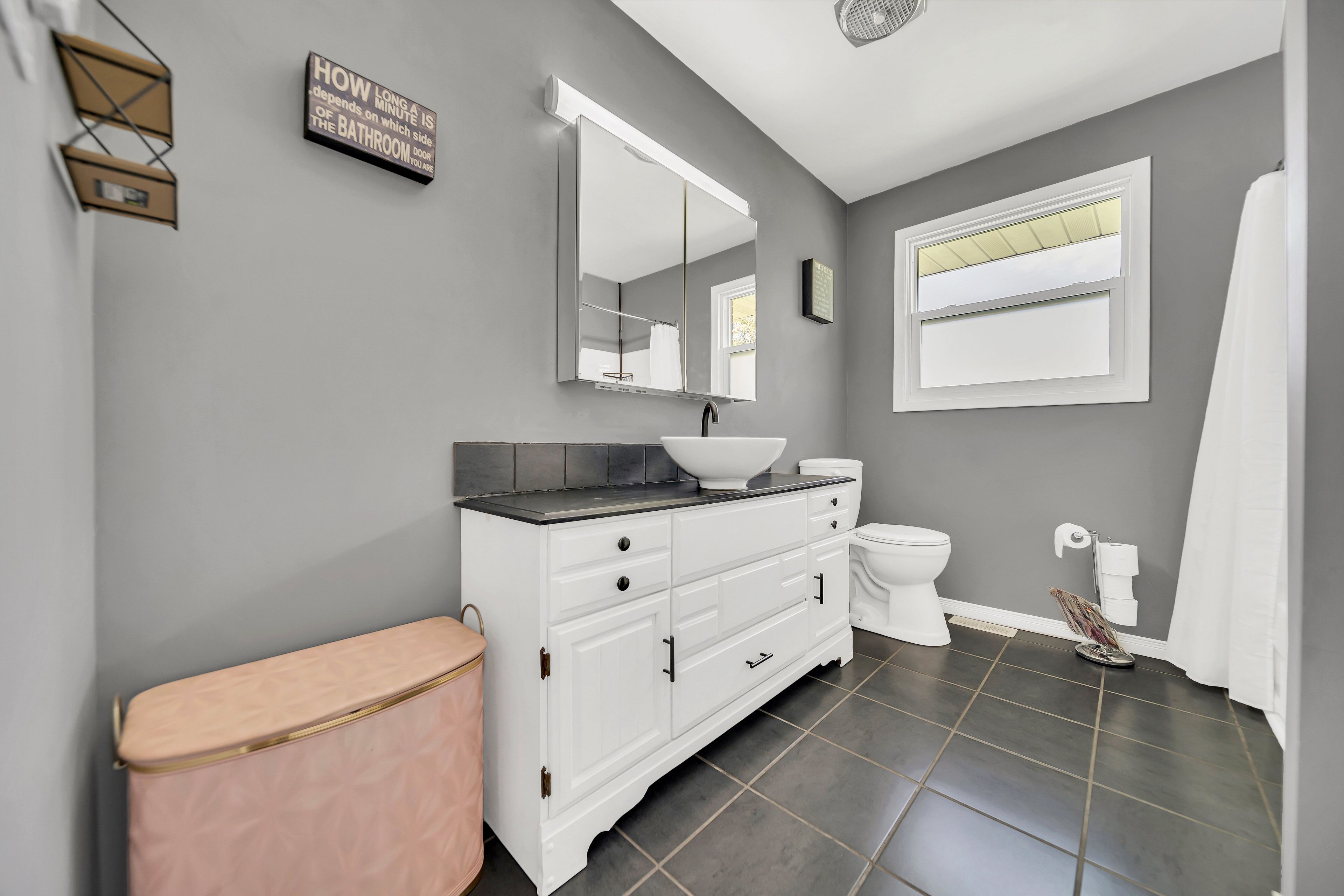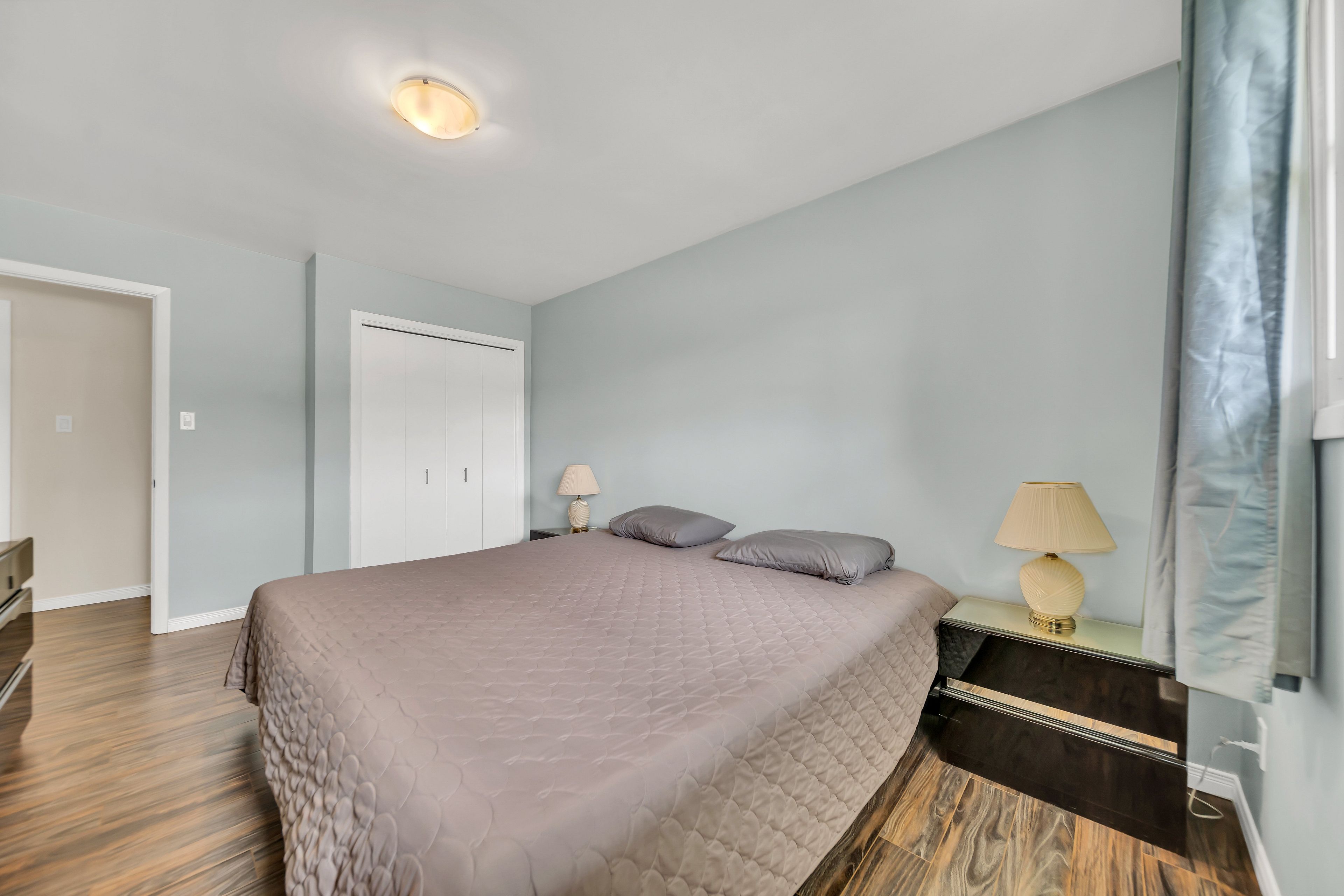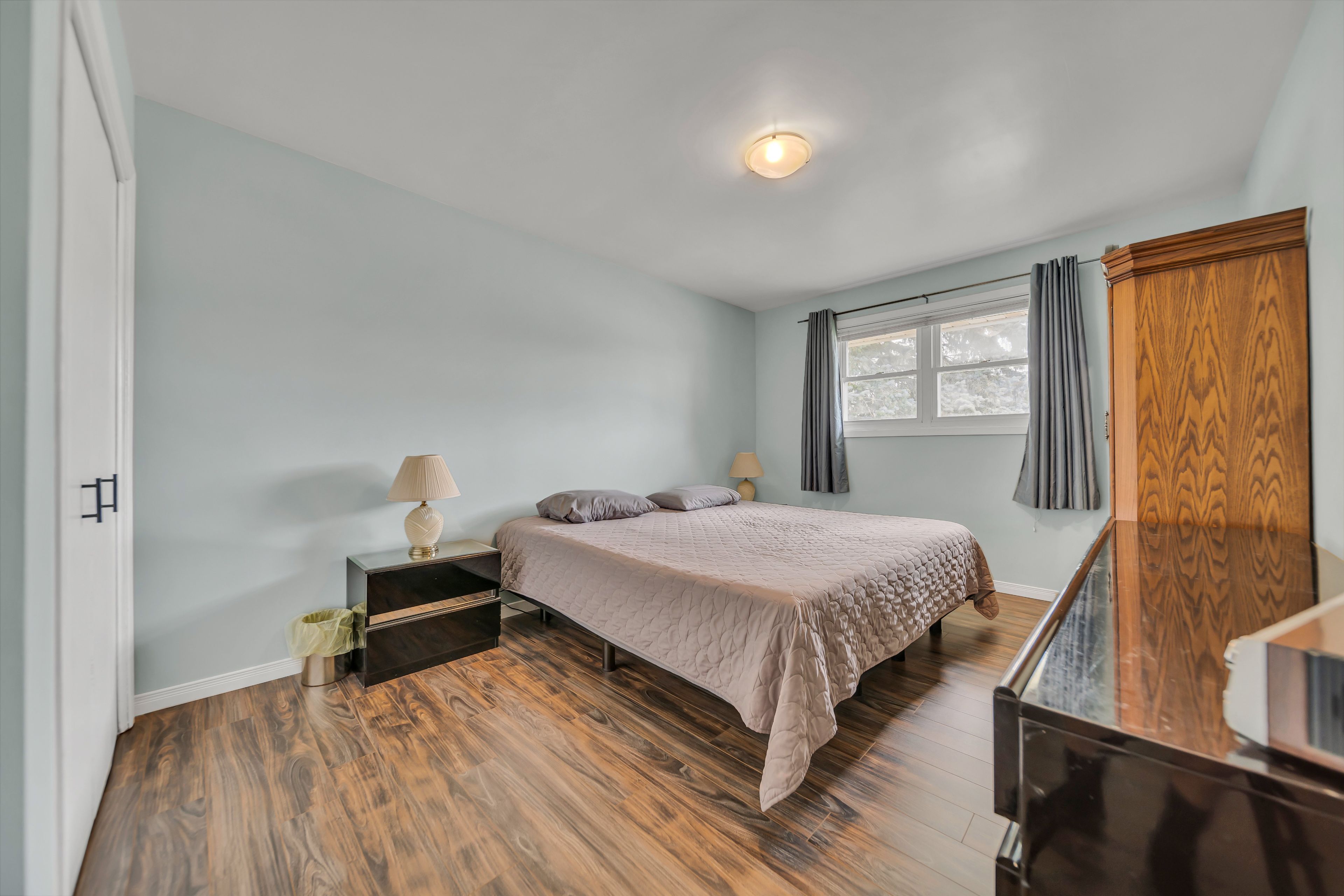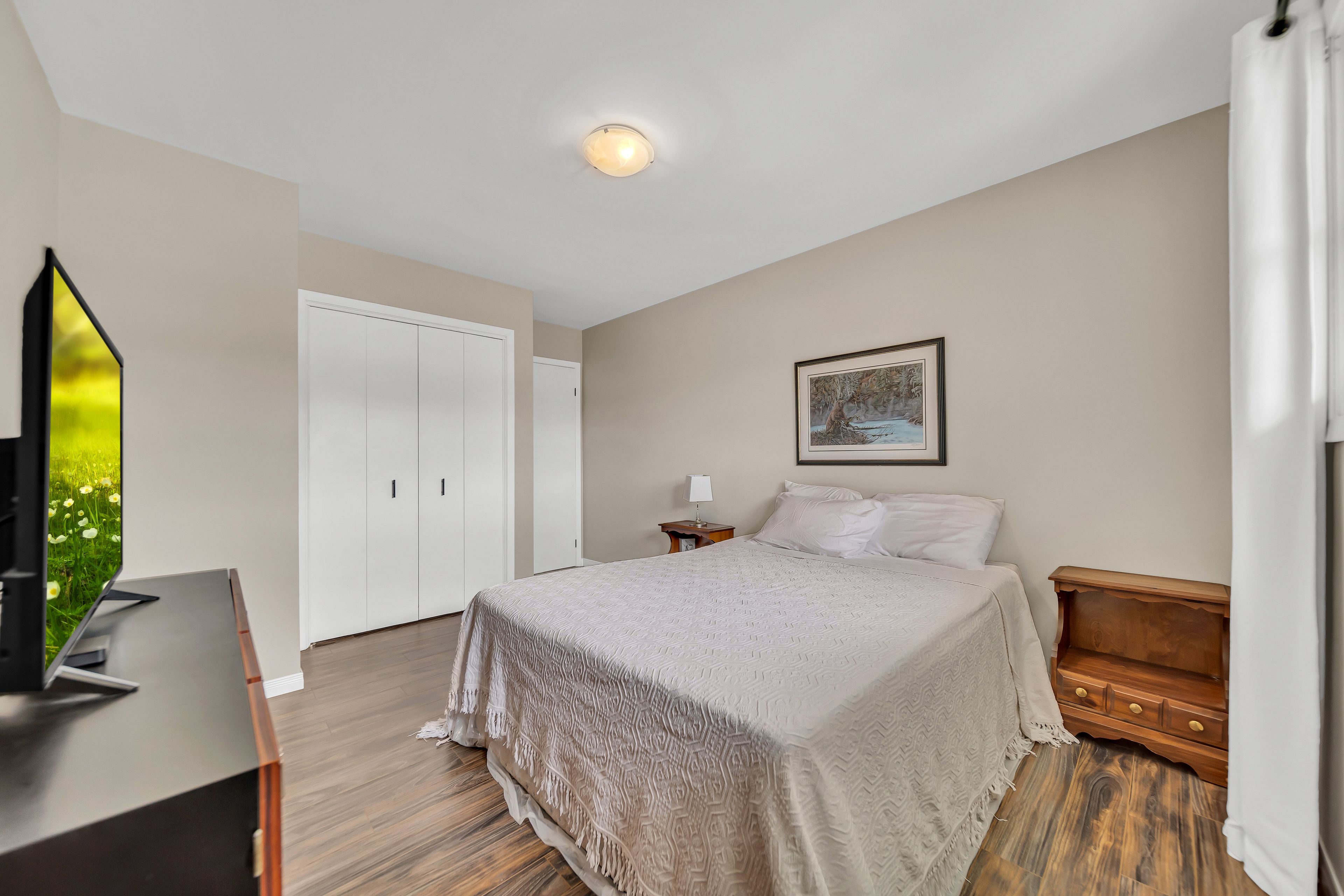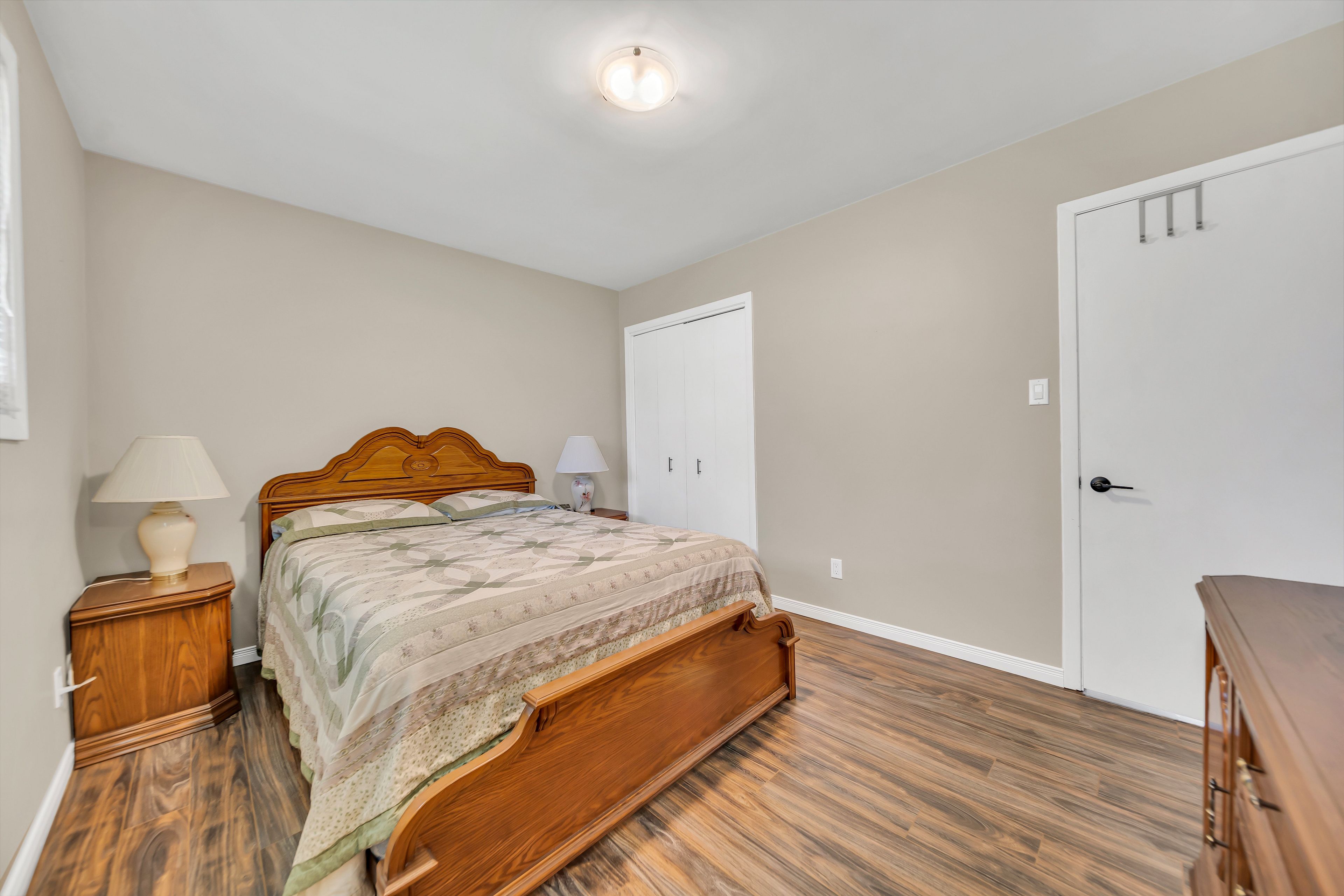 • Bright, open layout with laminate flooring and a cozy wood-burning fireplace.