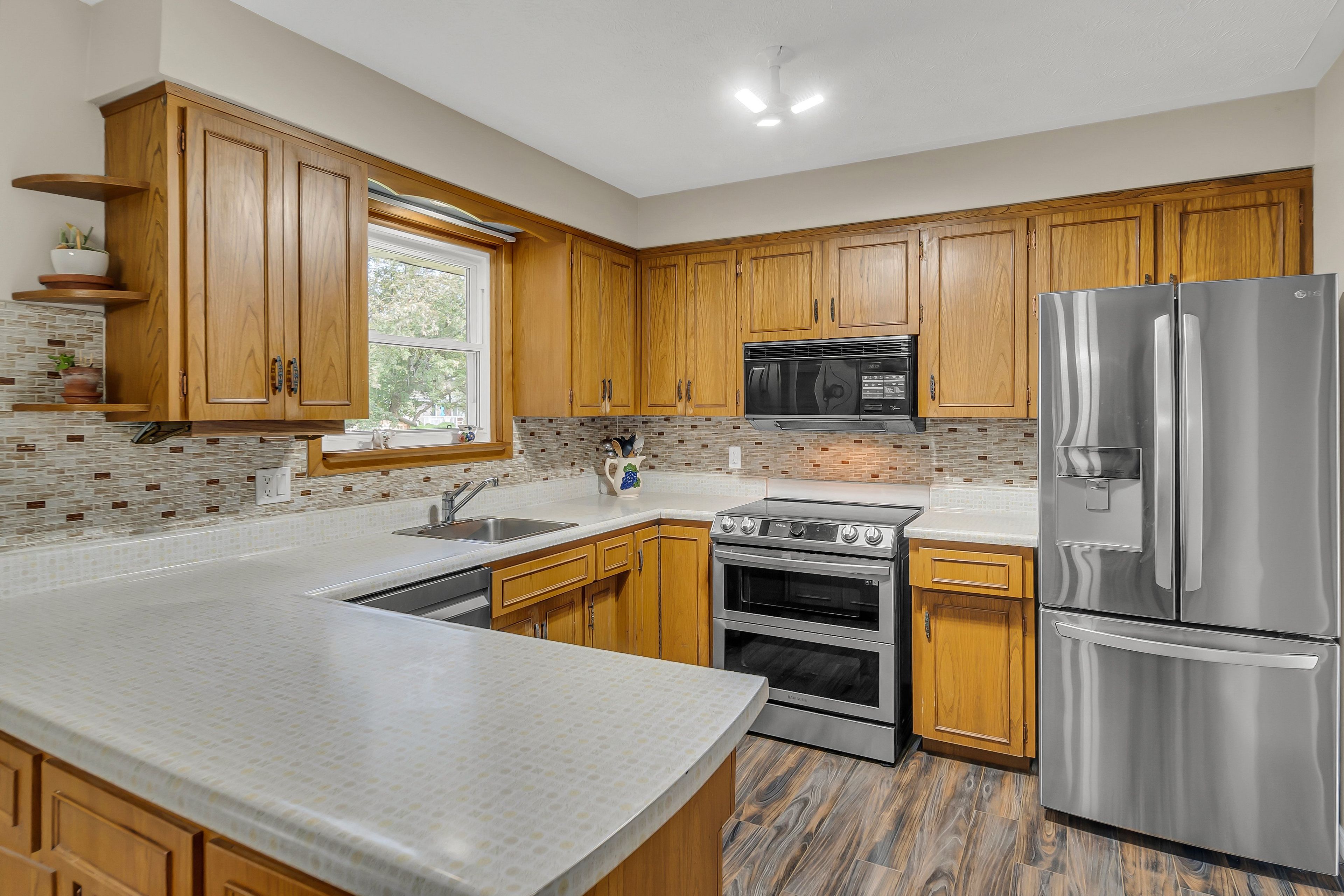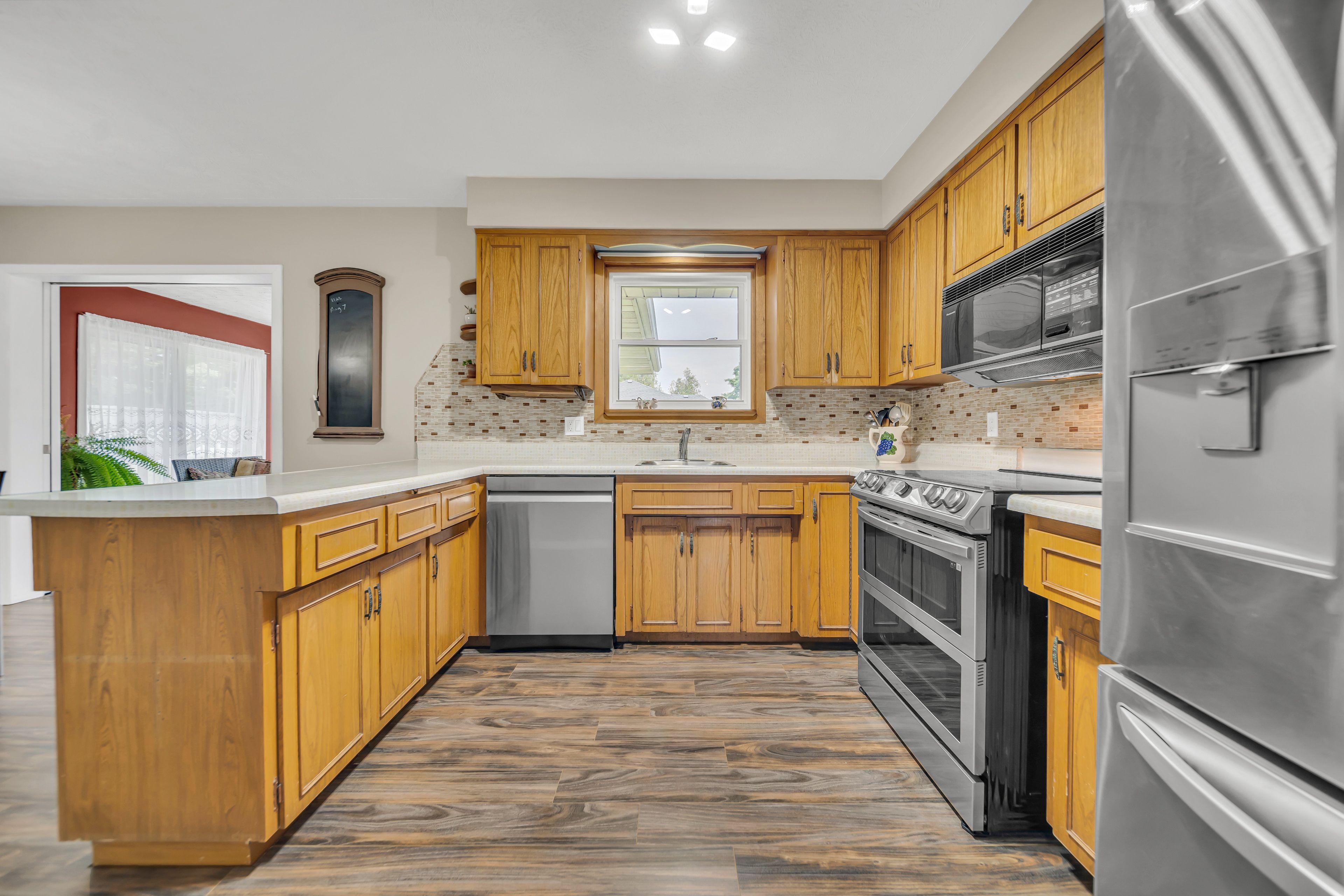 • Spacious kitchen featuring new stainless steel appliances and ample cabinetry.