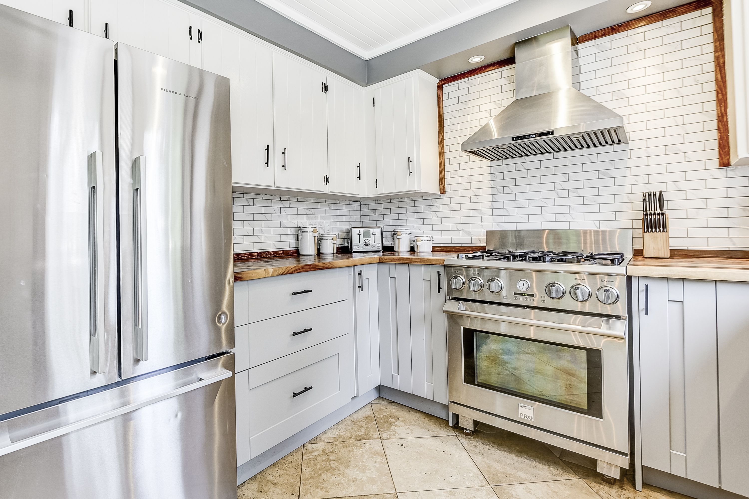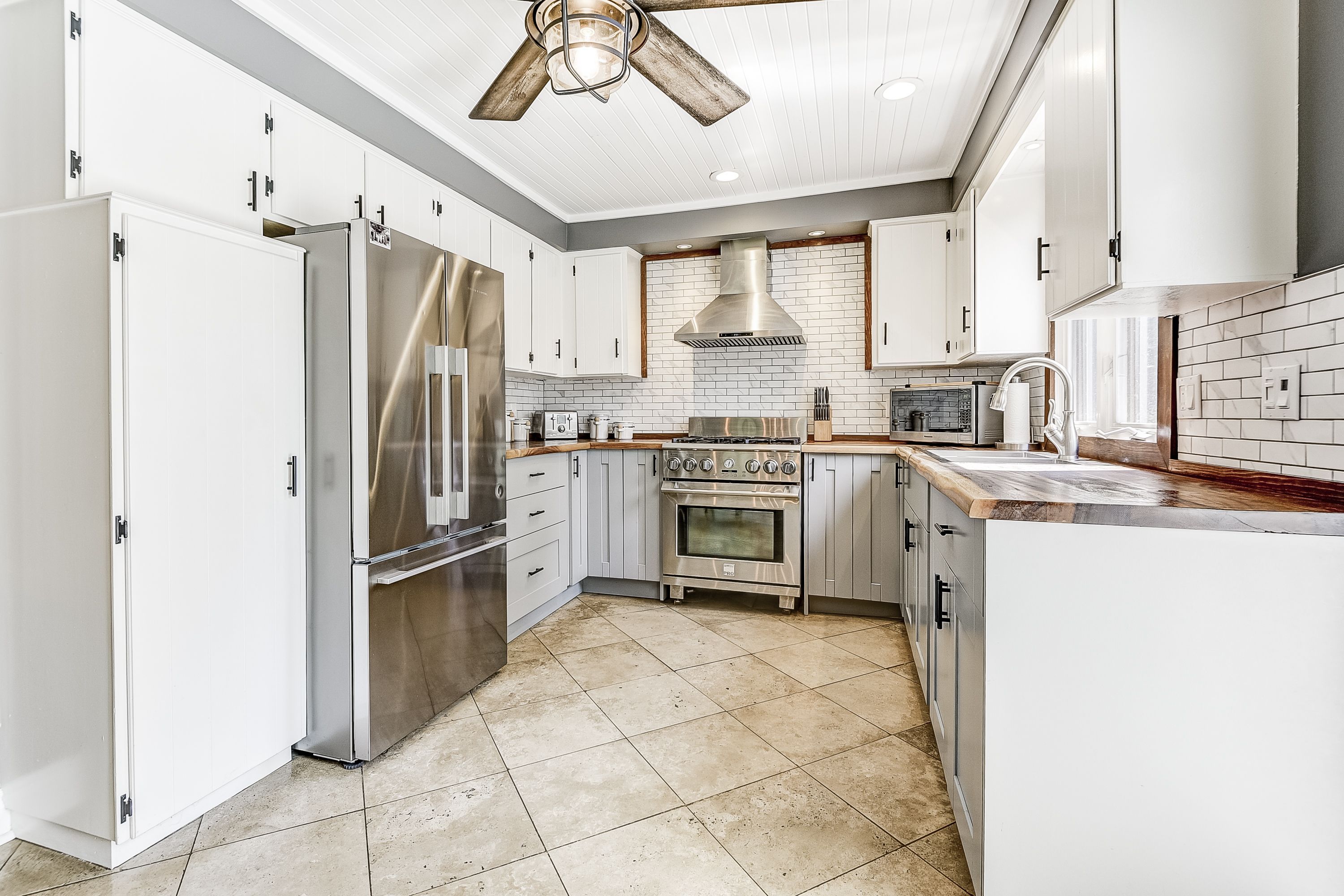 • Spacious kitchen with stainless steel appliances and marble flooring.