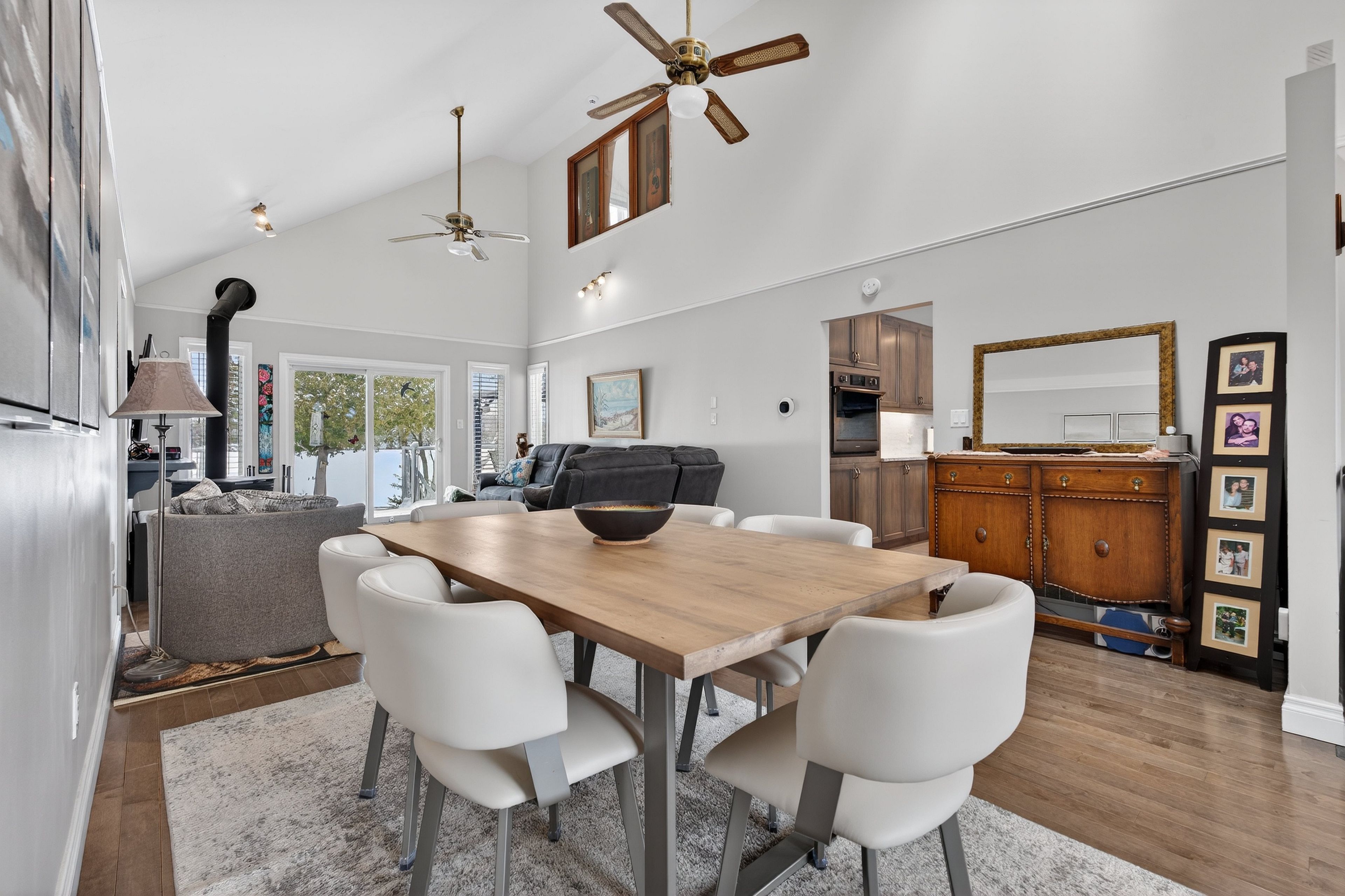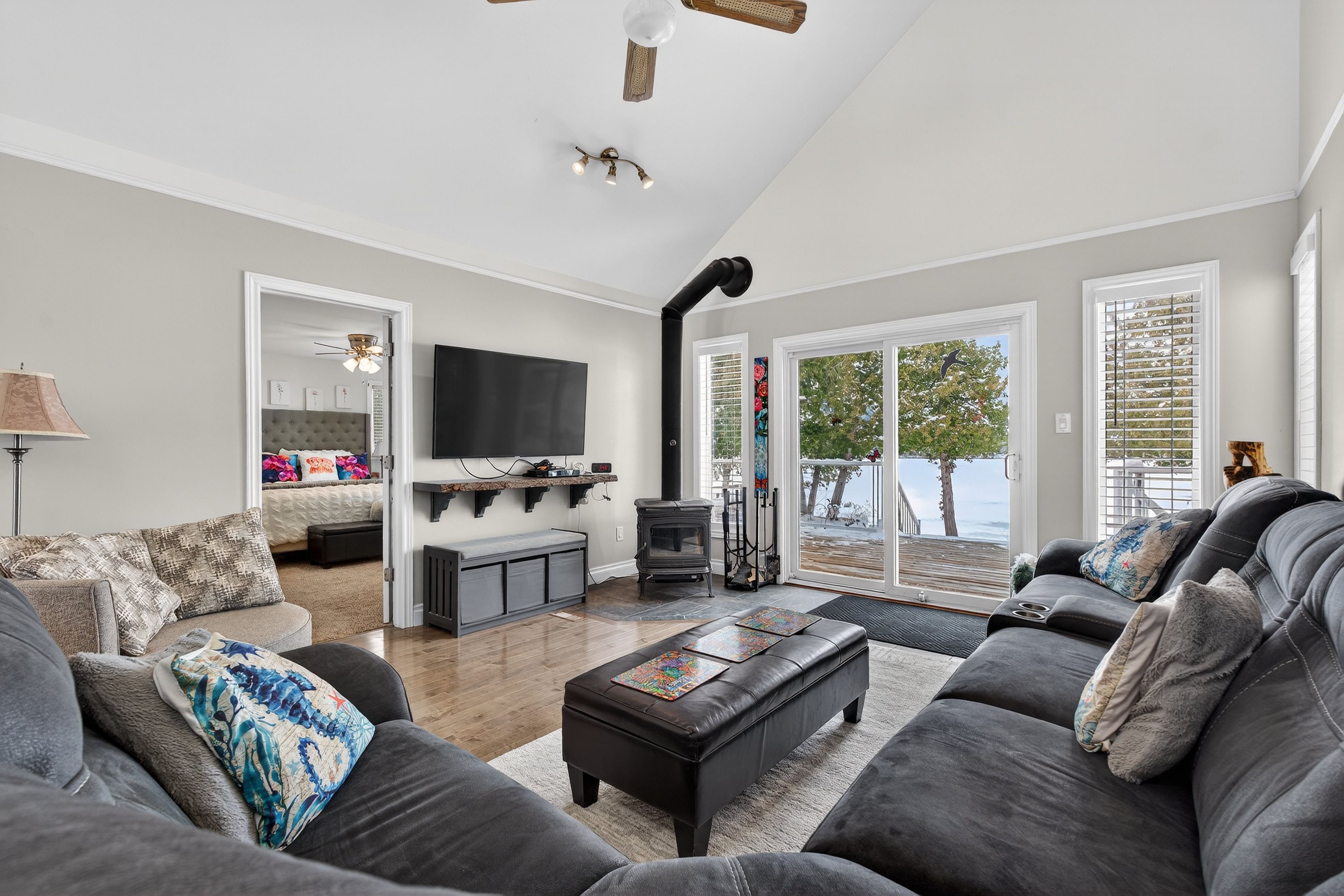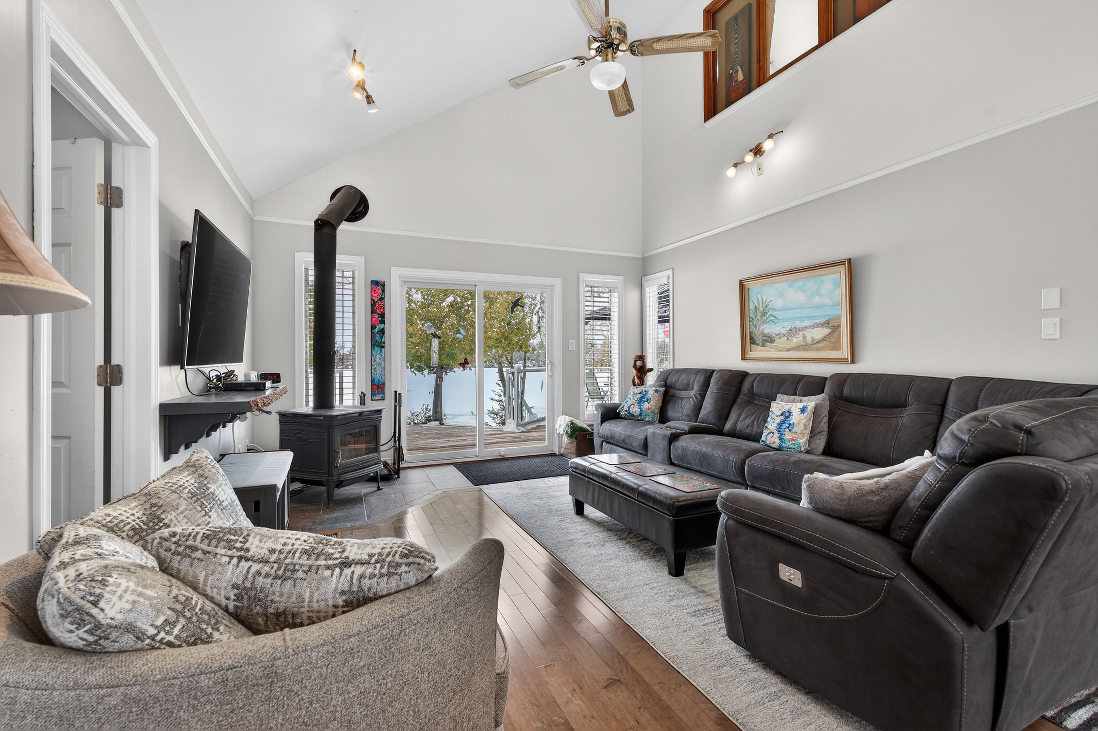 • Bright open-concept main level with stunning lake views and hardwood flooring.