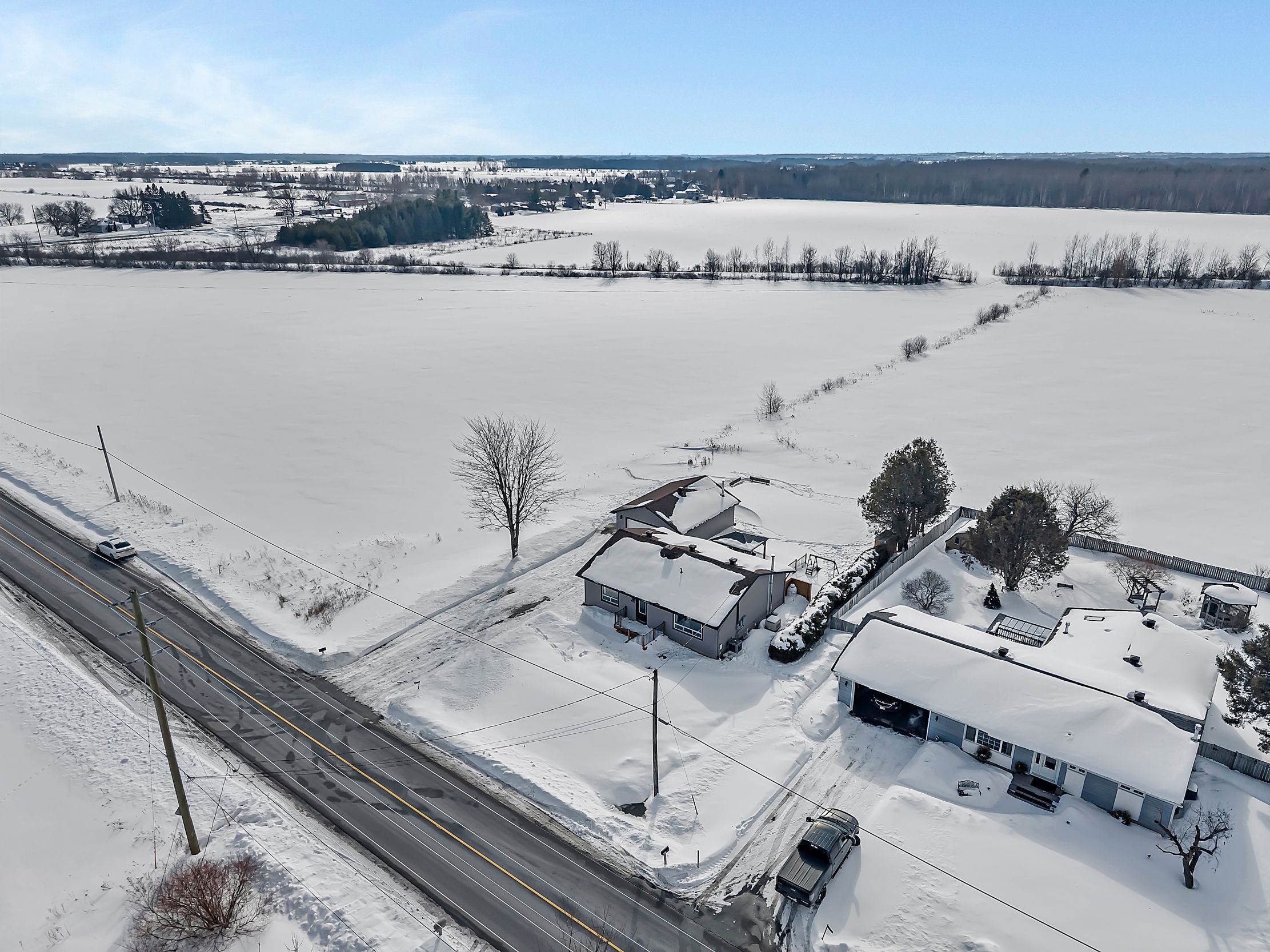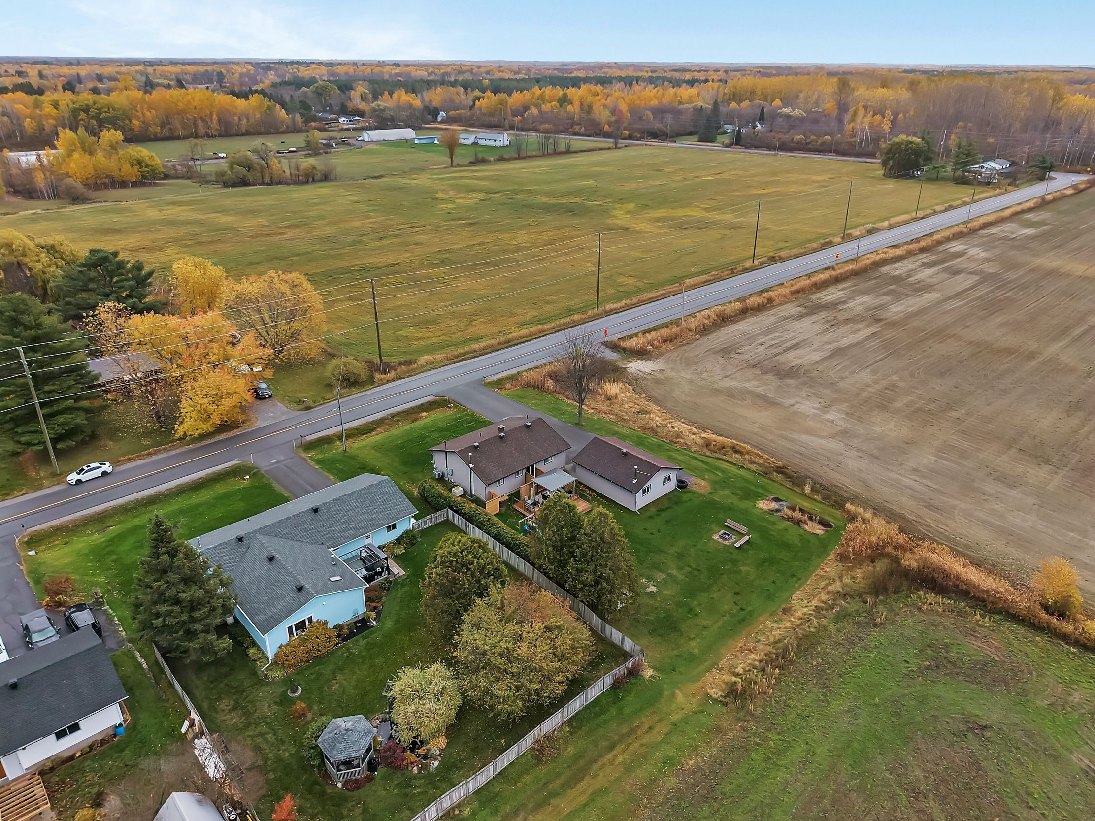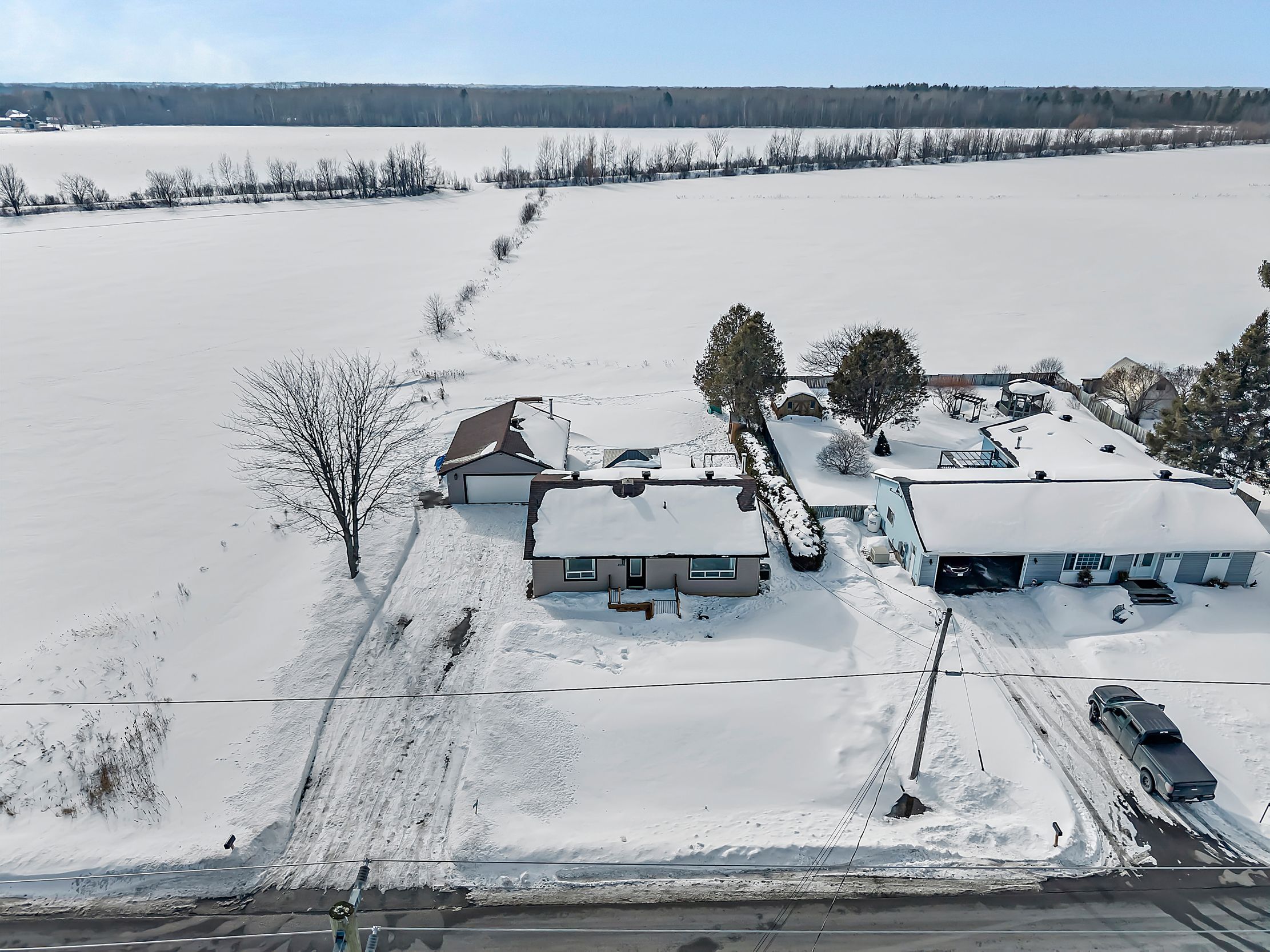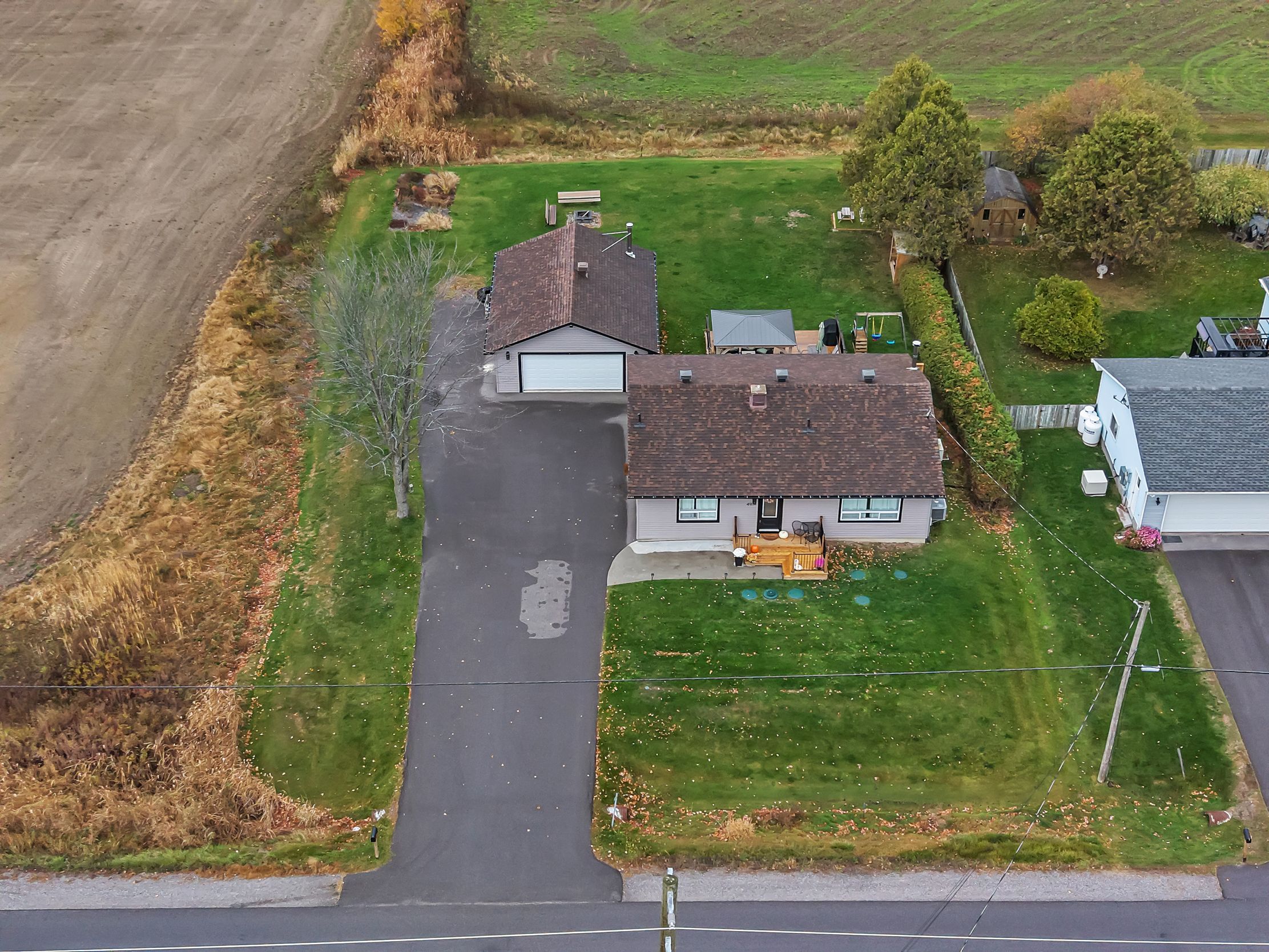 Beautifully updated and meticulously maintained, this charming two-bedroom, two-bathroom bungalow sits on a generous one-third acre lot with no rear neighbours, offering privacy and peaceful surroundings just 15 minutes from the city core. The bright and inviting main level showcases modern finishes throughout, featuring an eat-in kitchen with stainless steel appliances and elegant quartz countertops. The spacious living room is highlighted by an oversized window that fills the space with natural light. The primary suite serves as a relaxing retreat, complete with a luxurious four-piece ensuite boasting a freestanding tub and glass-enclosed shower. A second bedroom and a stylish four-piece main bath complete the level. Downstairs, the fully finished lower level offers a large family room warmed by a cozy wood stove, a dedicated gym area, a laundry room, and ample storage space. For hobbyists or those in need of extra workspace, the detached 24' x 32' garage-heated with its own wood stove-provides comfort and functionality year-round. End your days soaking in the sunset from the recently built deck, the perfect place to unwind and enjoy the tranquility of country living.