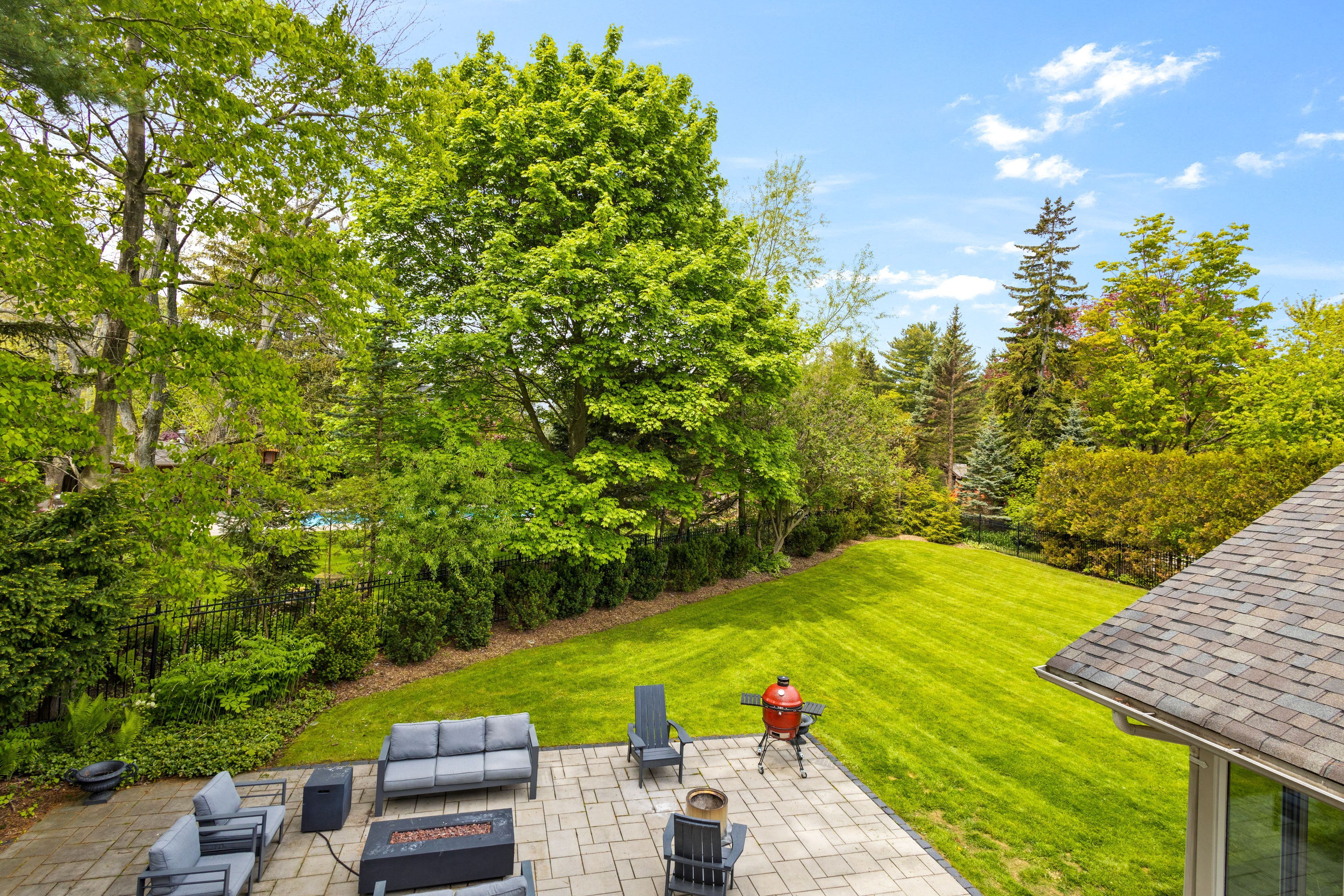 • Private backyard oasis with mature trees, wooden deck, and fire pit area.