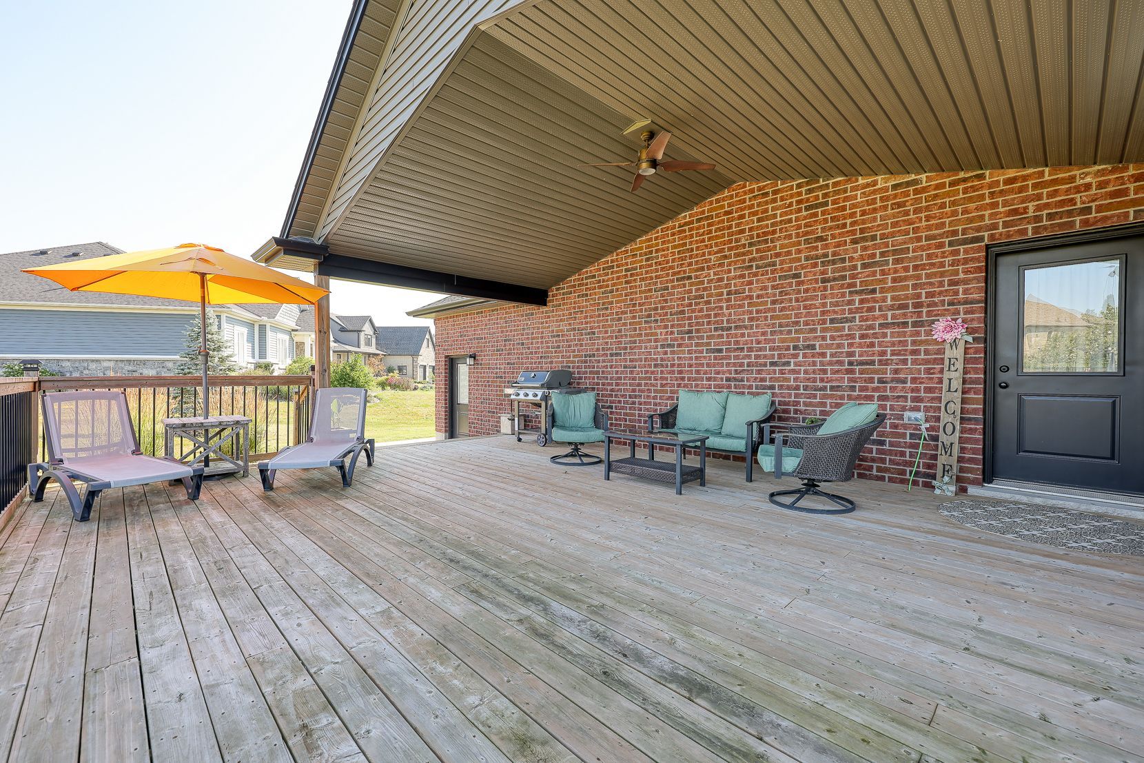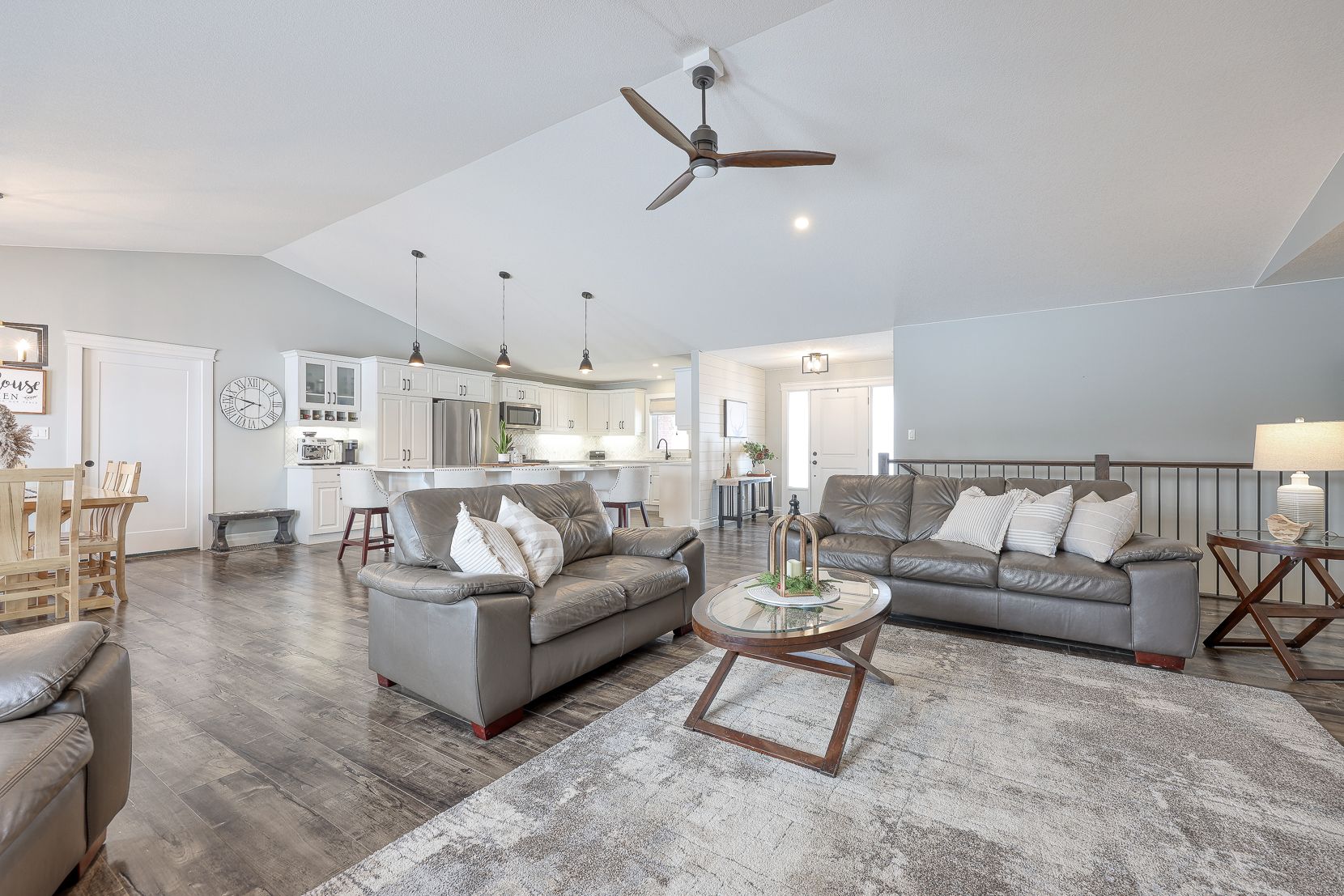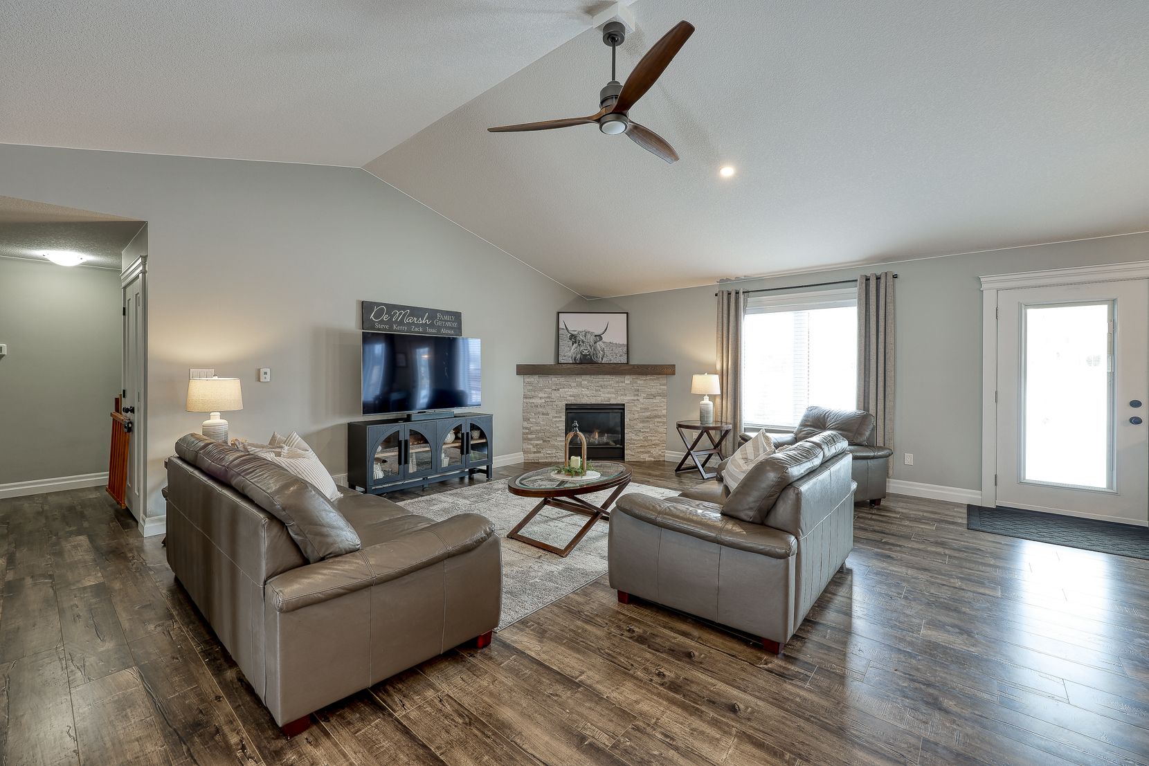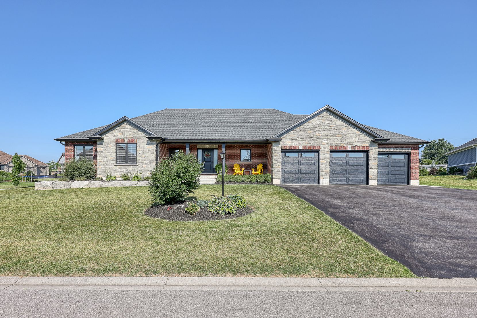 Incredible value! Beautiful custom 5-bed, 3-bath home on a 0. 45-acre lot situated on a quiet cul-de-sac. Features an open-concept layout with cathedral ceilings, a gourmet kitchen with quartz countertops, a large island, and a bright dining area overlooking the living room with gas fireplace. The primary suite offers a tray ceiling, walk-in closet, and luxurious 5-piece ensuite with soaker tub and tiled walk-in shower. Two additional bedrooms, a full bath, and a convenient butler-style laundry room complete the main floor. The finished basement includes 2 more bedrooms, a spacious rec room with bar, a second living area, and a home gym space. Includes a heated triple car garage, covered back deck, and basement walk-up. A perfect home for families needing space, comfort, and style!