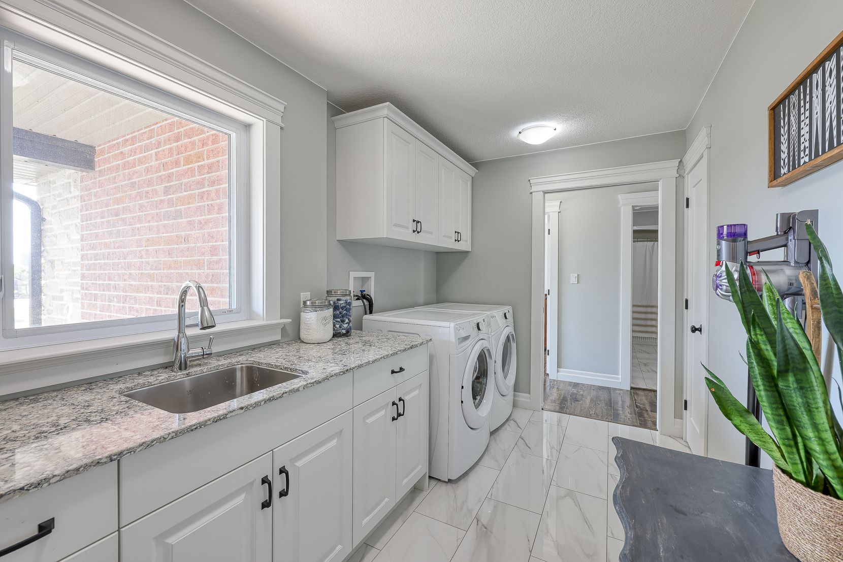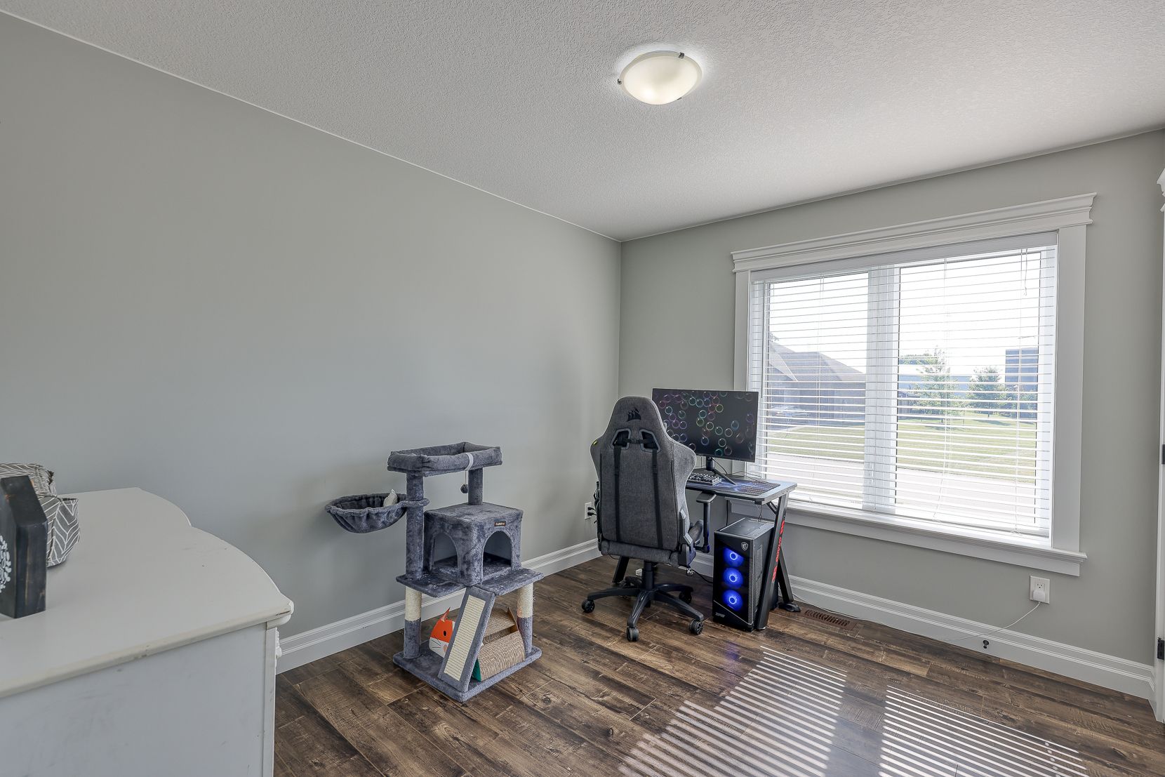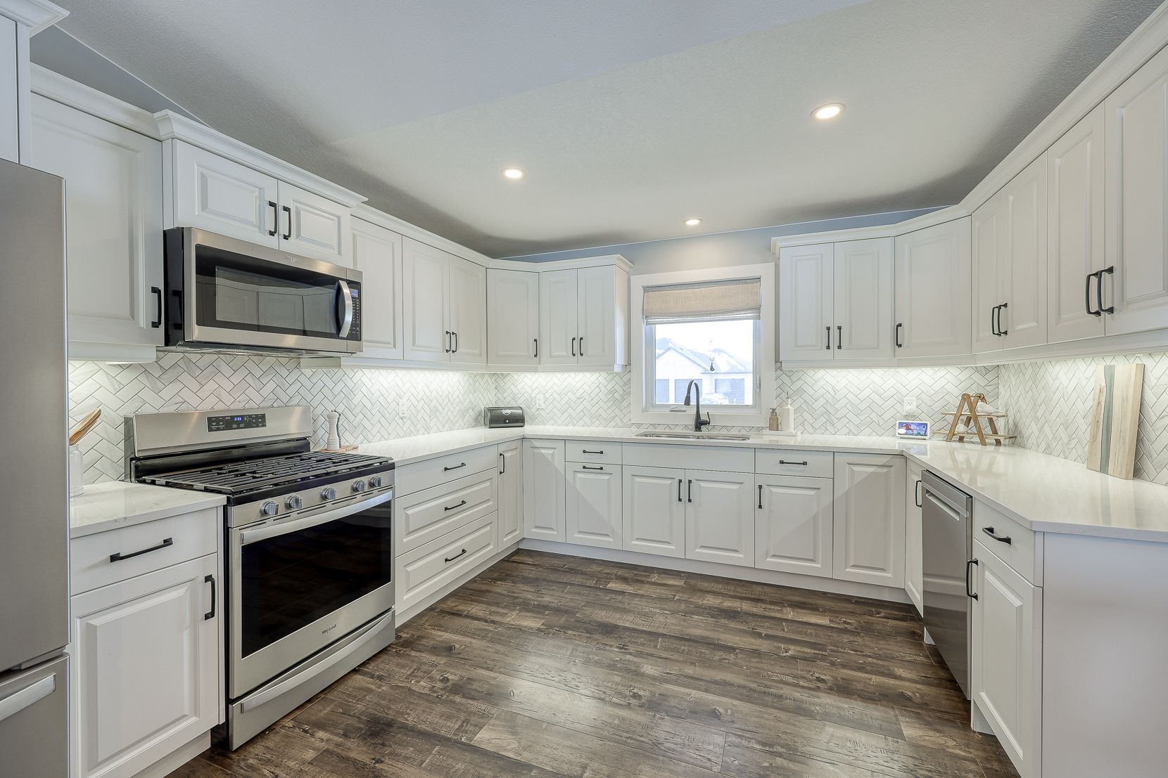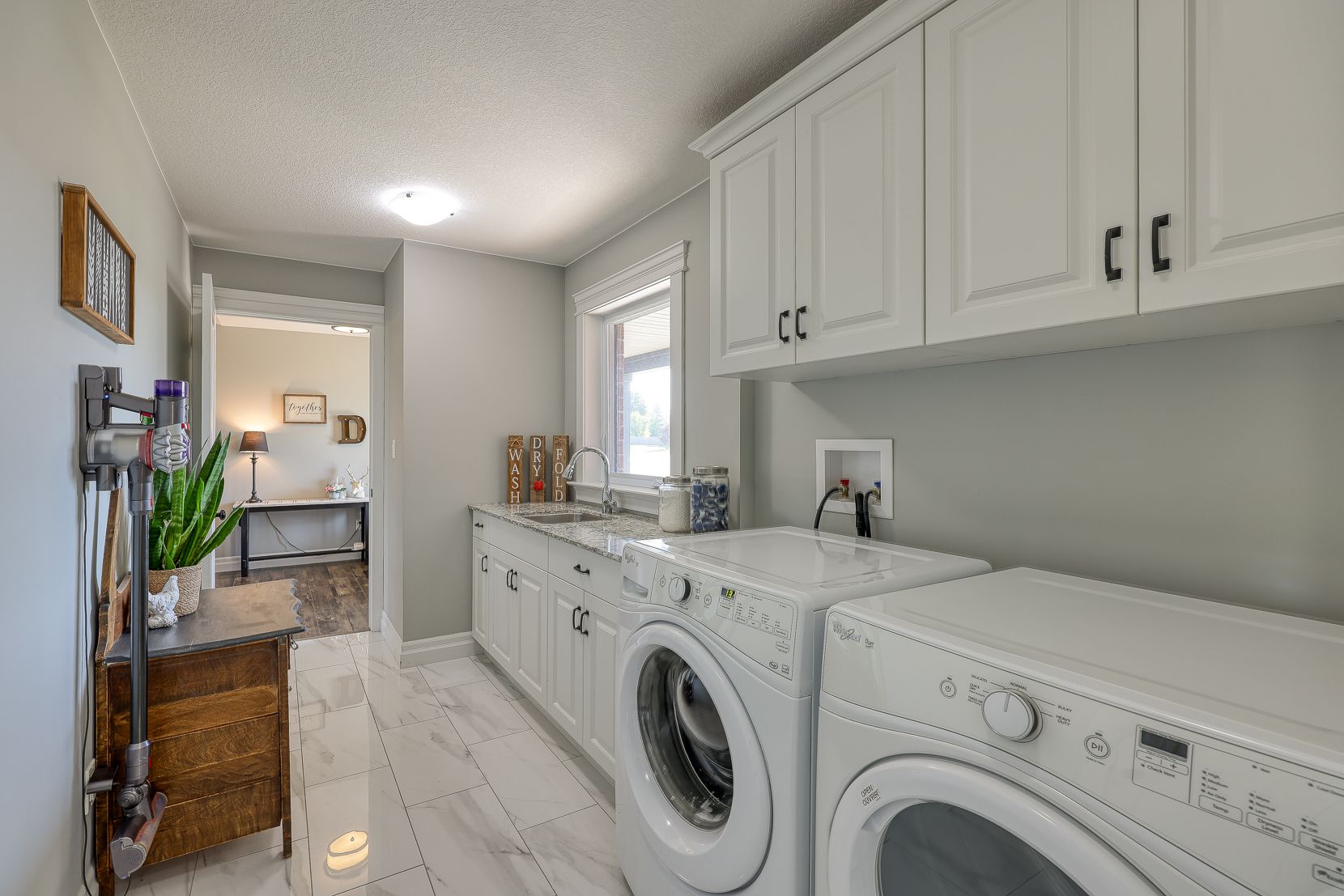 Incredible value! Beautiful custom 5-bed, 3-bath home on a 0. 45-acre lot situated on a quiet cul-de-sac. Features an open-concept layout with cathedral ceilings, a gourmet kitchen with quartz countertops, a large island, and a bright dining area overlooking the living room with gas fireplace. The primary suite offers a tray ceiling, walk-in closet, and luxurious 5-piece ensuite with soaker tub and tiled walk-in shower. Two additional bedrooms, a full bath, and a convenient butler-style laundry room complete the main floor. The finished basement includes 2 more bedrooms, a spacious rec room with bar, a second living area, and a home gym space. Includes a heated triple car garage, covered back deck, and basement walk-up. A perfect home for families needing space, comfort, and style!