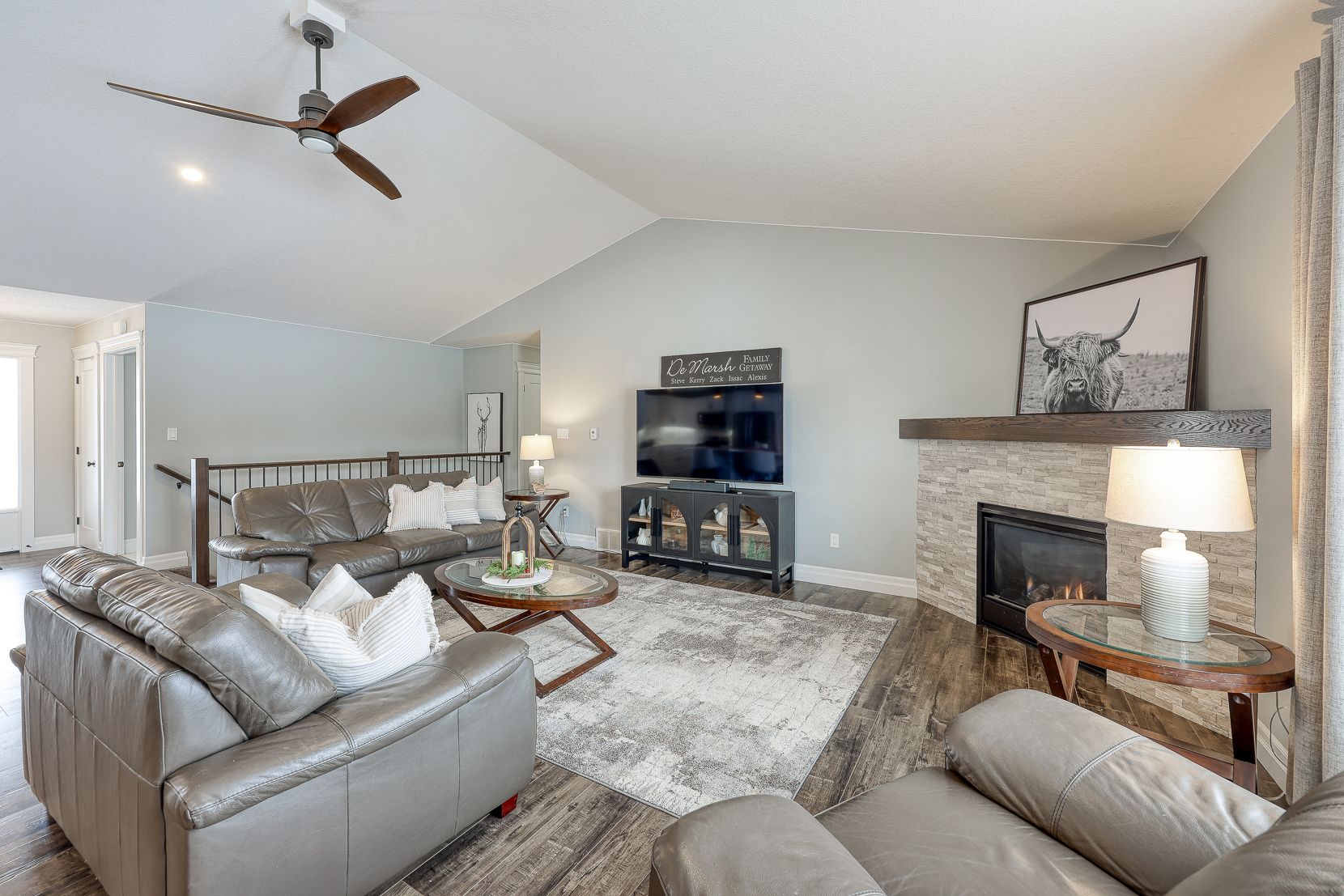 • Open-concept layout features cathedral ceilings and a cozy gas fireplace.