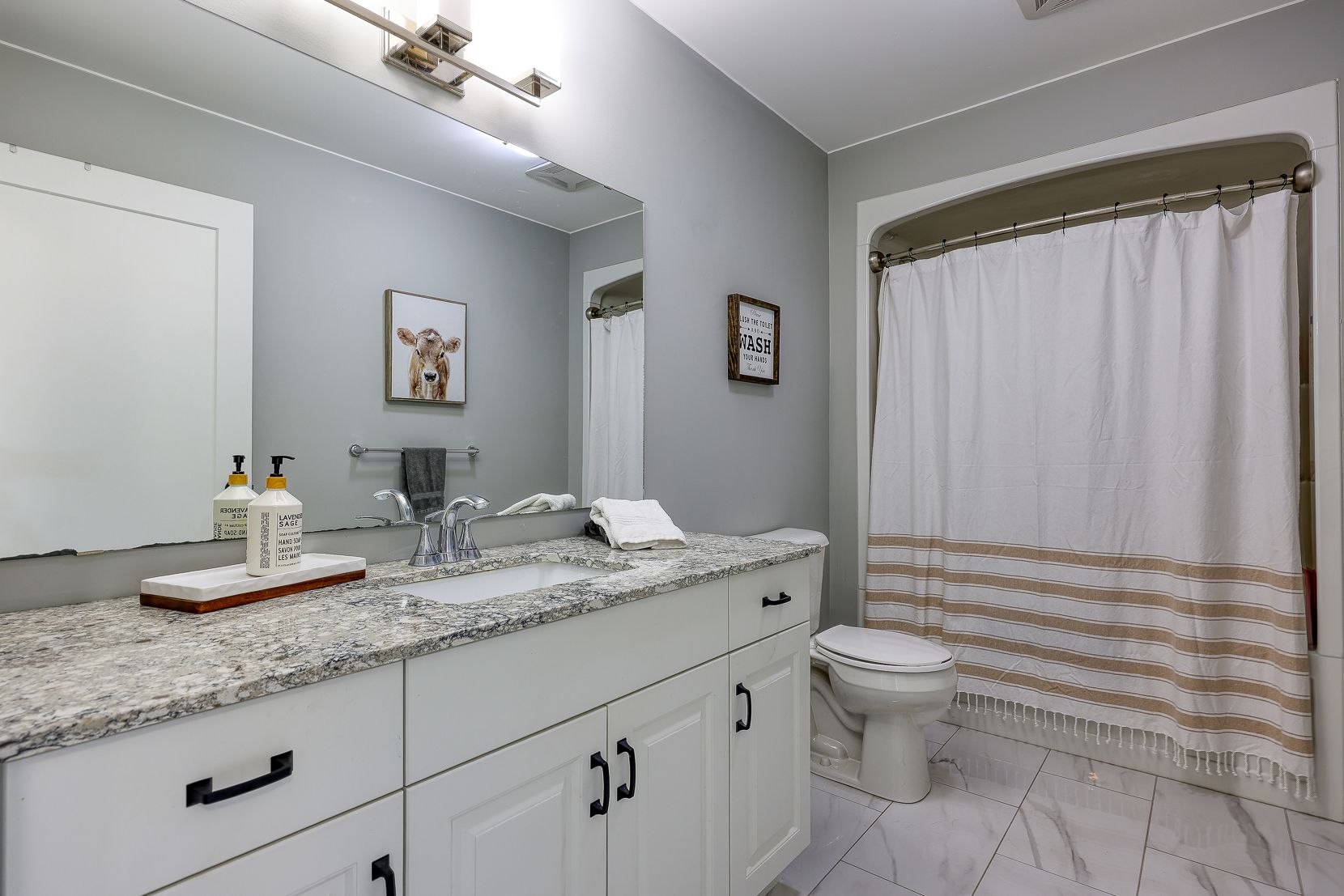 • Gourmet kitchen with quartz countertops and a large island for cooking.