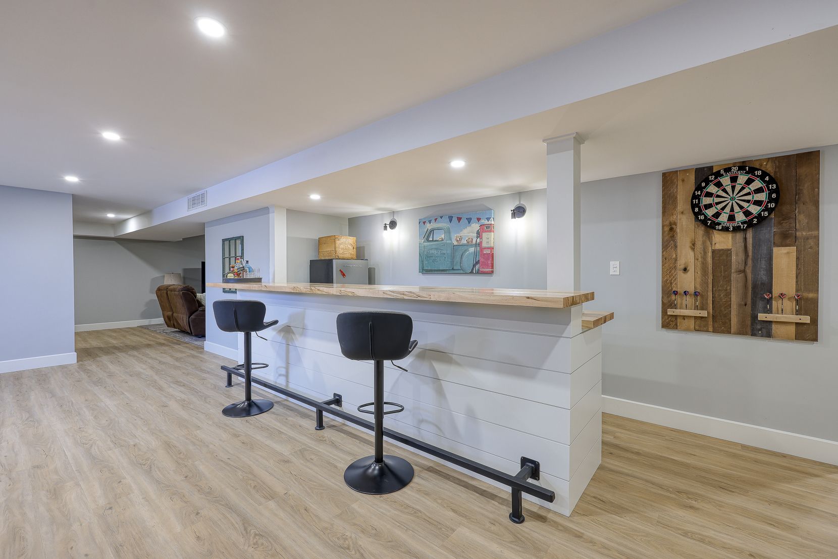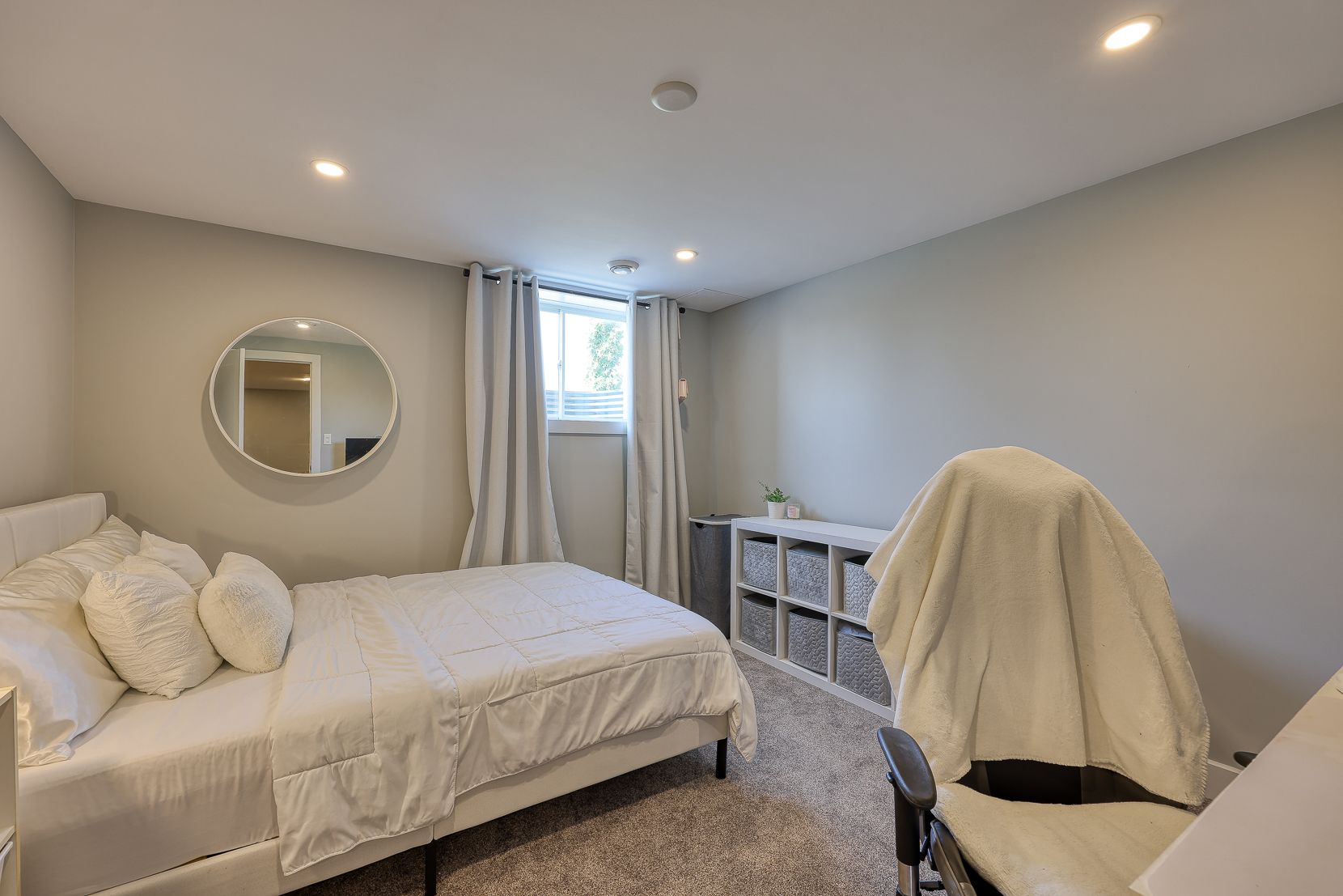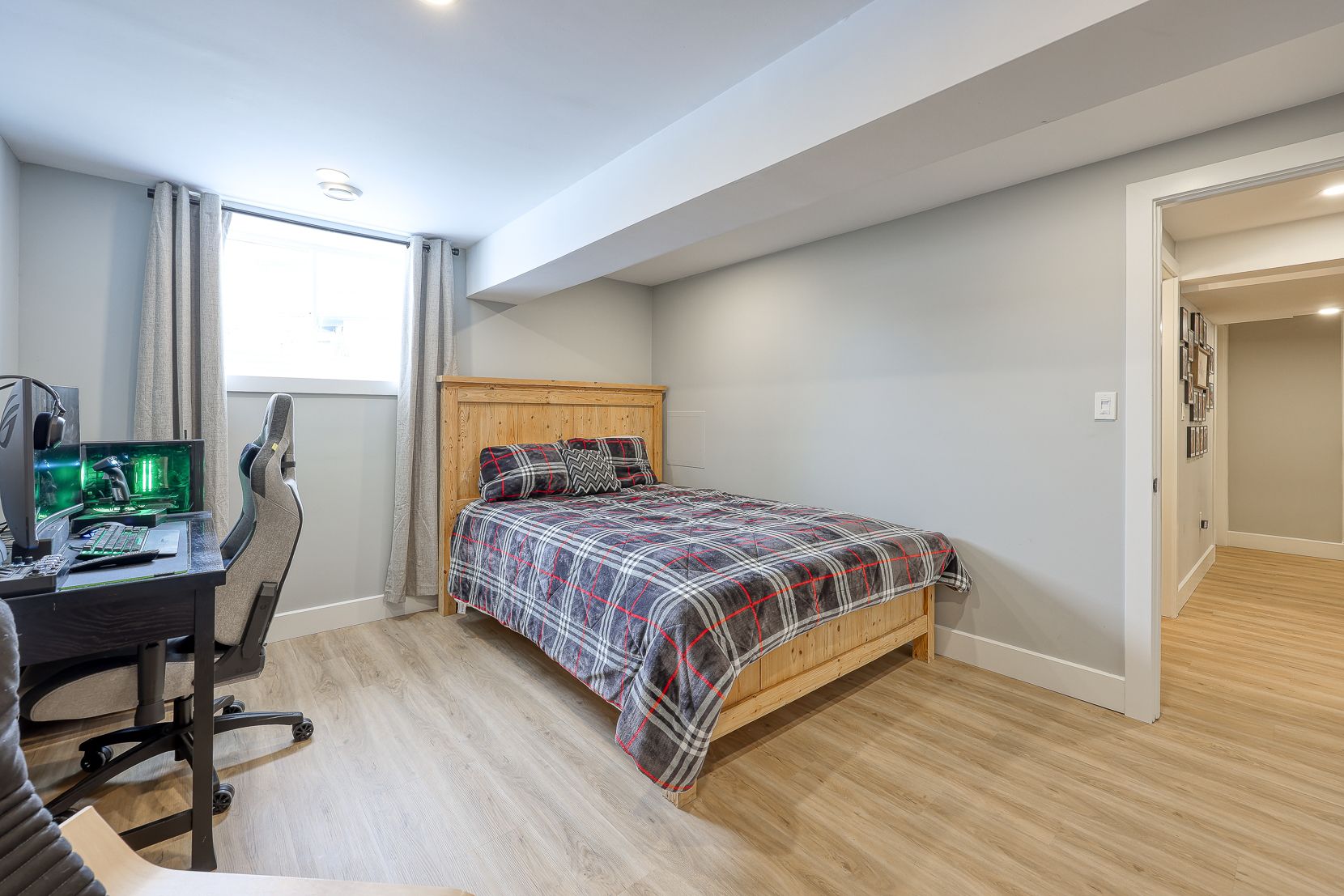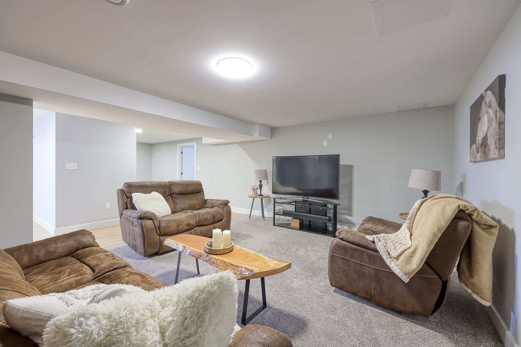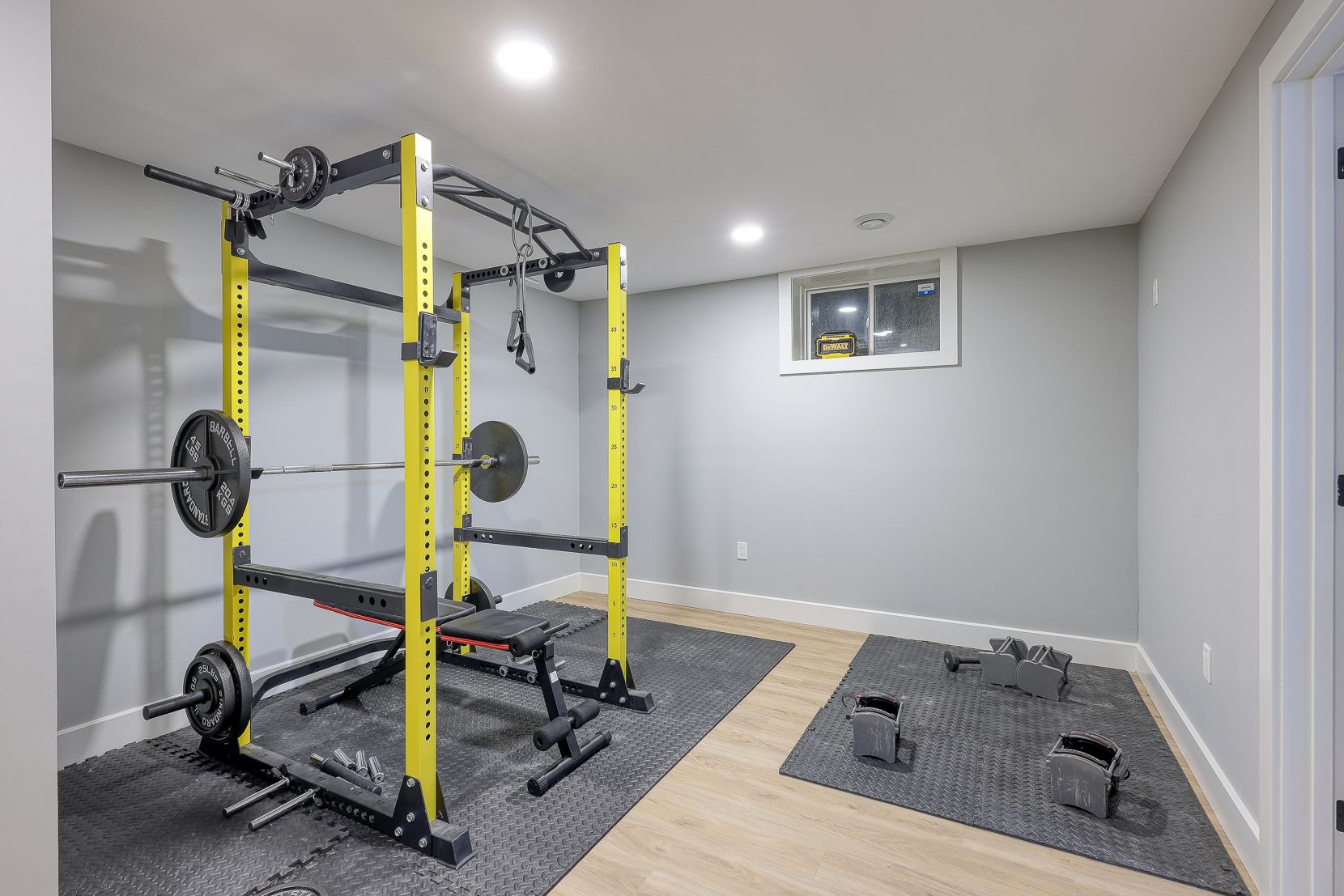 • Finished basement includes extra bedrooms, rec room, and gym space.