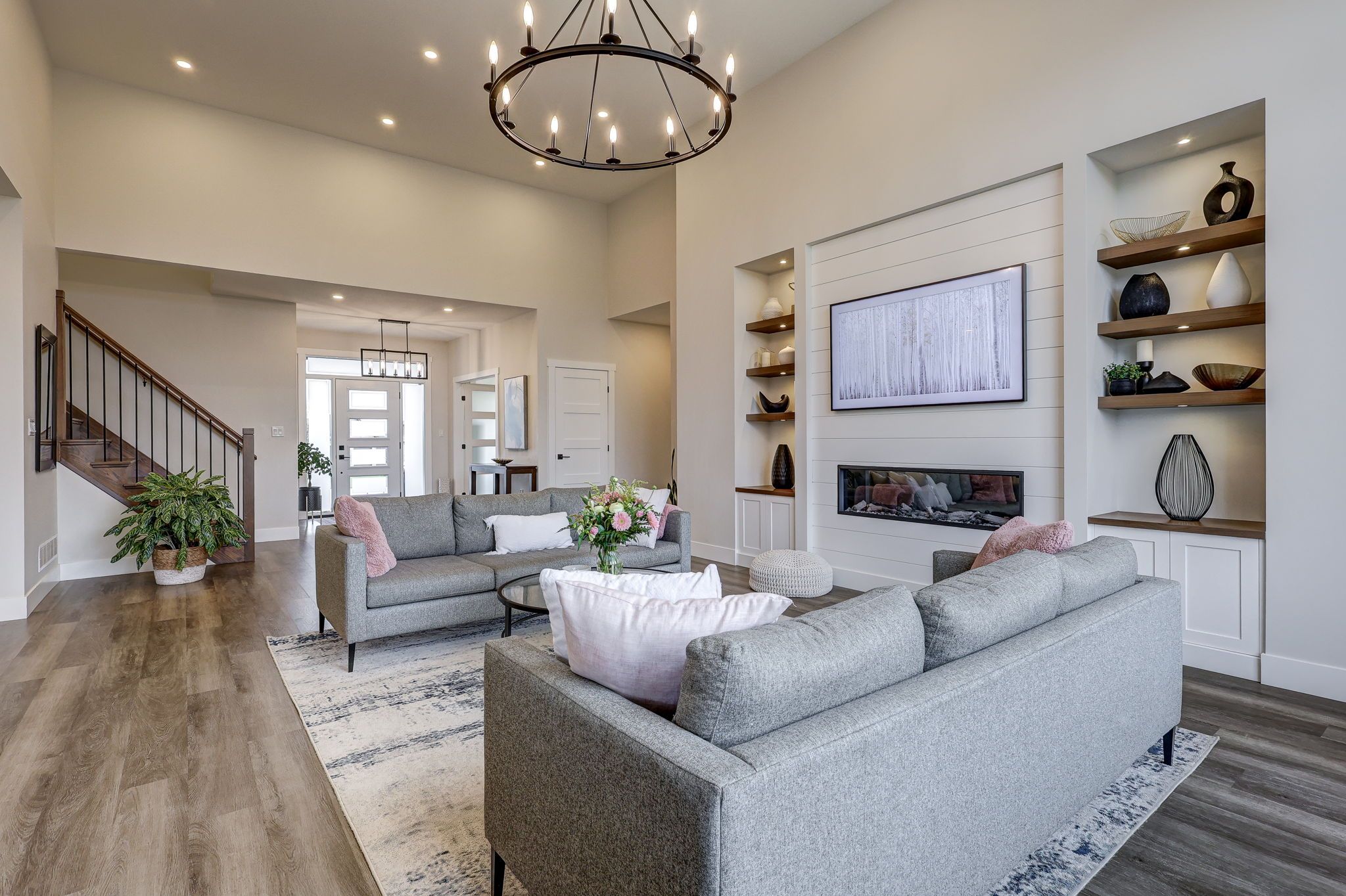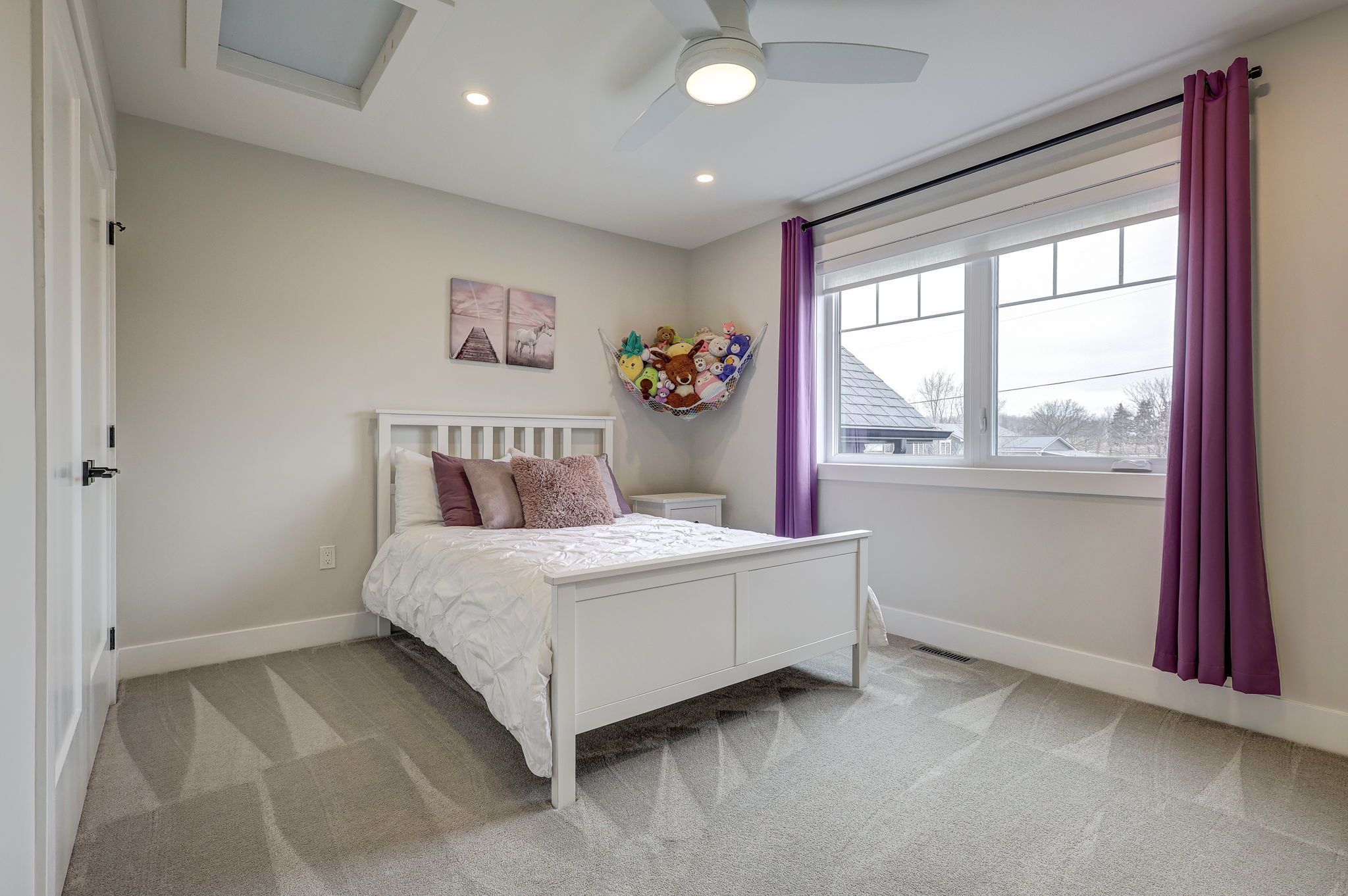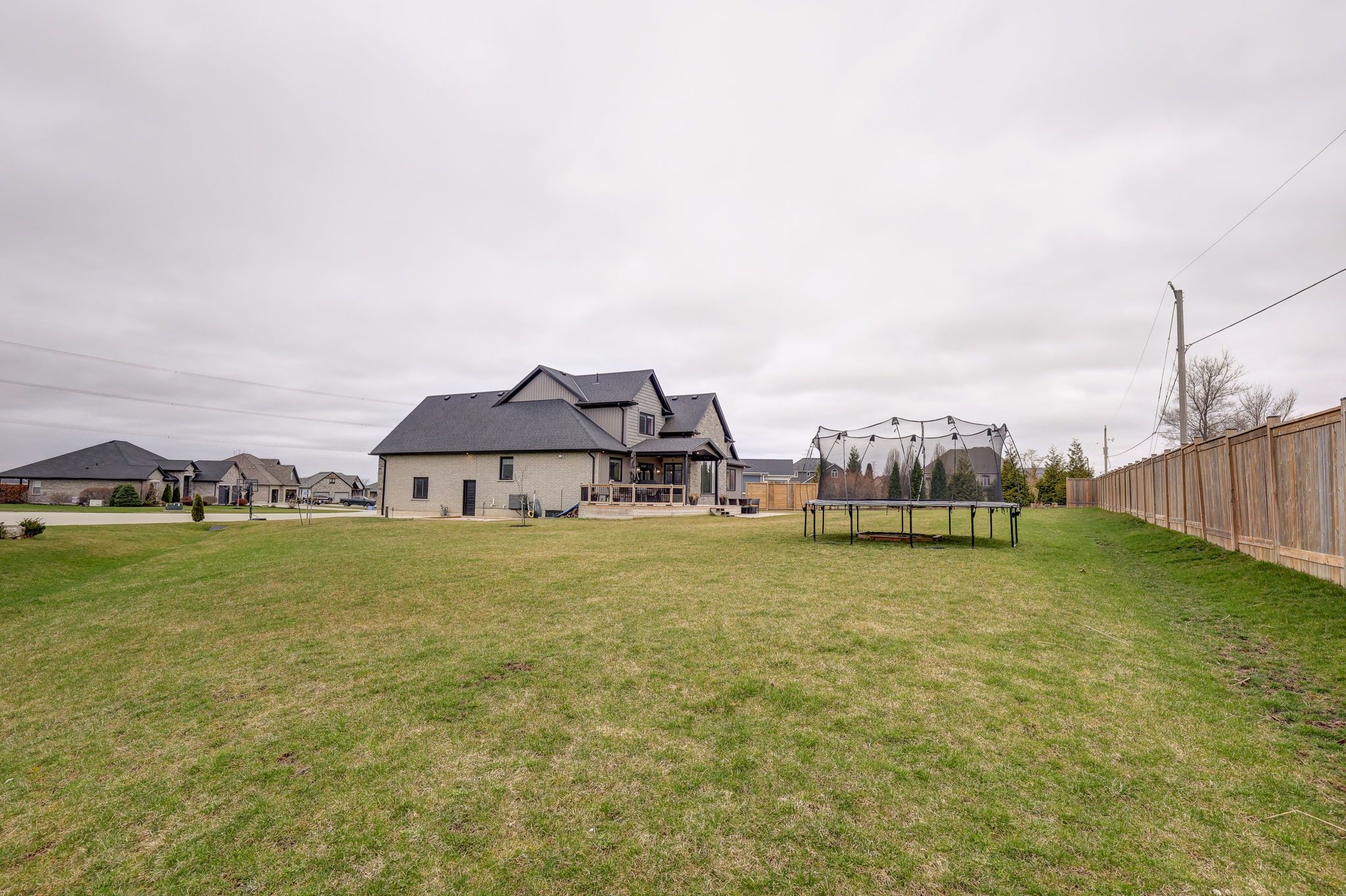Welcome to this stunning home nestled on a quiet cul-de-sac on a generous half acre pie-shaped lot, offering exceptional curb appeal with a double car garage, extended driveway, and a concrete pathway leading to a large covered front porch. Inside, a spacious foyer opens to a breathtaking living room with soaring 14-foot ceilings, a cozy fireplace, and an oversized rear window overlooking the expansive backyard. The chef's kitchen impresses with quartz countertops, an oversized island, walk-in pantry, and abundant cabinetry, while the main floor also features a convenient laundry room with custom cabinetry and sink. The primary suite is a private retreat with a luxurious ensuite including a soaker tub, tiled shower, water closet, and a walk-in closet with custom built-ins. Upstairs offers three generously sized bedrooms anda well-appointed 5-piece bath, while the large unfinished basement with high ceilings provides endless potential for additional living space. Outside, enjoy a beautifully designed yard complete with a covered deck, stamped concrete fire pit area with natural gas hookup, outdoor dining space, and a side yard already prepped for a future garden shed. This home is just 5 years young and better than new with the upgrades inside and out.