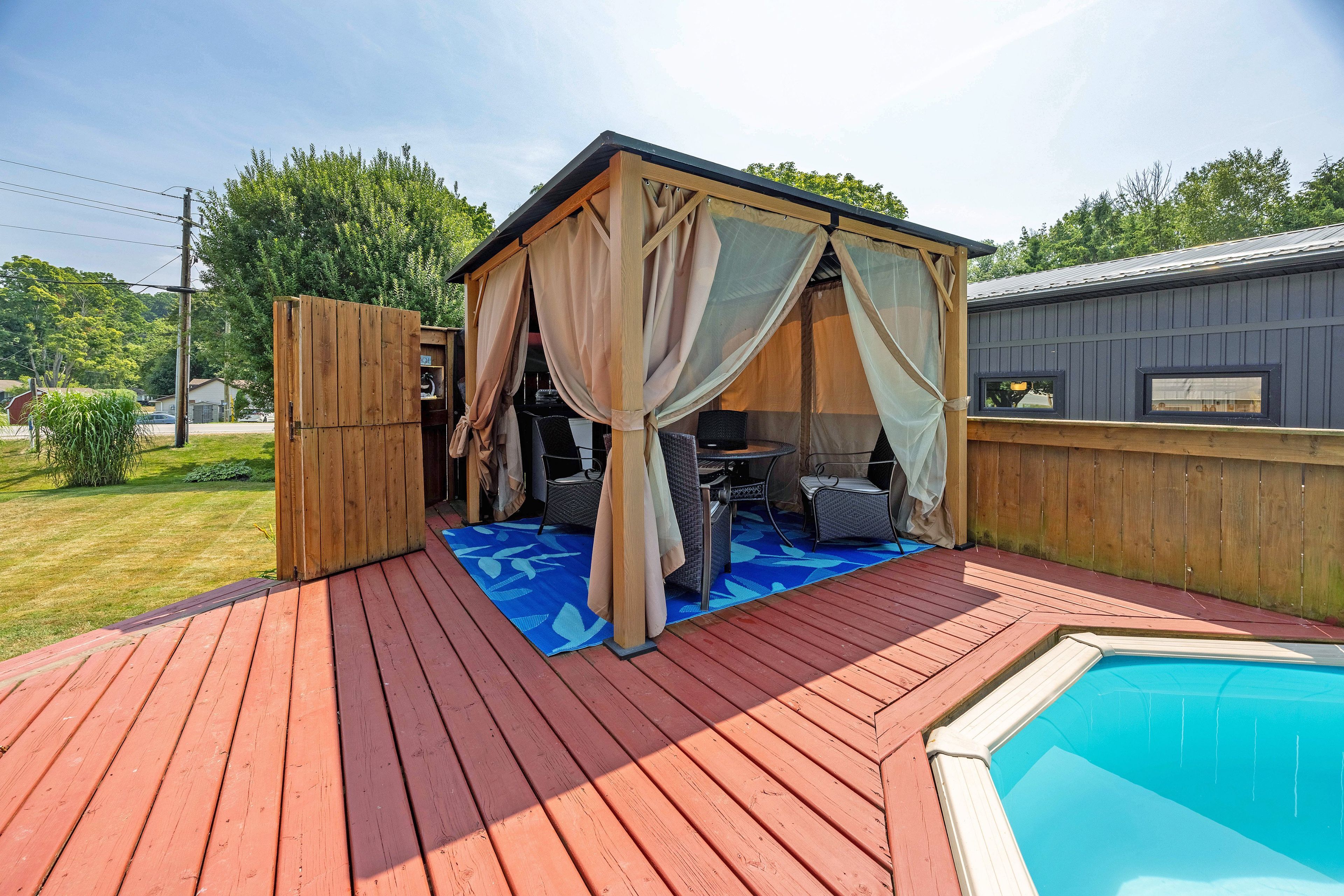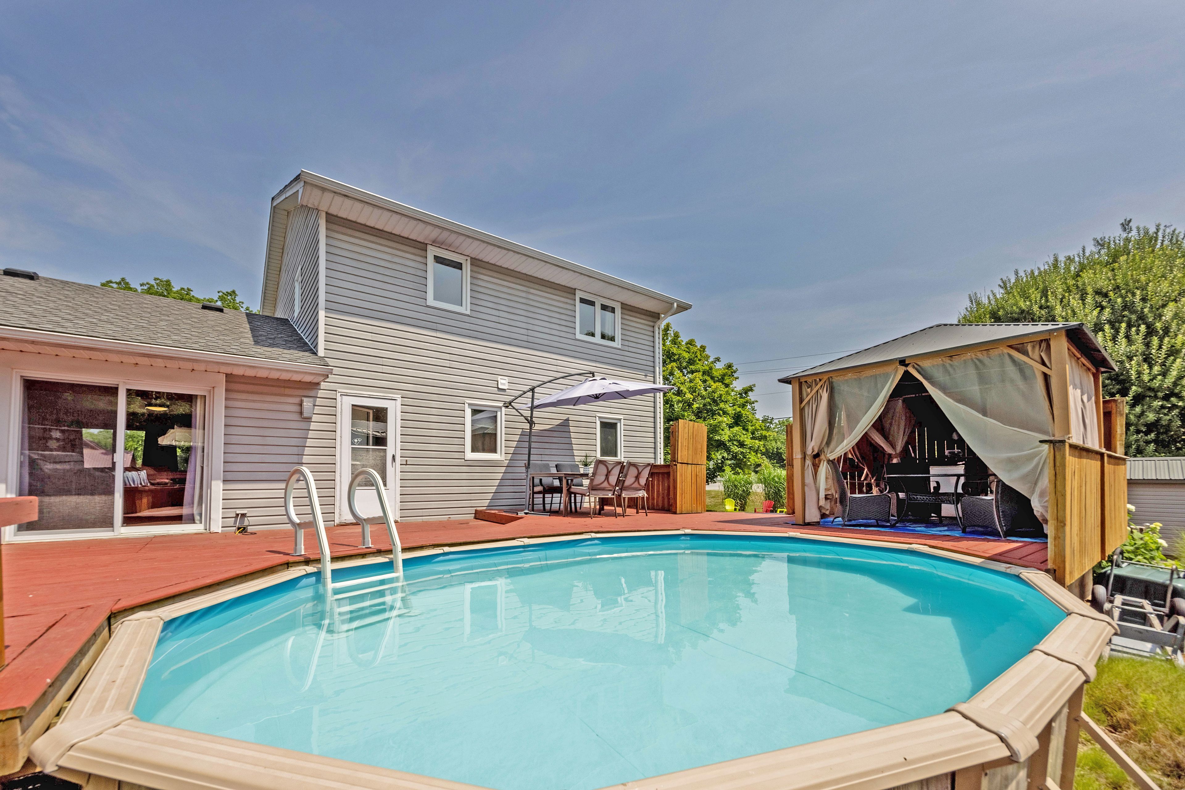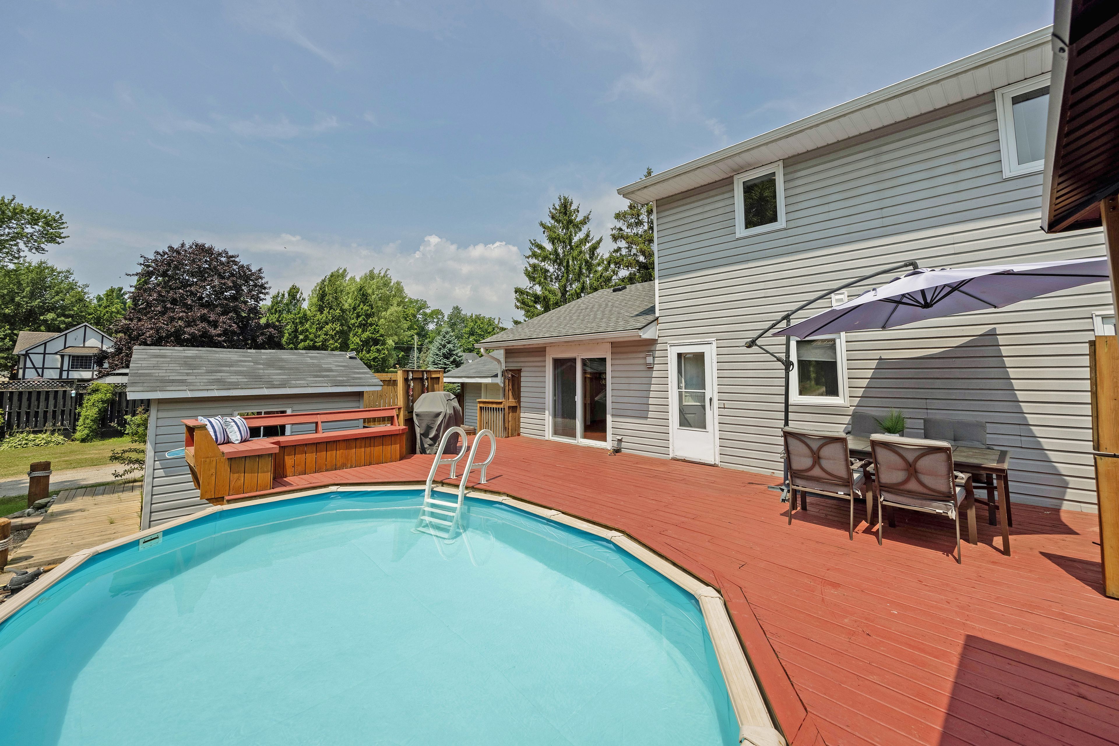 Welcome to your perfect beach-town escape! Nestled in the heart of the charming lakeside community of port bruce, this beautifully maintained home offers the ideal blend of laid-back coastal living and modern comfort. Set on a lovely corner, landscaped lot, the property features an above-ground pool, hot tub, and three versatile sheds, perfect for storing your beach and backyard essentials. Enjoy lazy mornings on the welcoming front porch or host summer bbqs in your private outdoor oasis. Inside, you'll find a spacious, light-filled layout with a large eat-in kitchen boasting granite countertops and included appliances. The main level features a generous living room, a flexible office/dining space, and a convenient main-floor bedroom with optional laundry hookups (currently laundry in the basement). Upstairs, discover two more large bedrooms, including a primary suite with walk-out access to a private upper balcony, perfect to enjoy lovely views catfish creek. Recent updates include newer shingles and gutters with gutter guards, giving peace of mind for years to come. With plenty of parking and just a short stroll to the beach, marina, restaurants, renowned fishing spots and kayaking, this home is perfect as a full-time residence or weekend getaway. Plus, with easy access to both port stanley and aylmer, you're never far from local shops, events, and amenities. Experience the relaxed, welcoming vibe of port bruce where every day feels like a vacation! Welcome home!