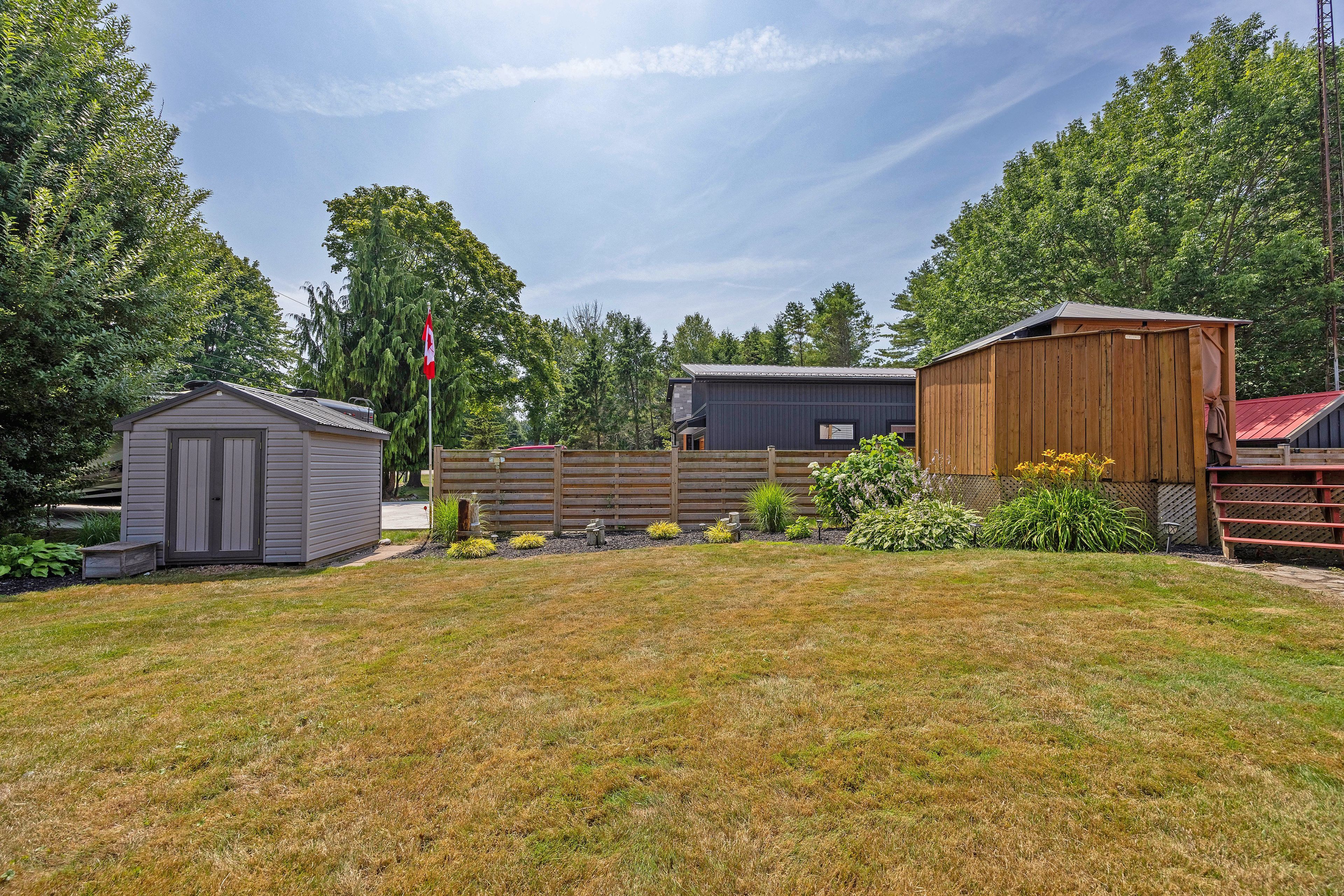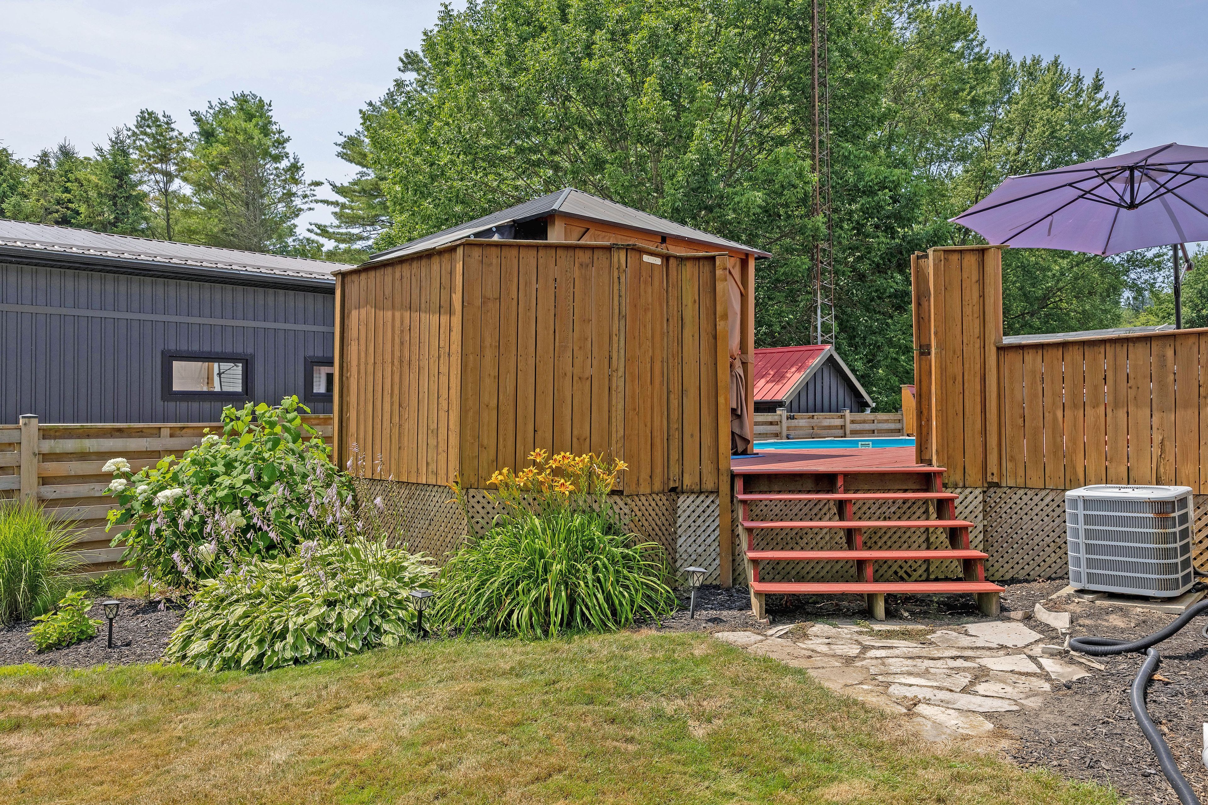 • Features above-ground pool, hot tub, and three storage sheds.