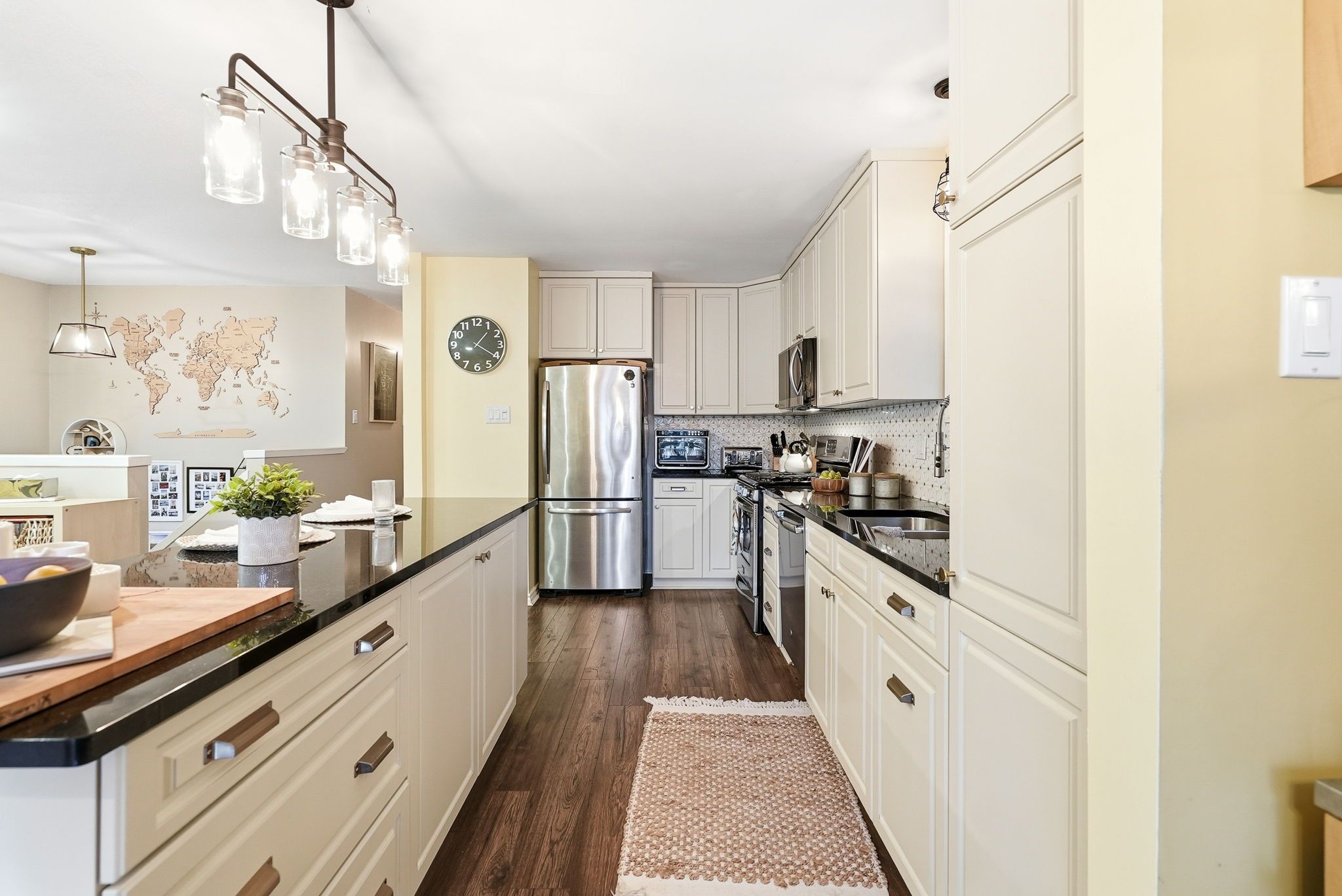• Kitchen features granite countertops, gas stove, and ample cabinetry.